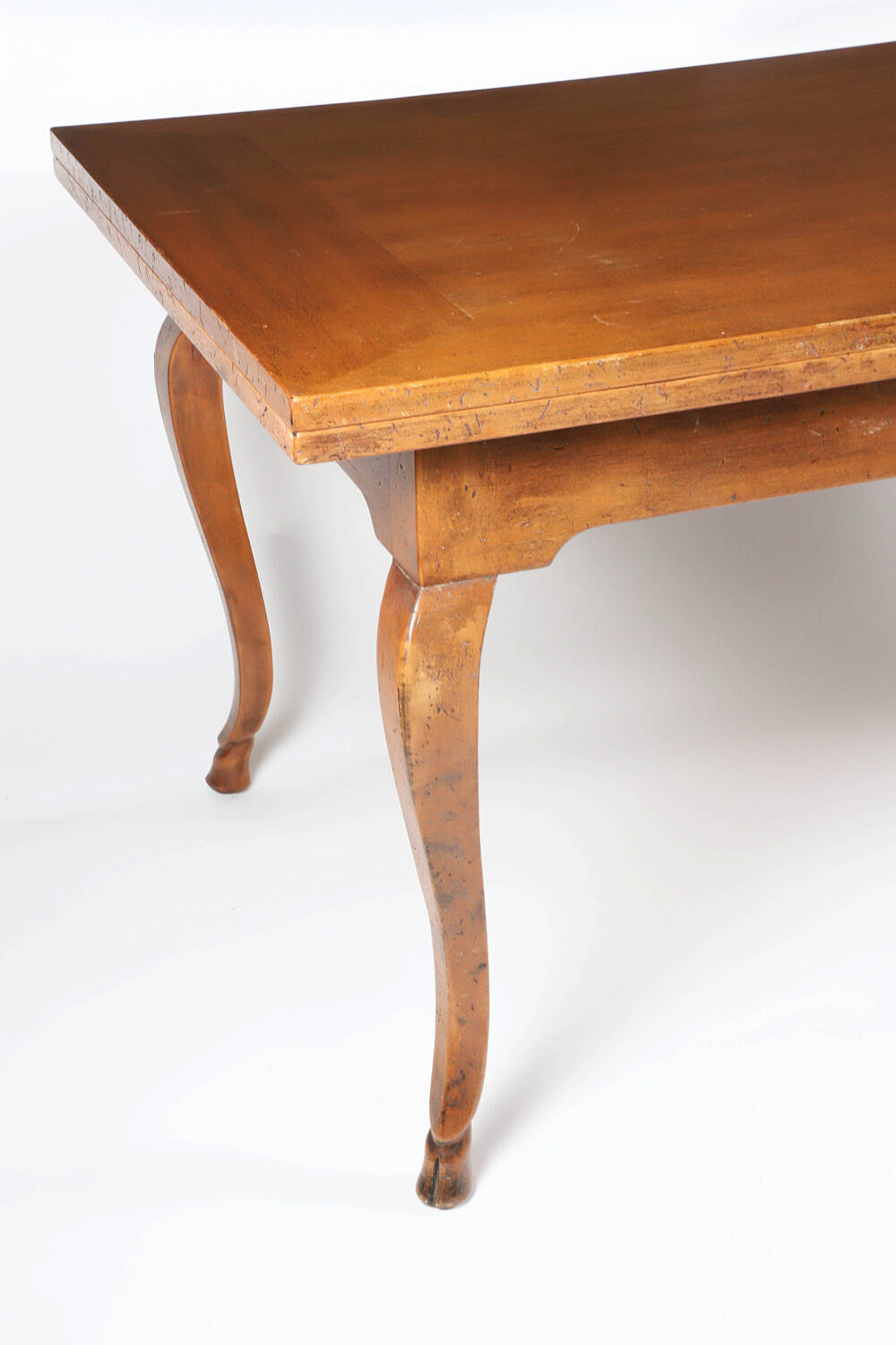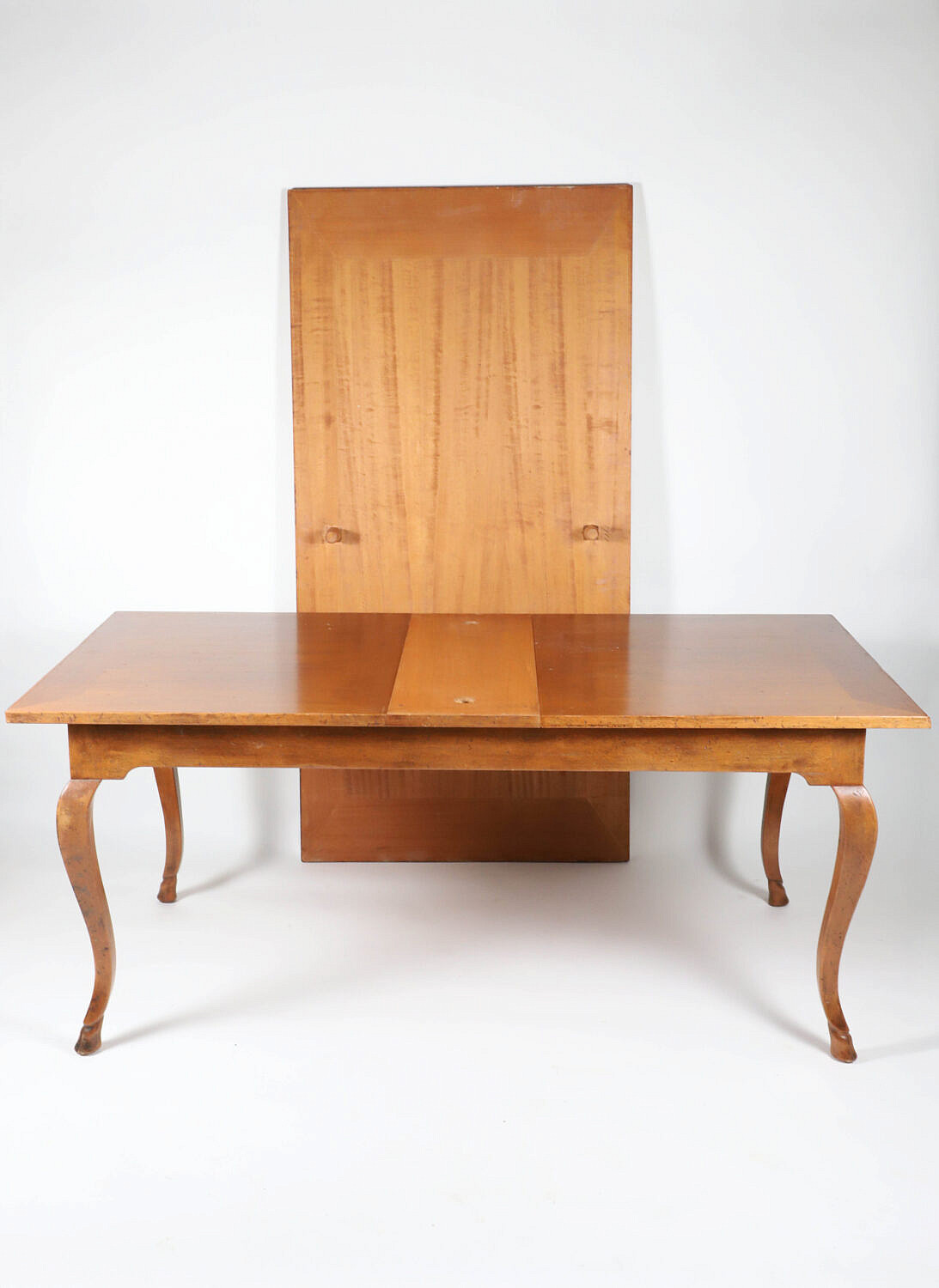 French Provincial Style Dining Table, with extension leaves at each end, all four legs with carved hoof feet