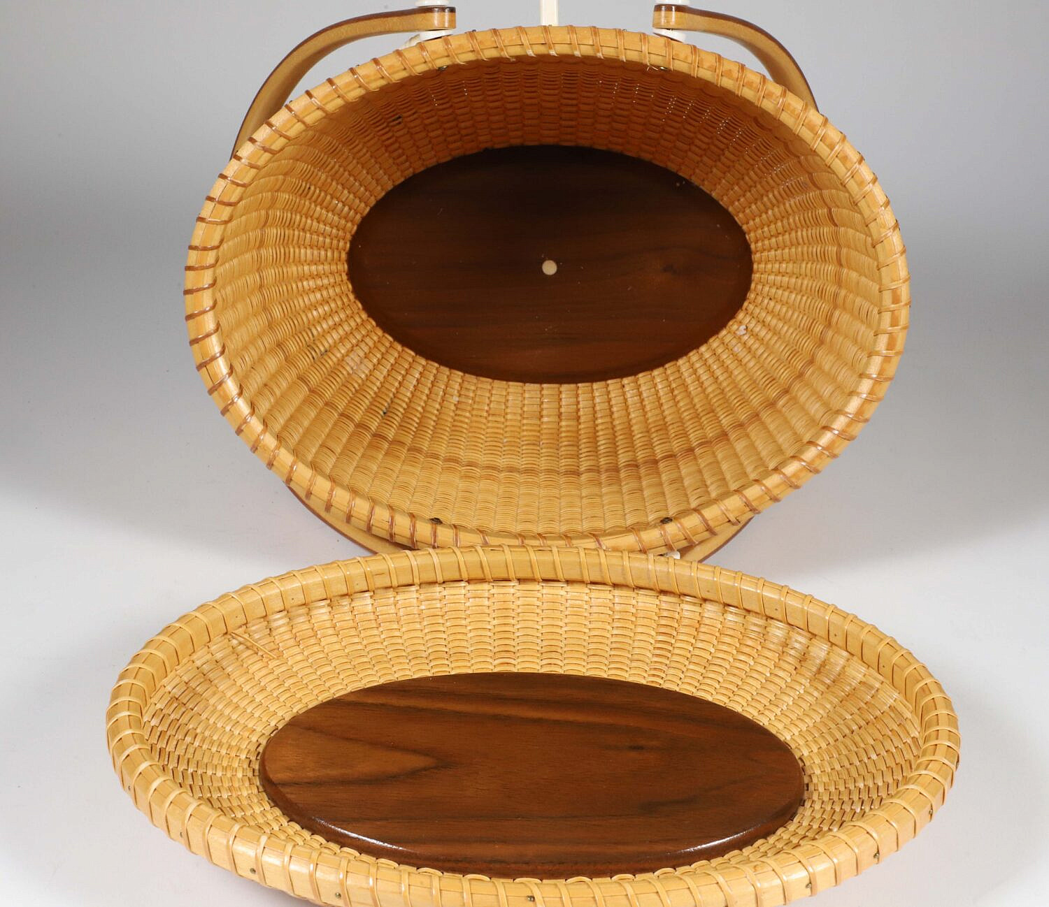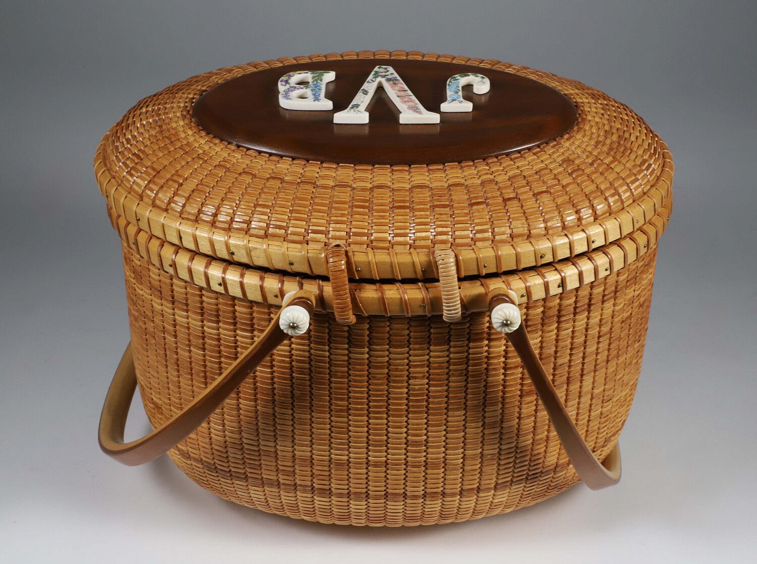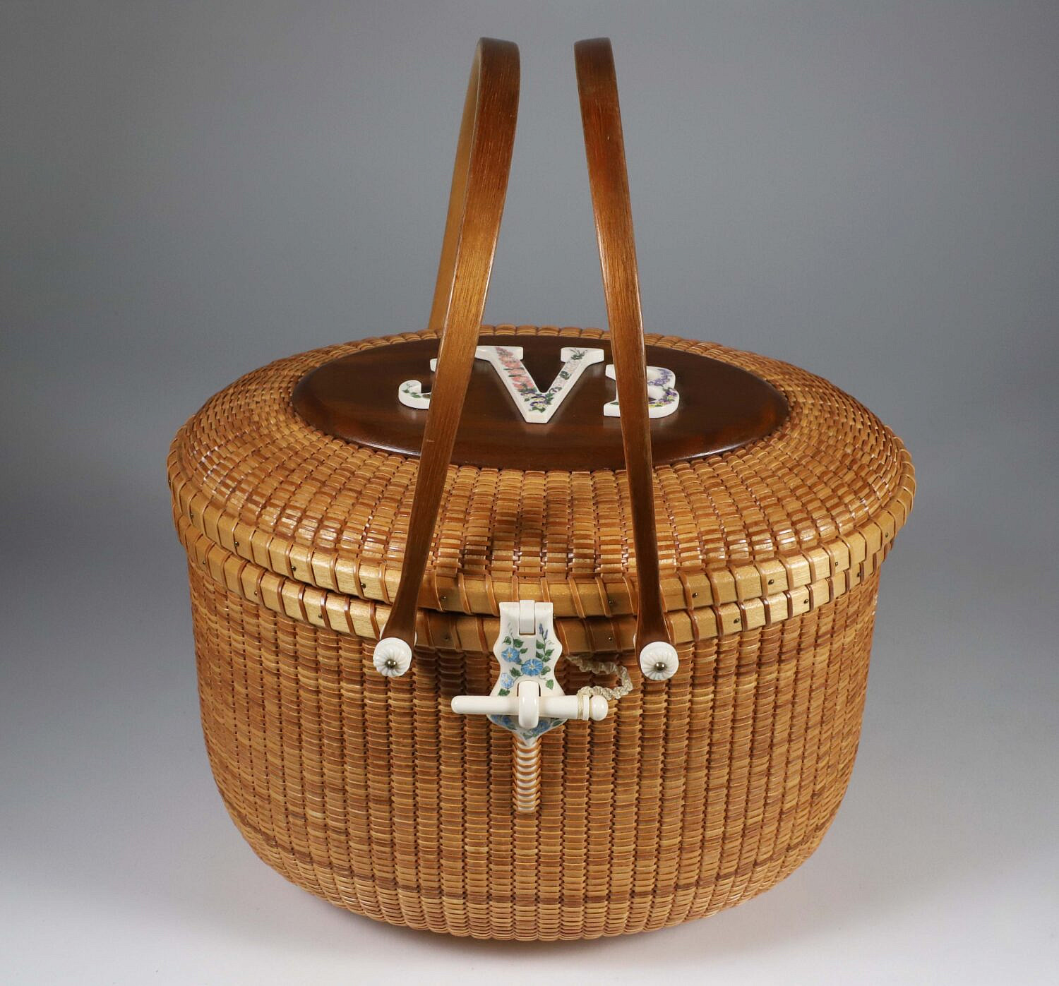 Jean M. Valerio Woven Double Swing Handle Nantucket Friendship Basket, circa 2010, with polychromed scrimshaw latch and initials J.V.B., weaver logo on base