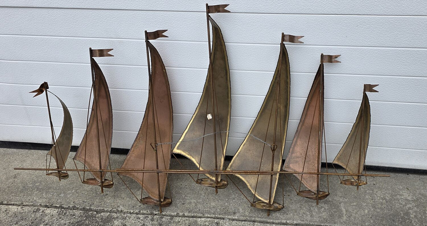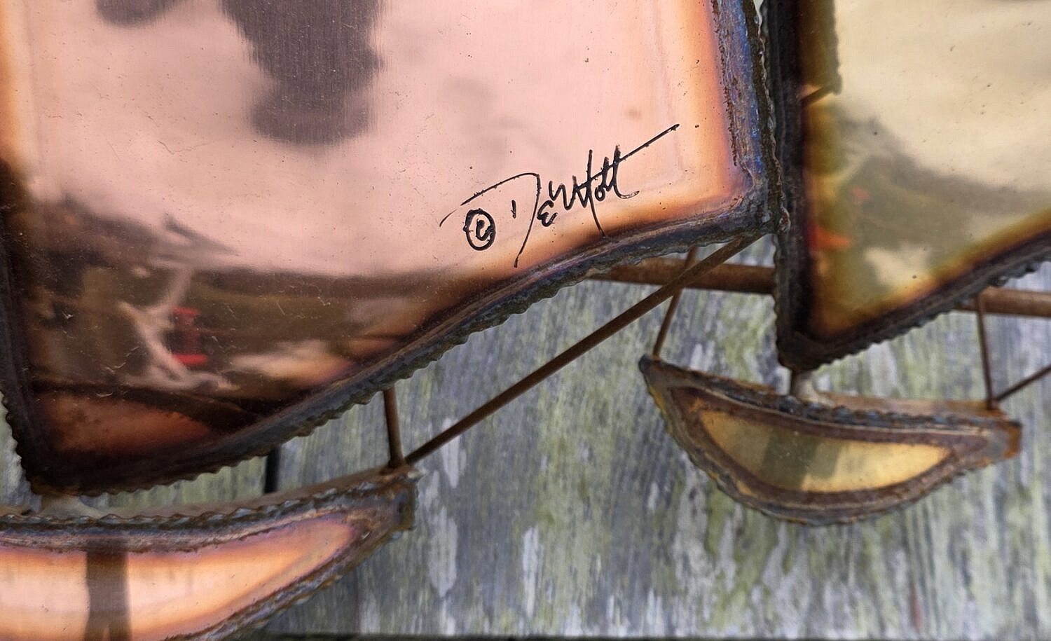 Large Vintage Brass and Copper Demott Sailboats Hanging Art Wall Sculpture, signed lower right