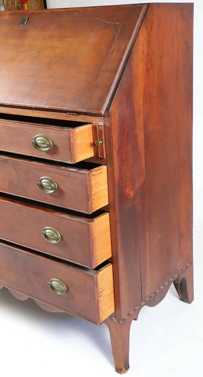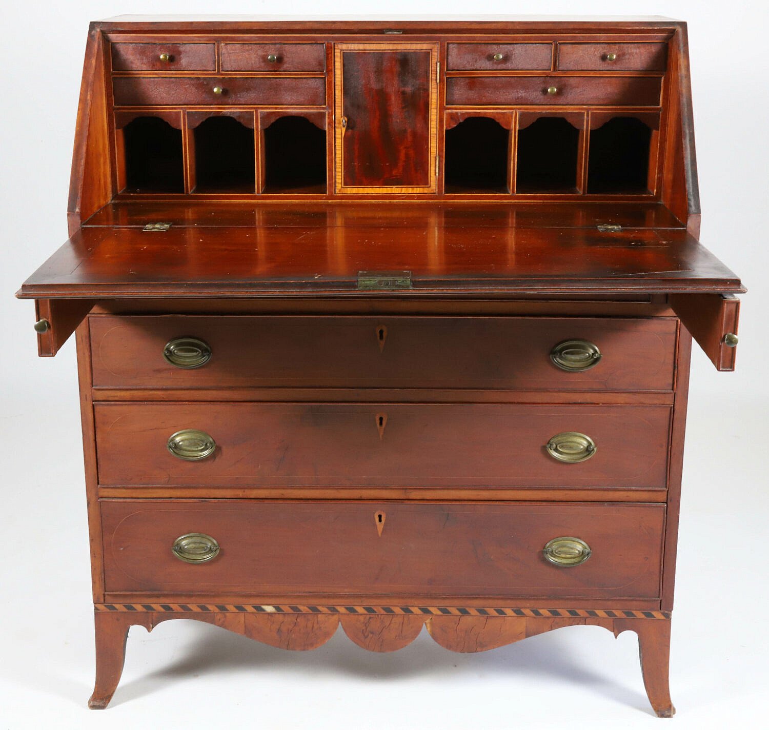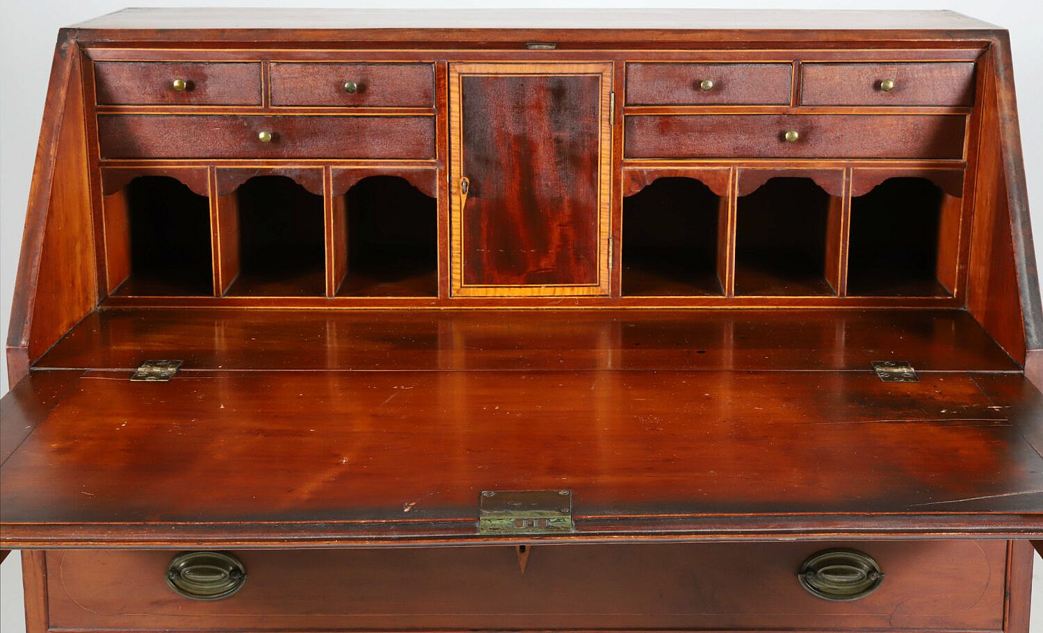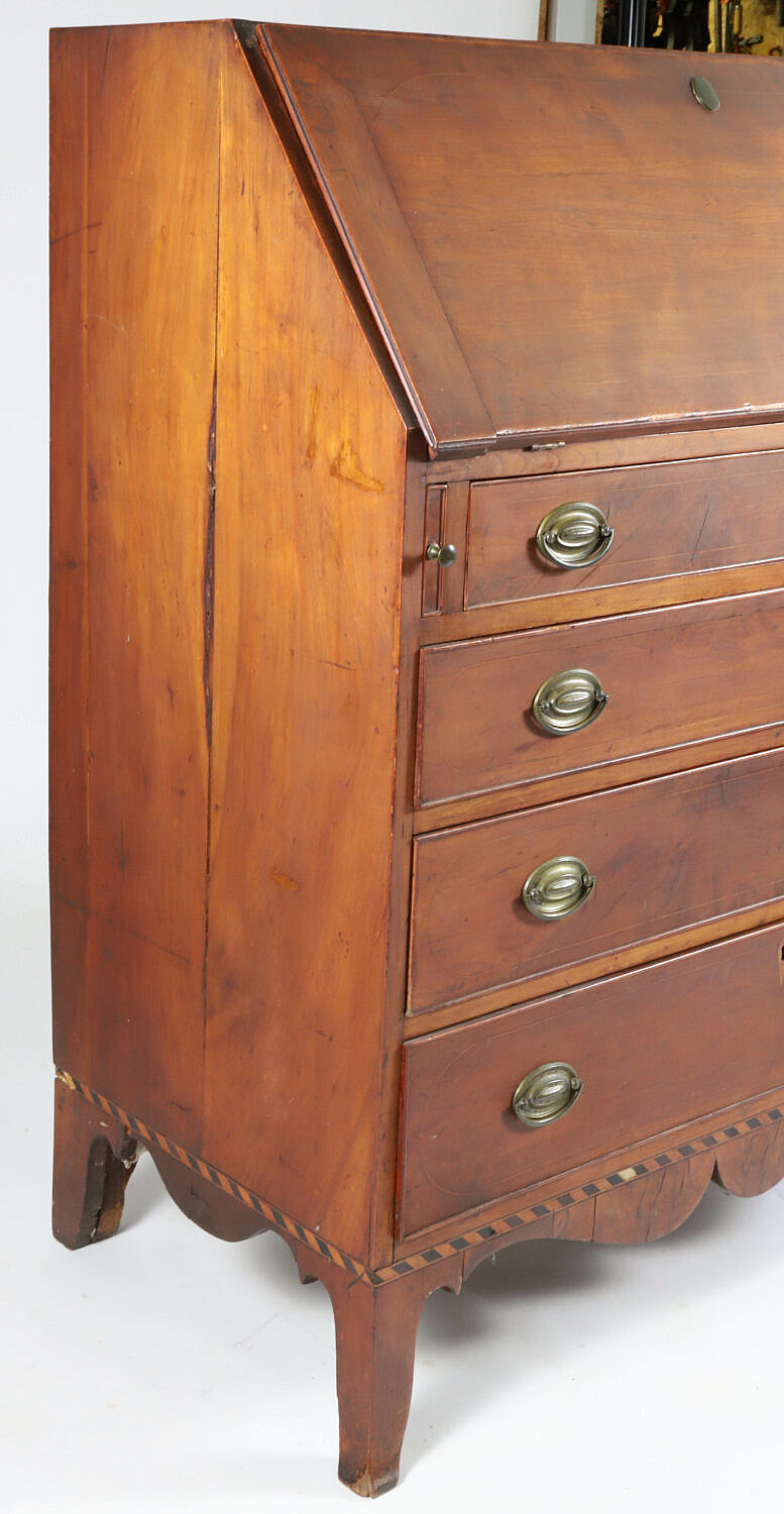 New England Hepplewhite Cherry Inlaid Slant Front Desk, 18th Century, the slant lid opens over lopers with cross-banded fitted interior with six cubby holes and six drawers and central door, four inlaid key-hole escutcheons, brass hardware, French bracket feet and shaped apron