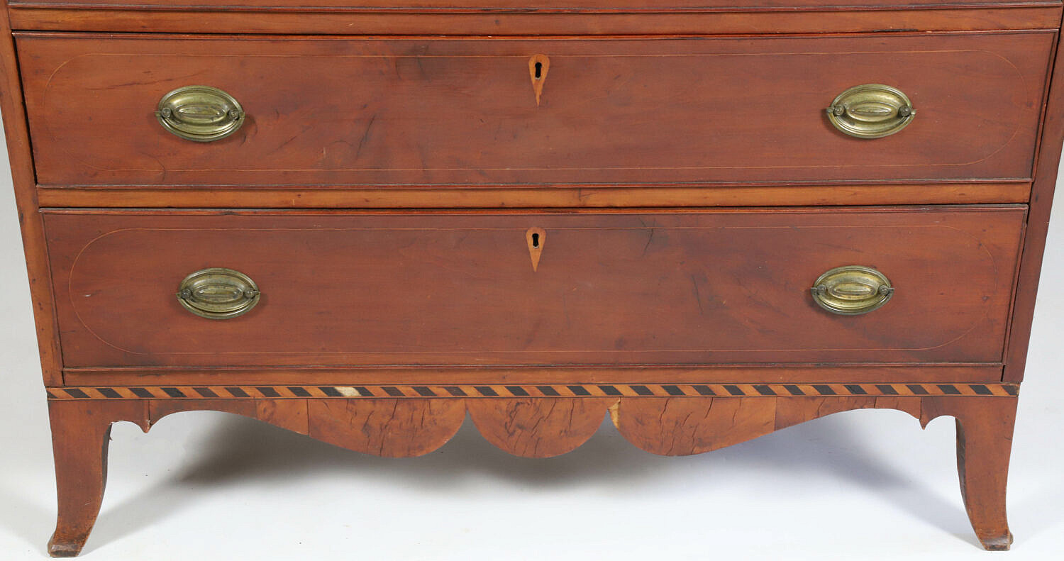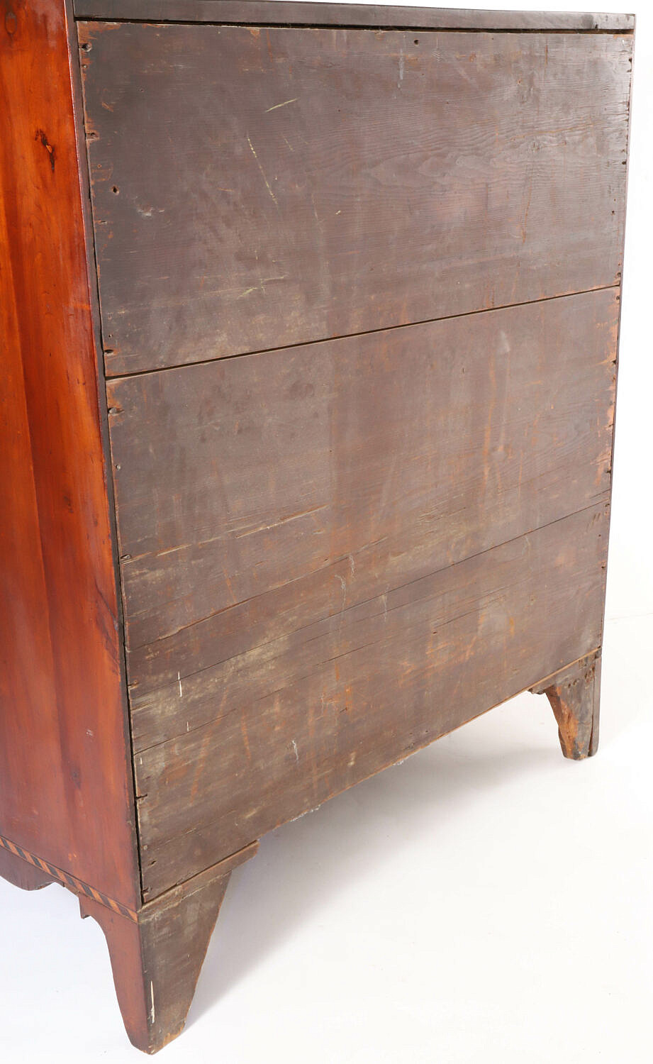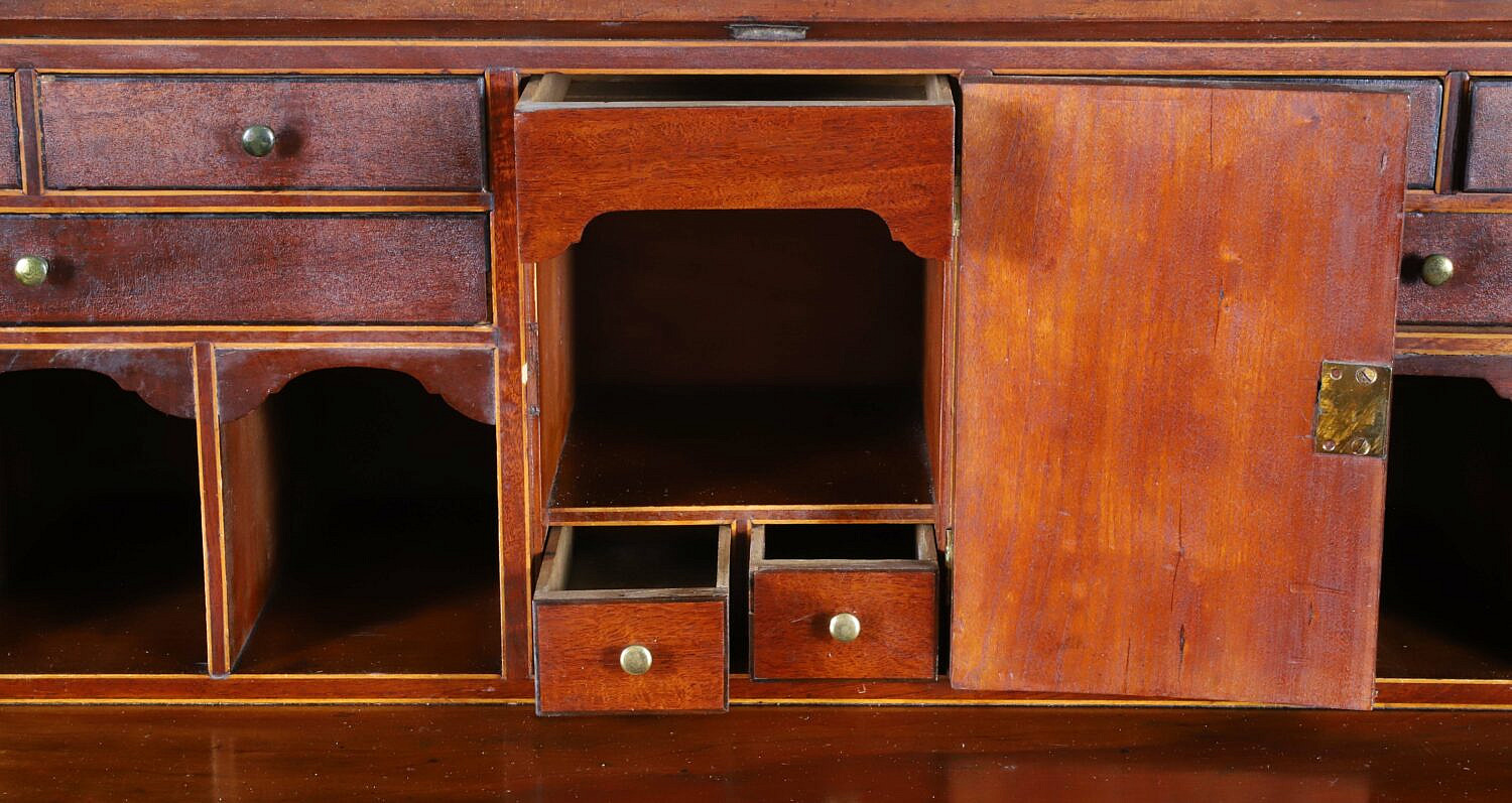 New England Hepplewhite Cherry Inlaid Slant Front Desk, 18th Century, the slant lid opens over lopers with cross-banded fitted interior with six cubby holes and six drawers and central door, four inlaid key-hole escutcheons, brass hardware, French bracket feet and shaped apron