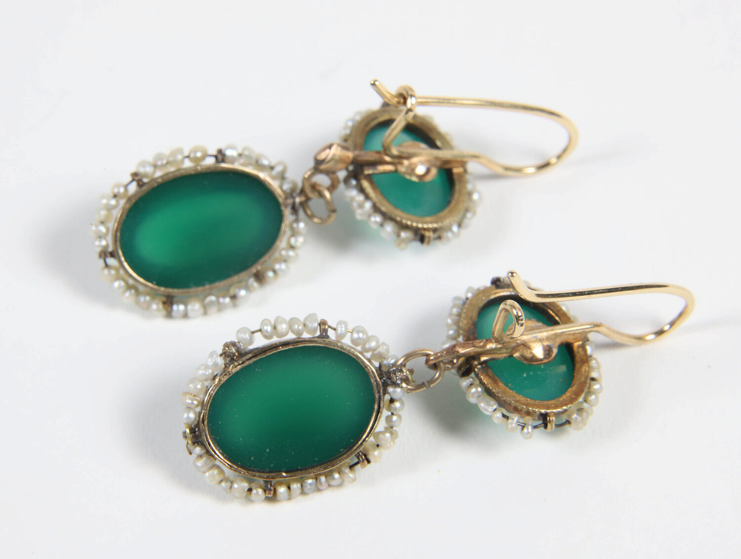 Pair of Antique Seed Pearl and Green Cabochon Stones Dangle Earrings