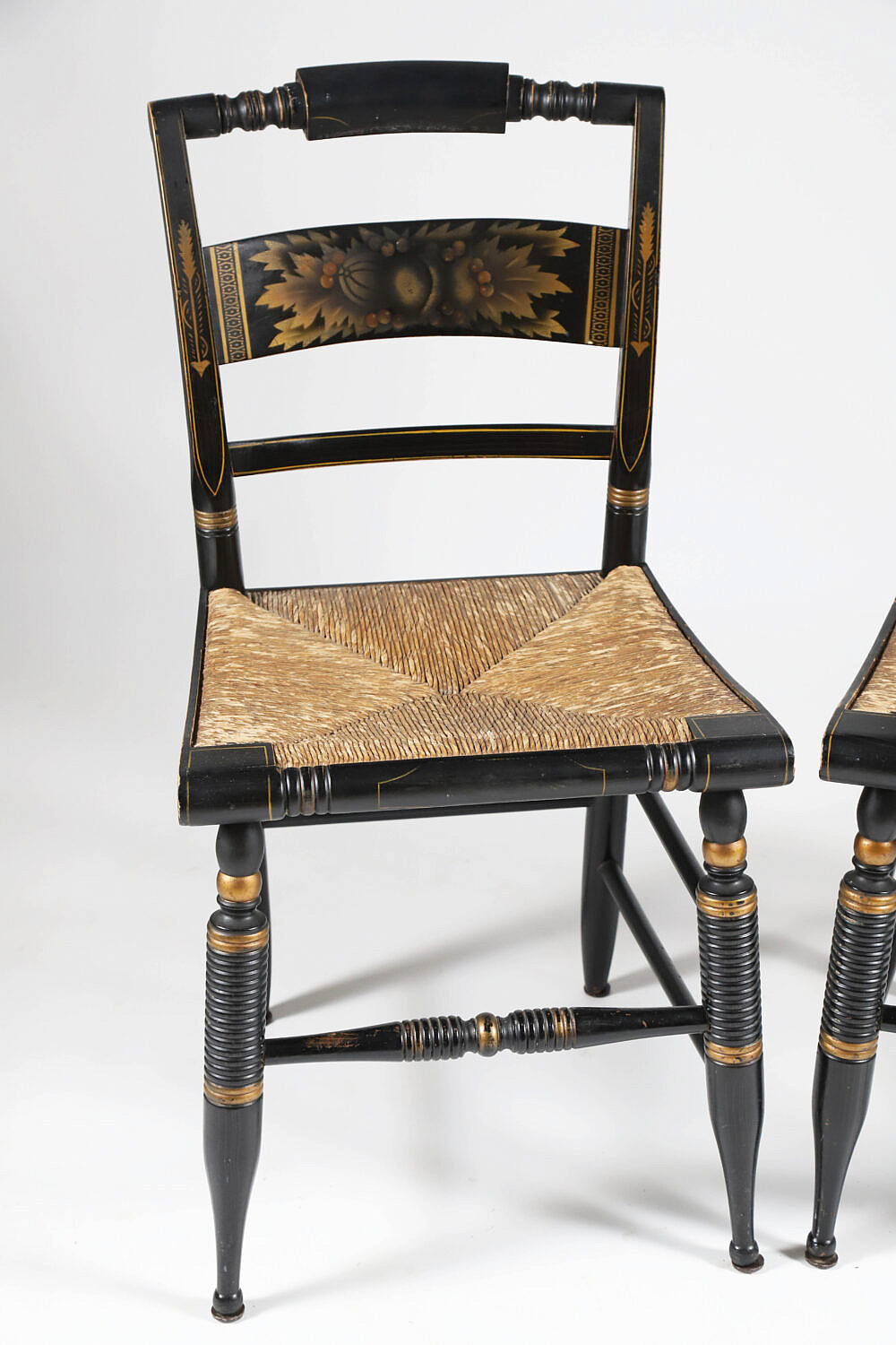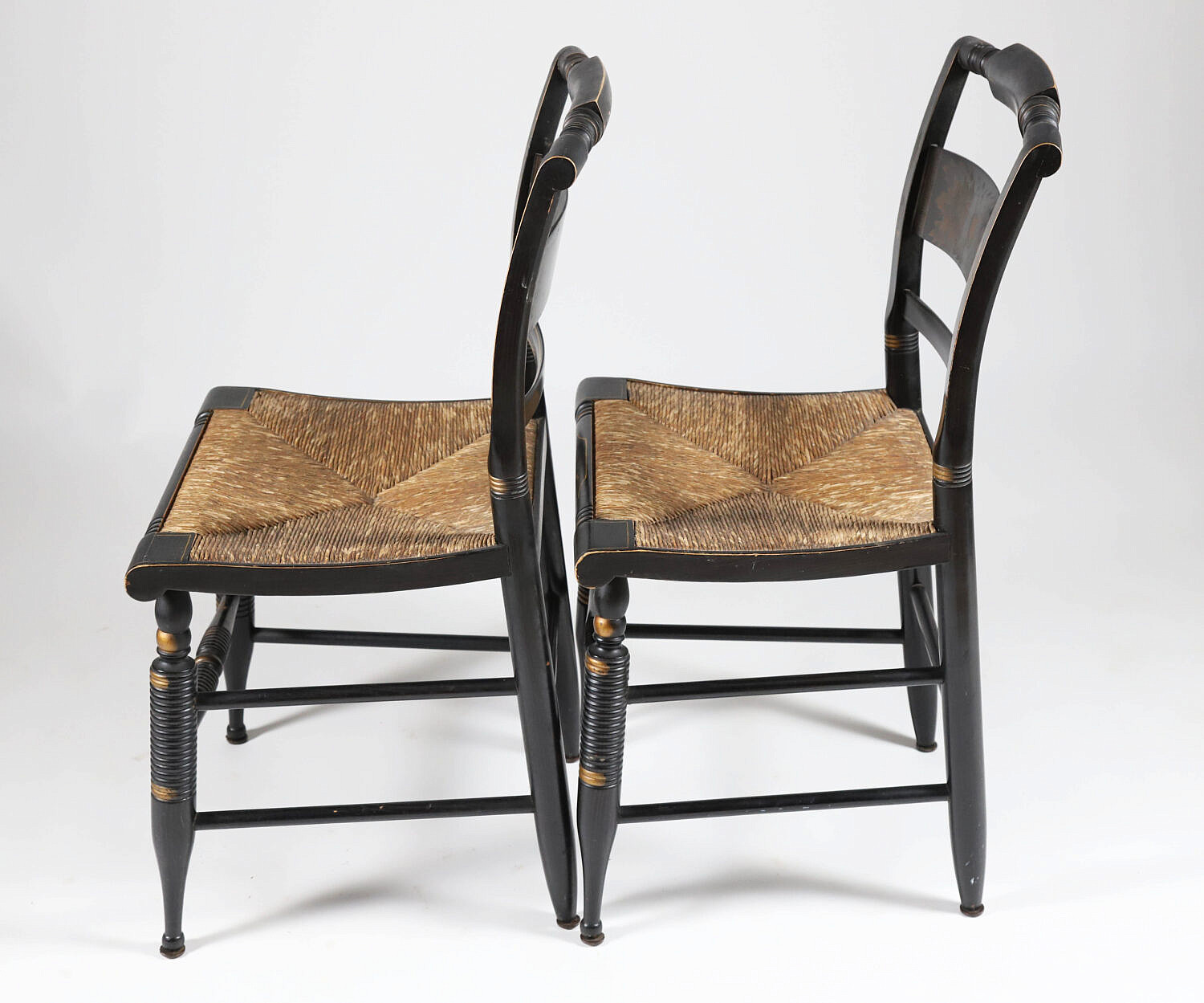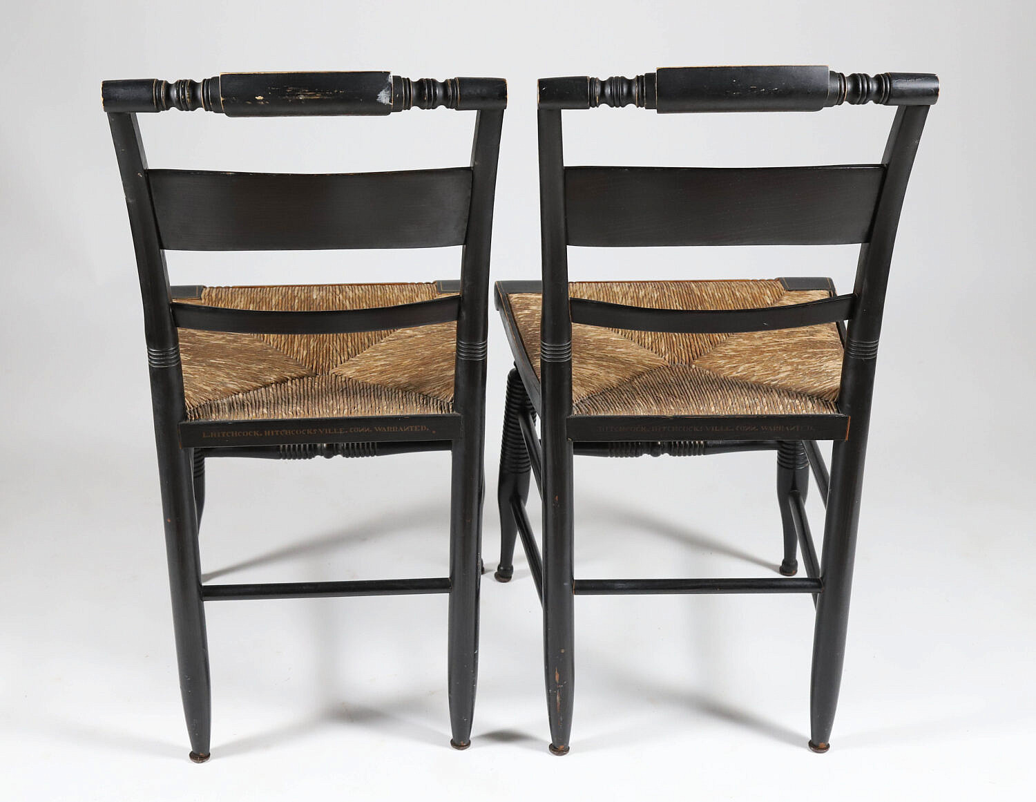 Pair of Signed Black Stencilled Hitchcock Rush Seat Side Chairs