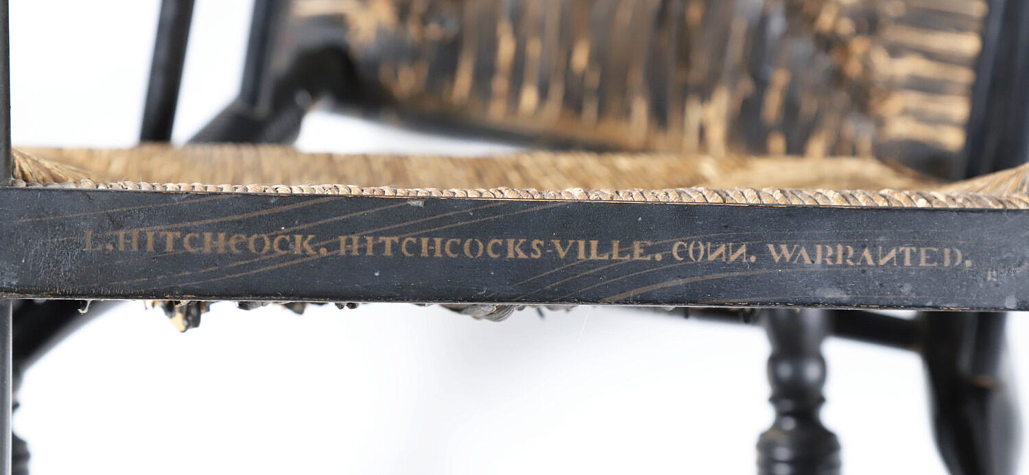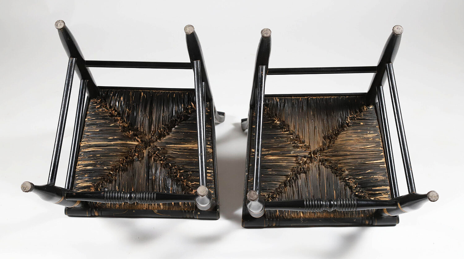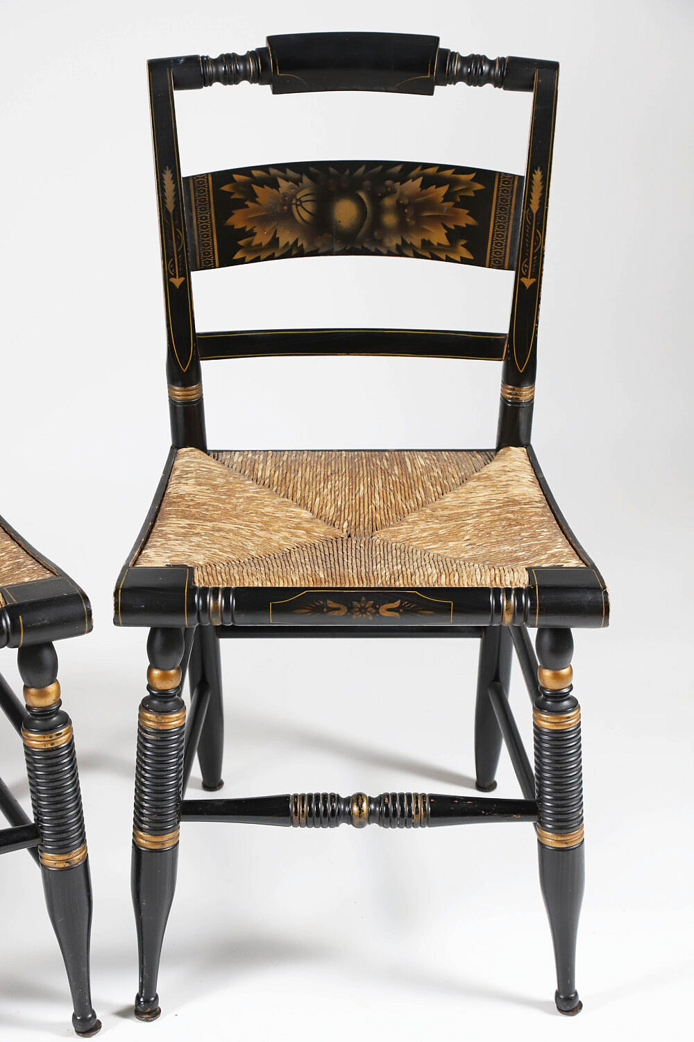 Pair of Signed Black Stencilled Hitchcock Rush Seat Side Chairs