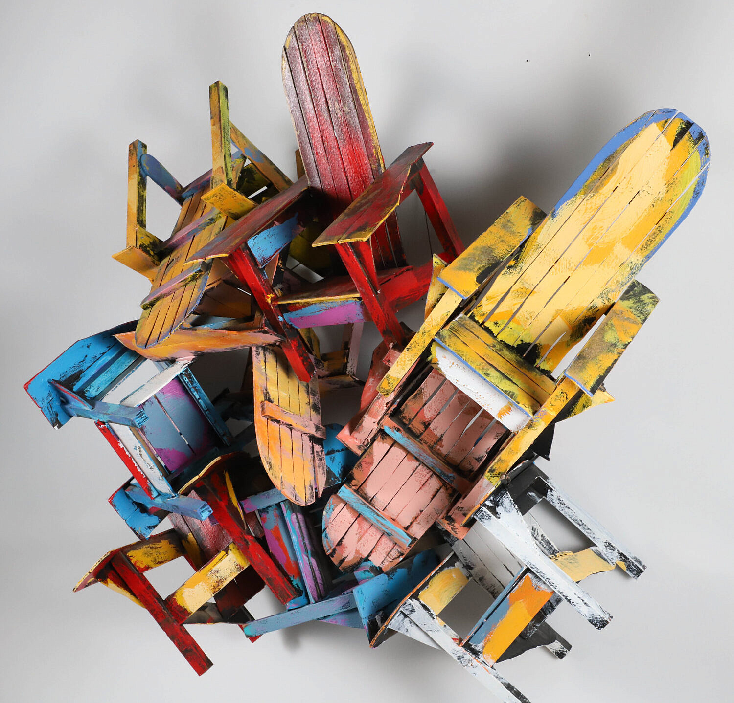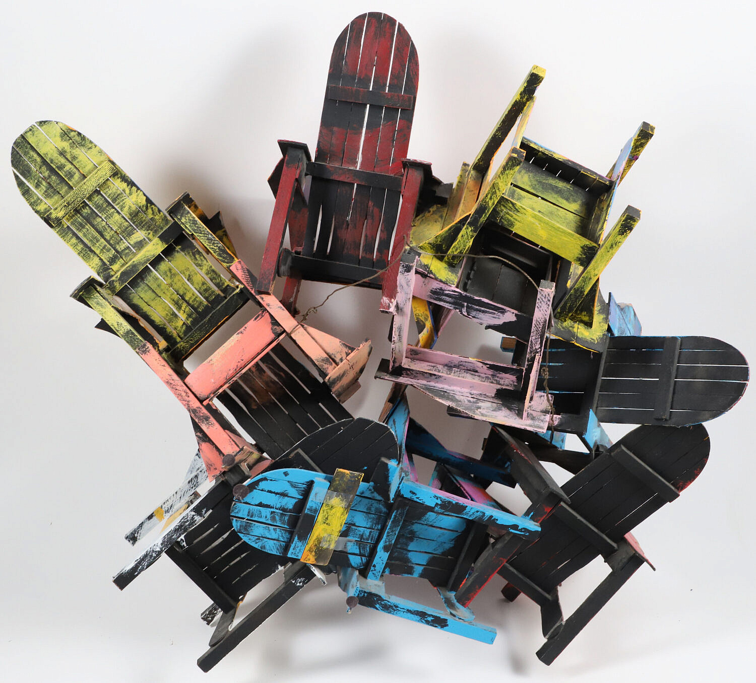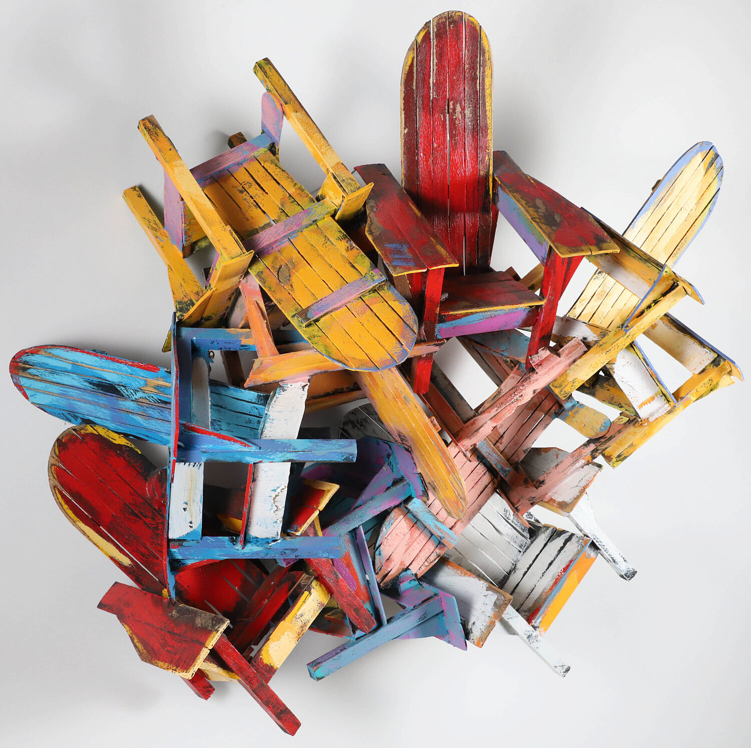 Paul Jacobsen, (American) Adirondack Chair Sculpture Wall Art, consisting of 9 individually painted Adirondack chairs stacked, neatly, in a circular formation and painted in bright colors. All made by hand by Jacobsen.