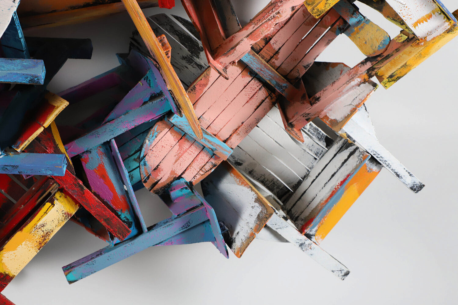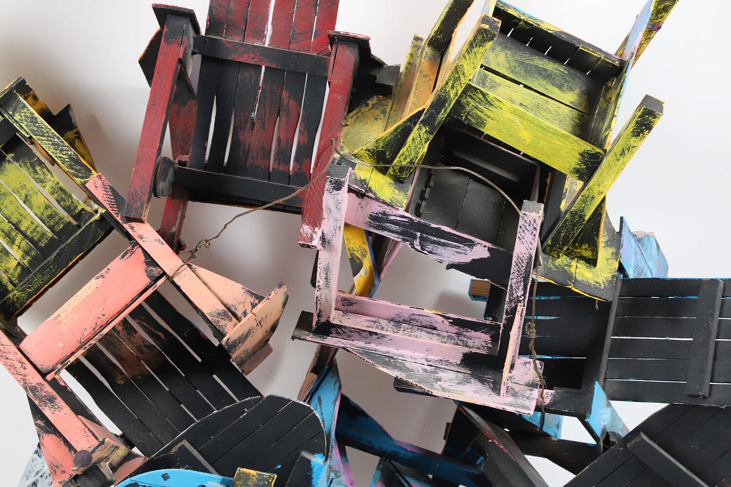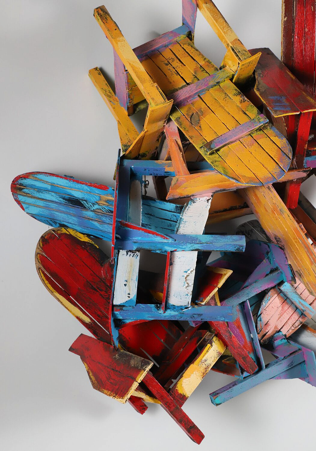 Paul Jacobsen, (American) Adirondack Chair Sculpture Wall Art, consisting of 9 individually painted Adirondack chairs stacked, neatly, in a circular formation and painted in bright colors. All made by hand by Jacobsen.