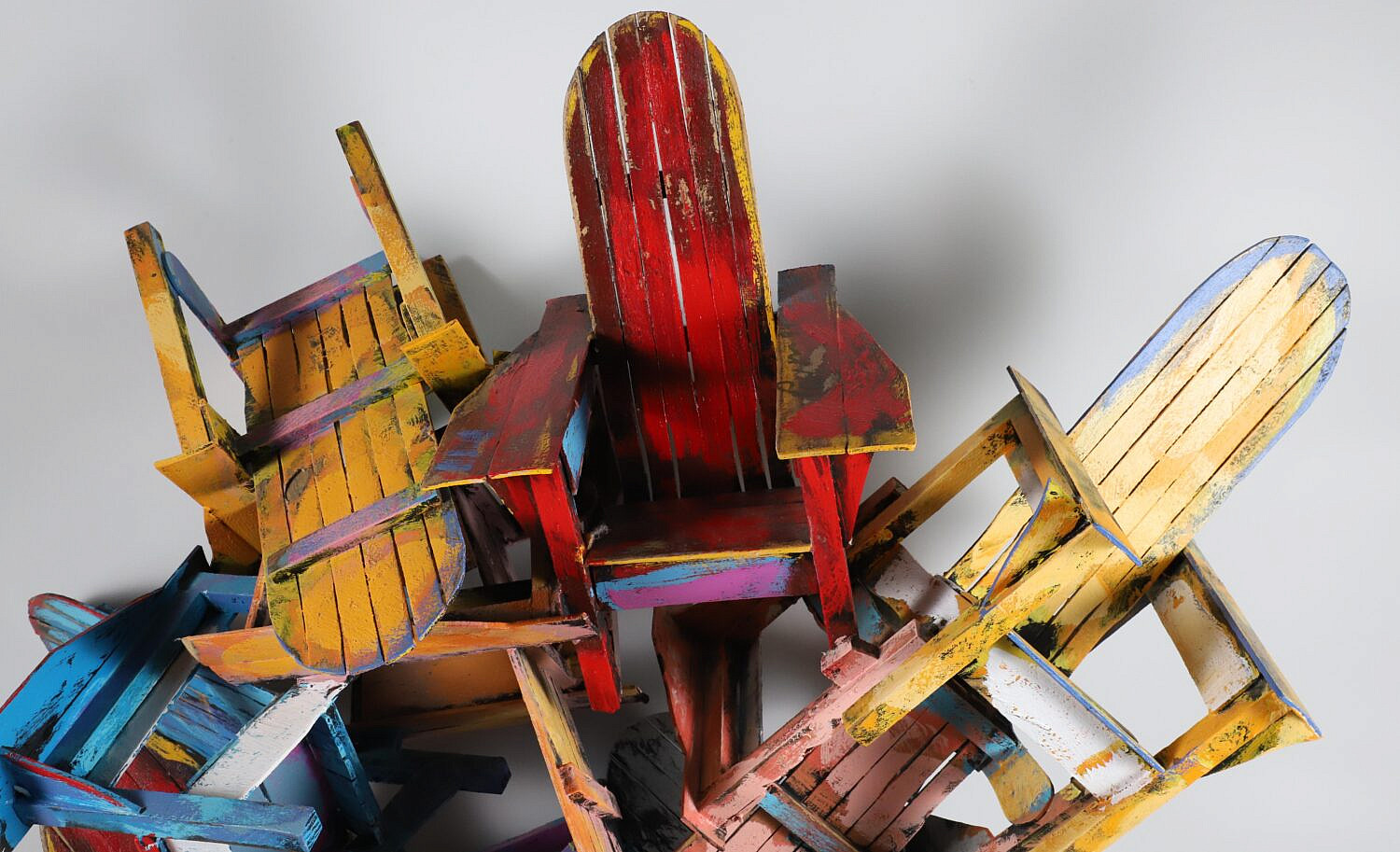 Among his most famous works are the Adirondack chair series. The Adirondack chair recollects summer, beaches, color, warmth and his time spent in New York. “The chairs themselves are just a vehicle to paint on. Paint does all sorts of wonderful things to these chairs.