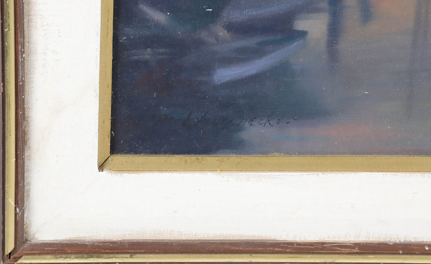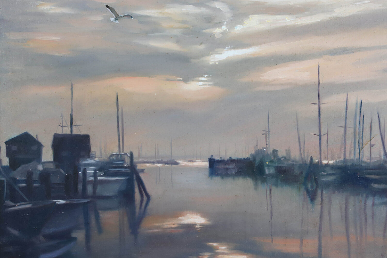 Paul Longenecker (American 1920-2008) Oil on Canvas “Nantucket Boat Basin at Dusk”, signed lower left Paul Longenecker, in wood frame with gilt liner