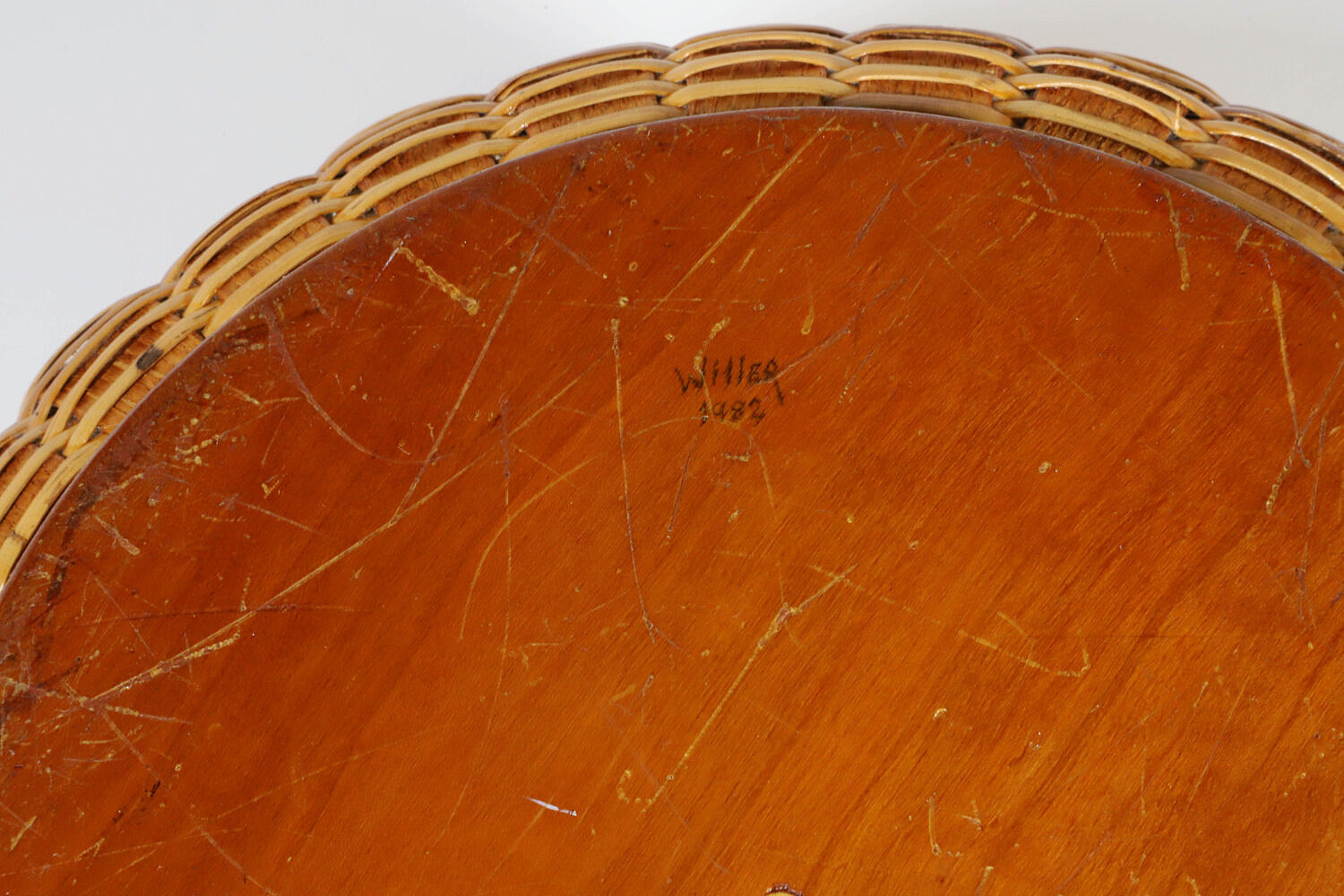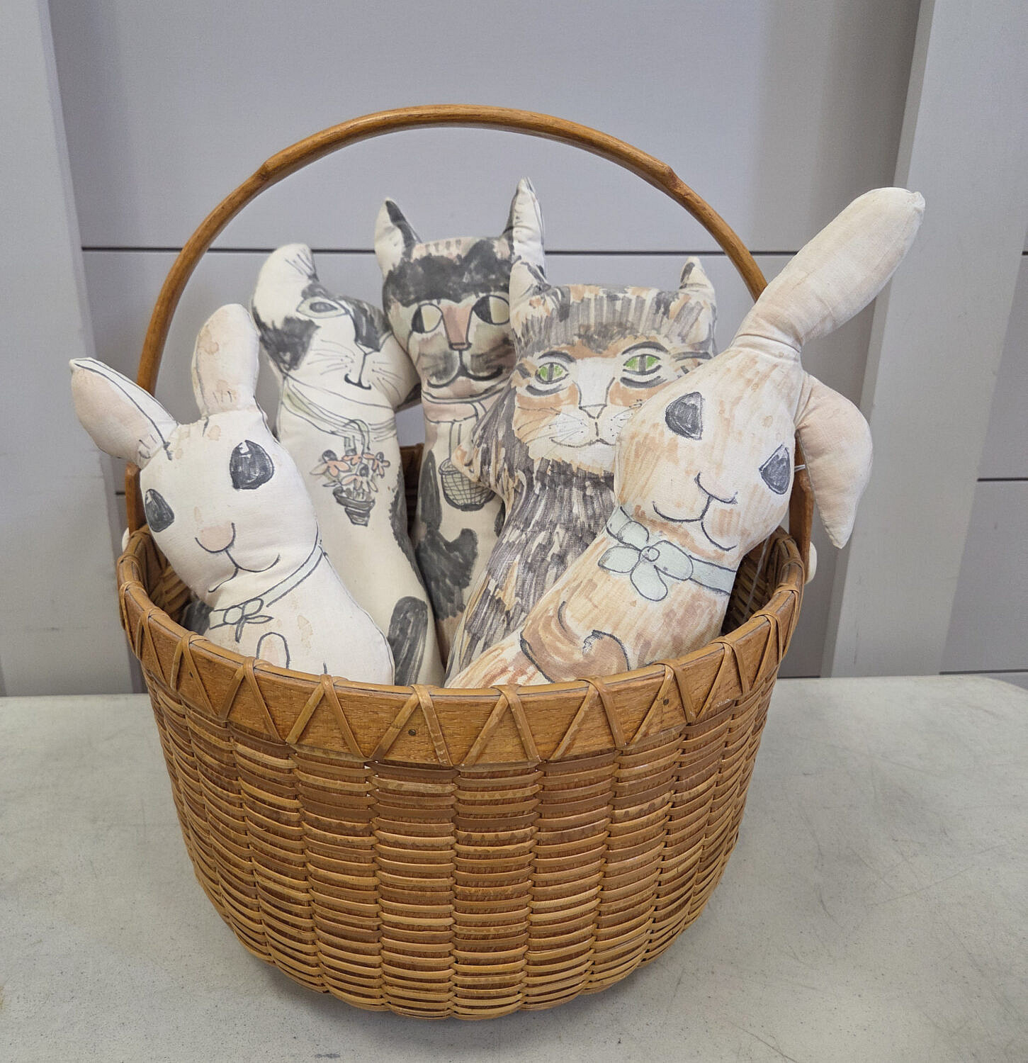 Paul Willer (1930-2025) Round Swing Handle Nantucket Basket with 3 Seeler cats and 2 bunnies, signed and dated 1983