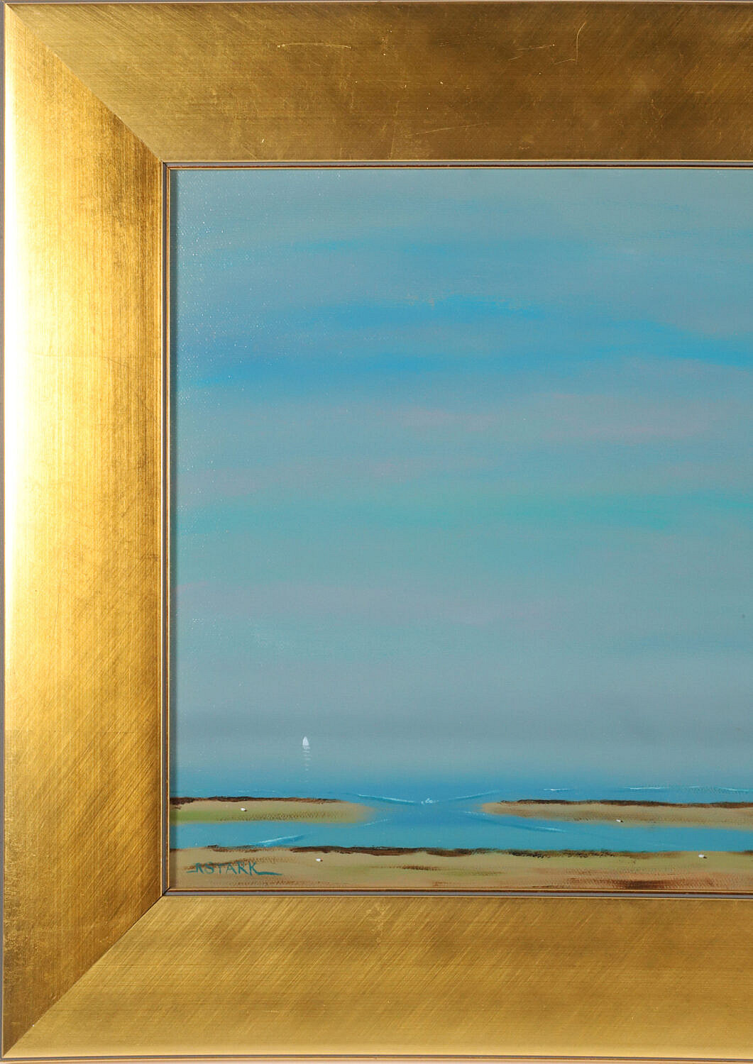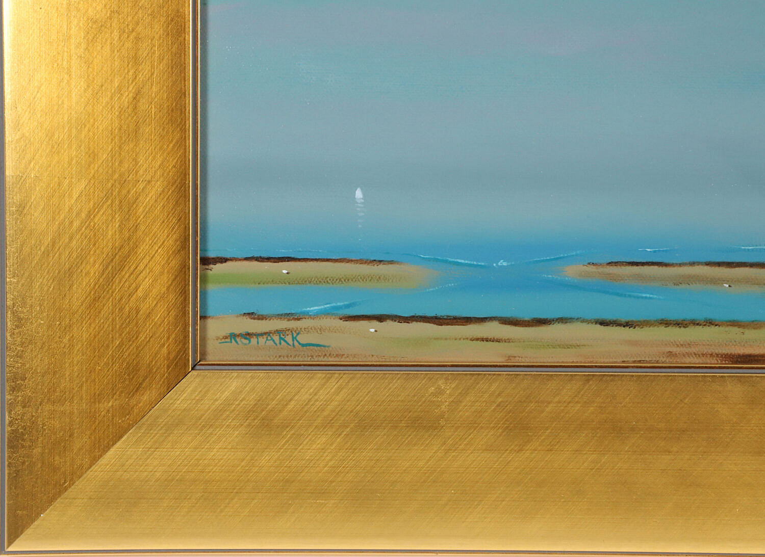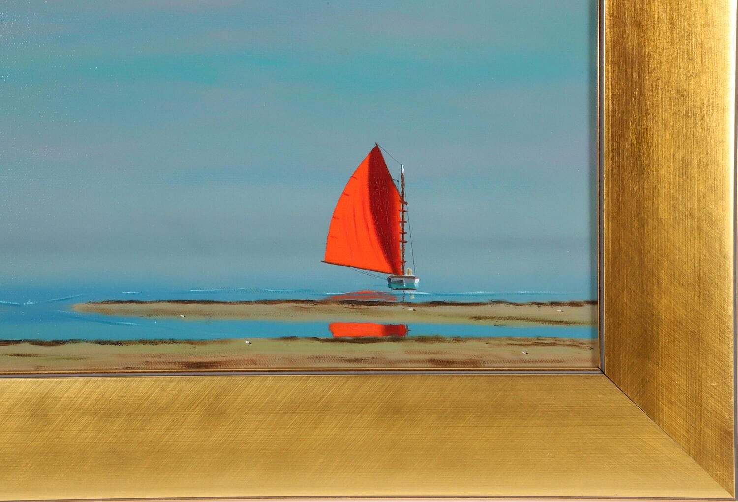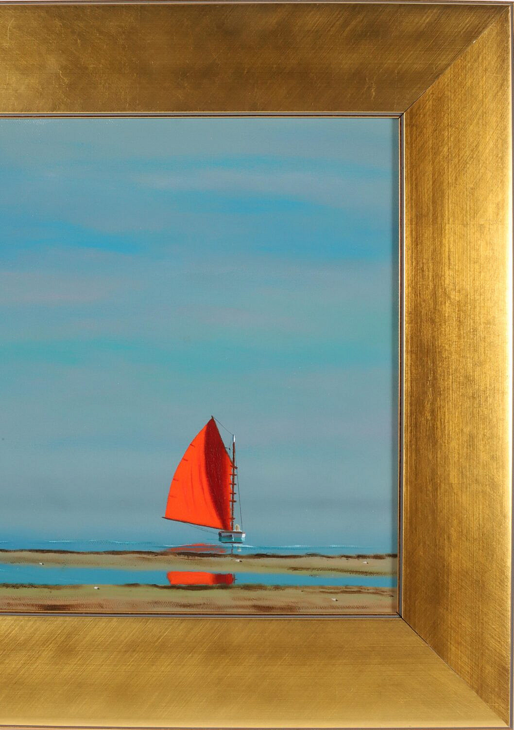 Robert Stark Jr. (1942-2004) Oil on Canvas “Red Sail in Polpis Harbor”, signed lower left R. Stark, in broad flat gilt frame