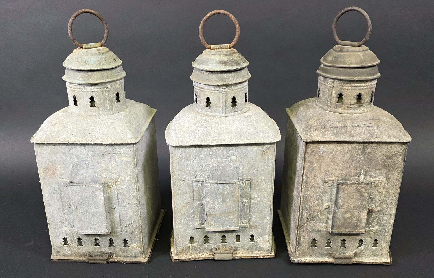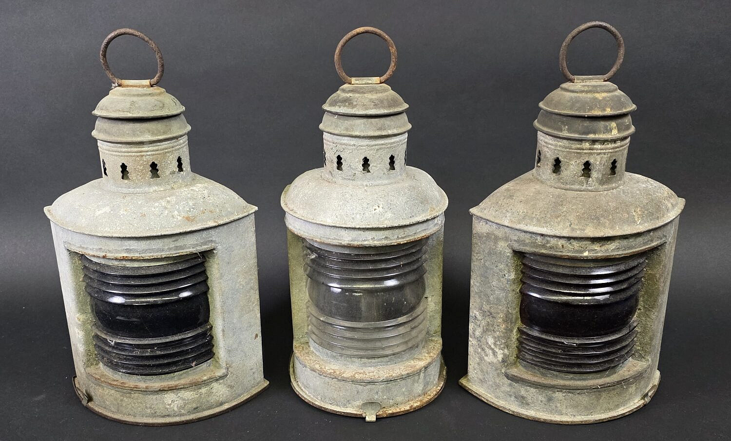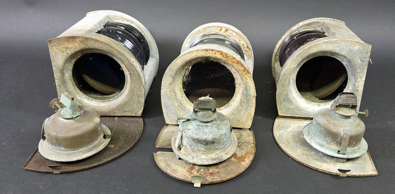 Set of Three Antique Metal Ships Light Lanterns, 19th century, port, starboard and masthead light included, each with original burners.