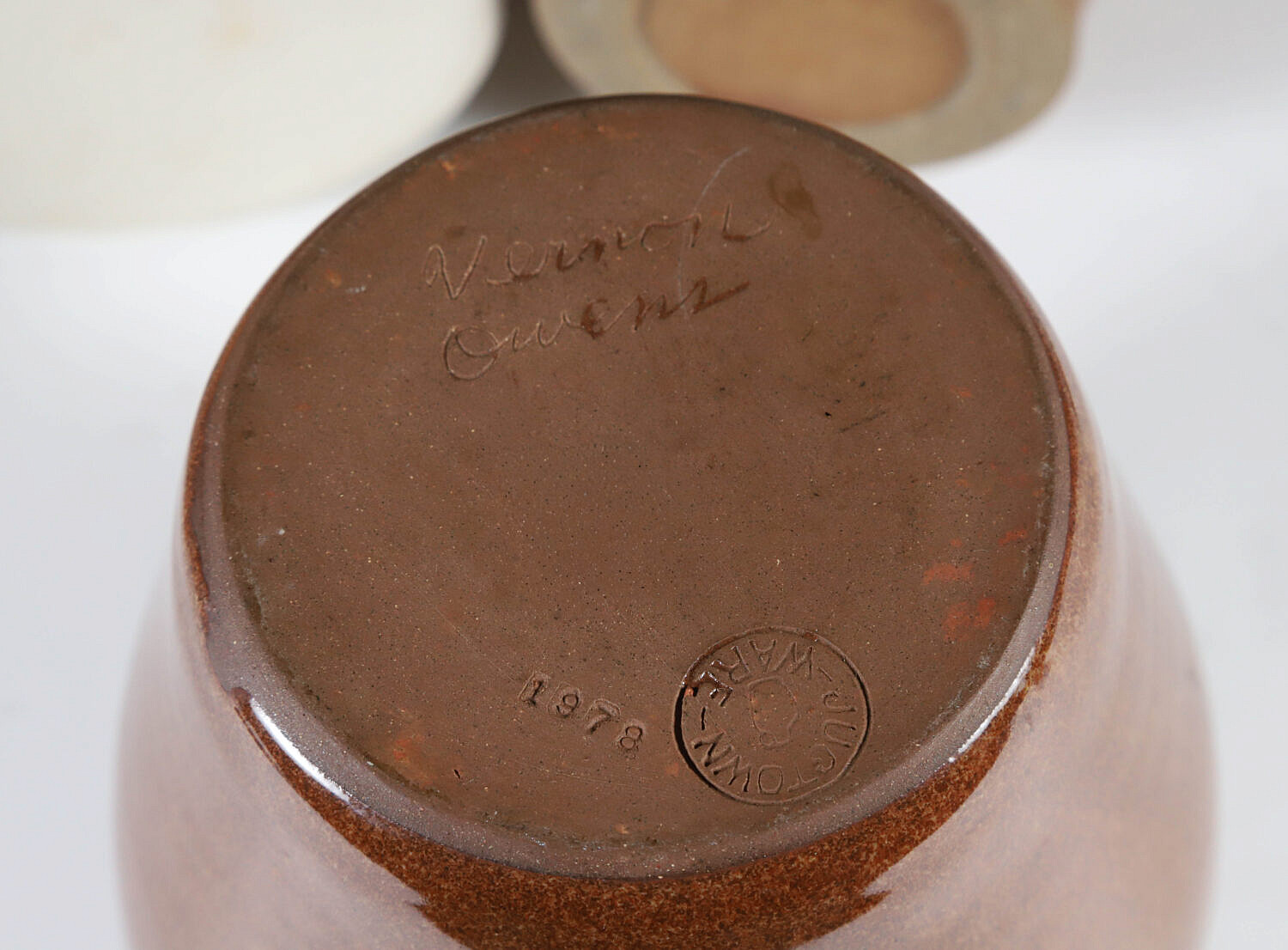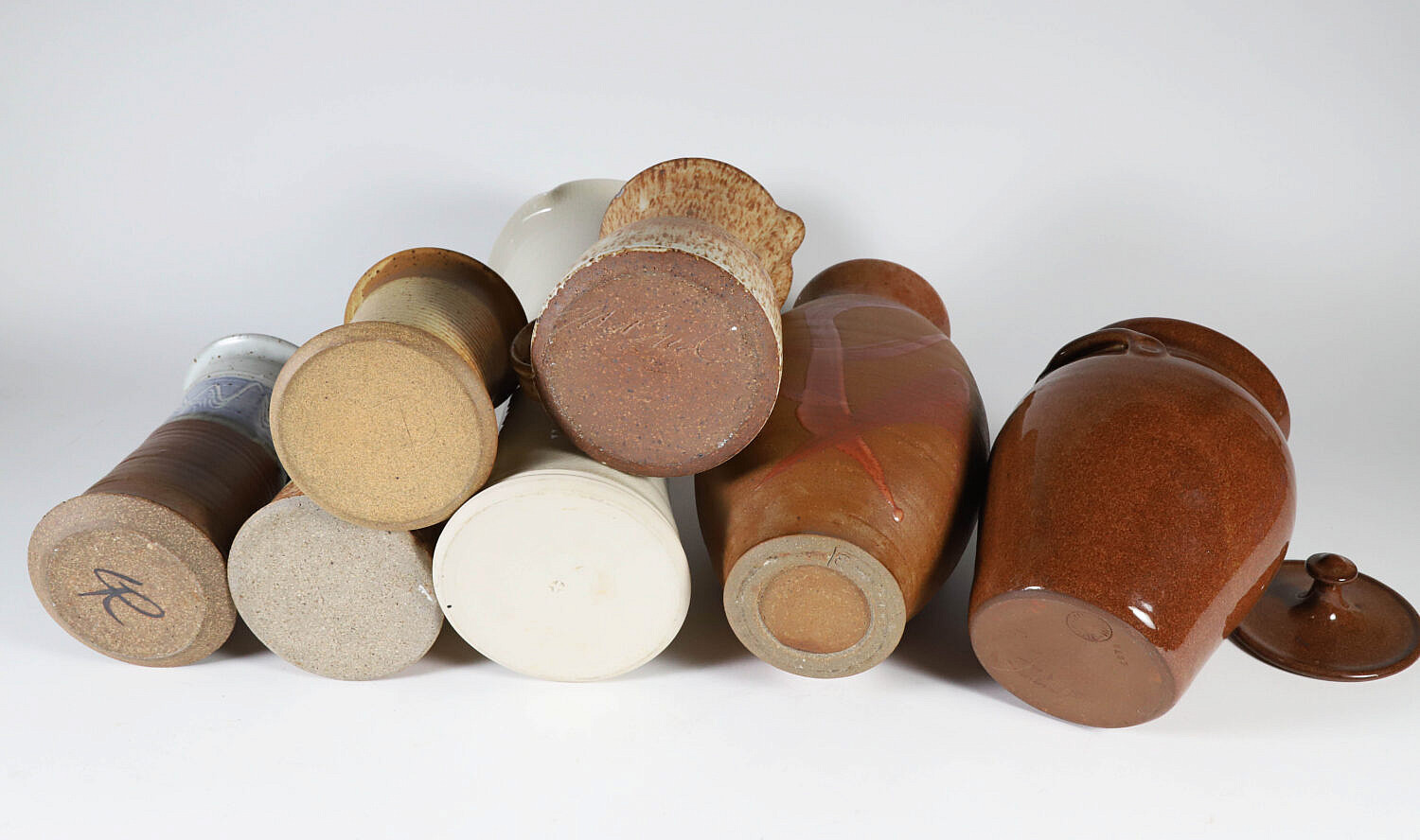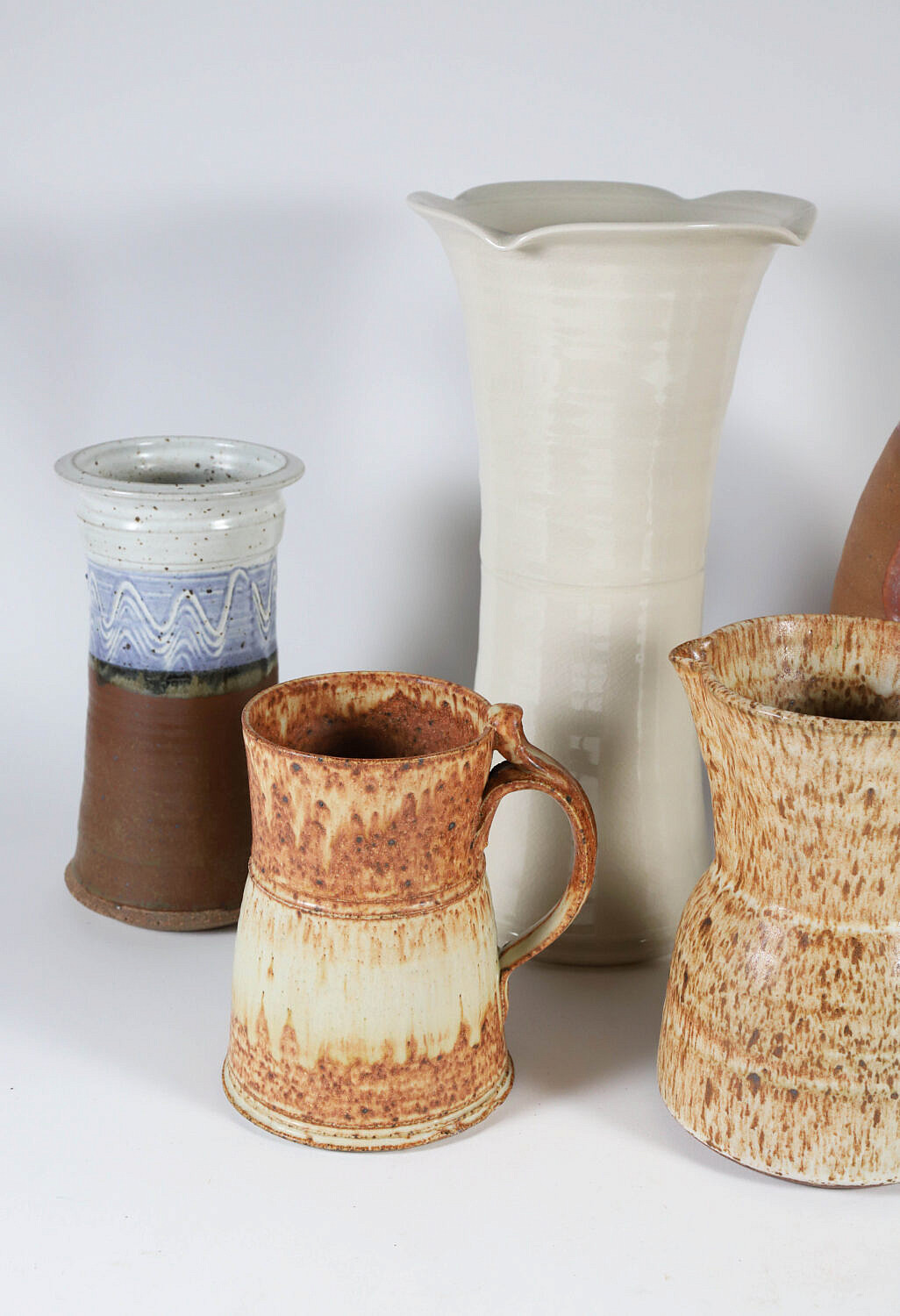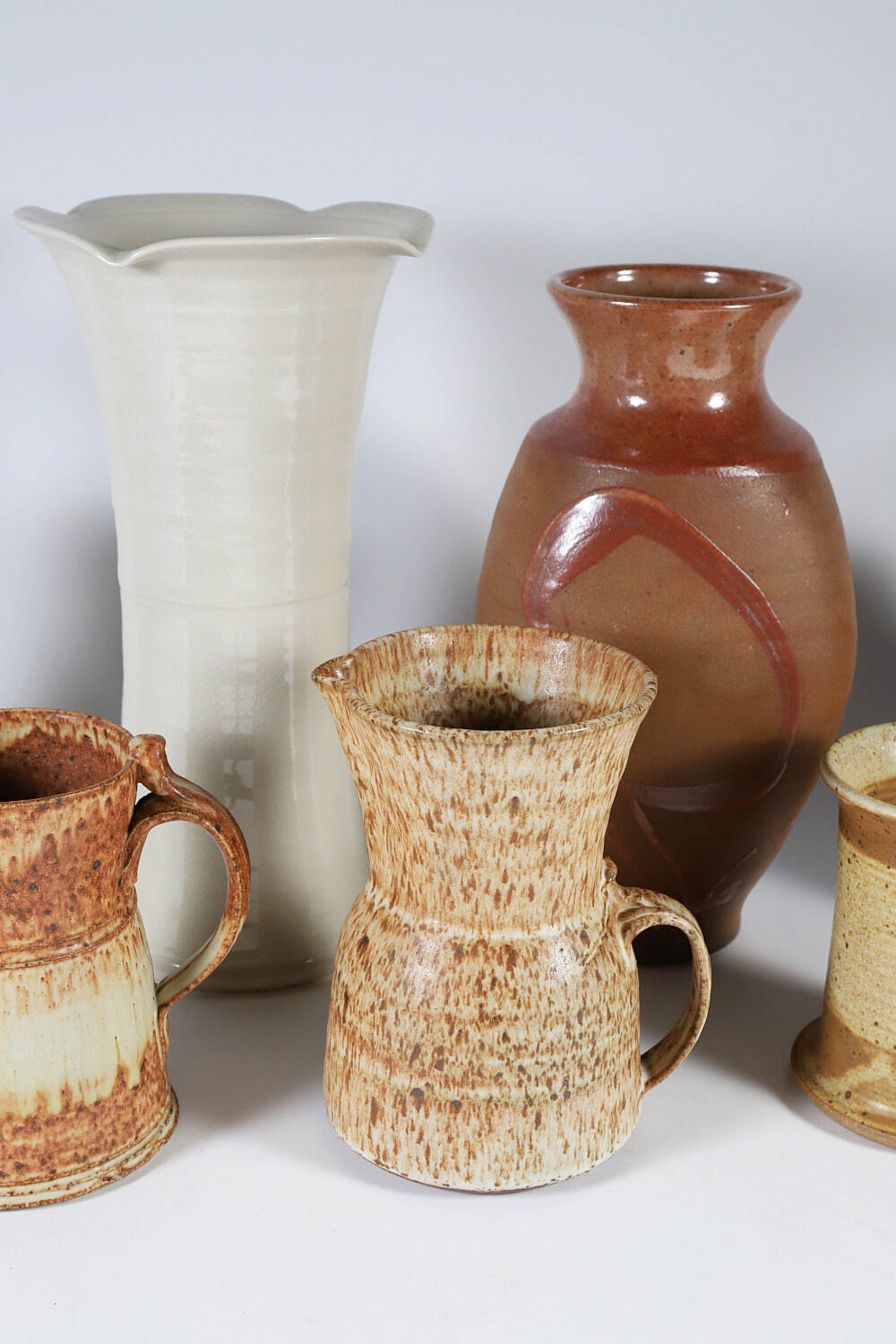 Seven Contemporary Pottery Pieces Including Vases, Pitchers and Covered Jugtown Redware Crock