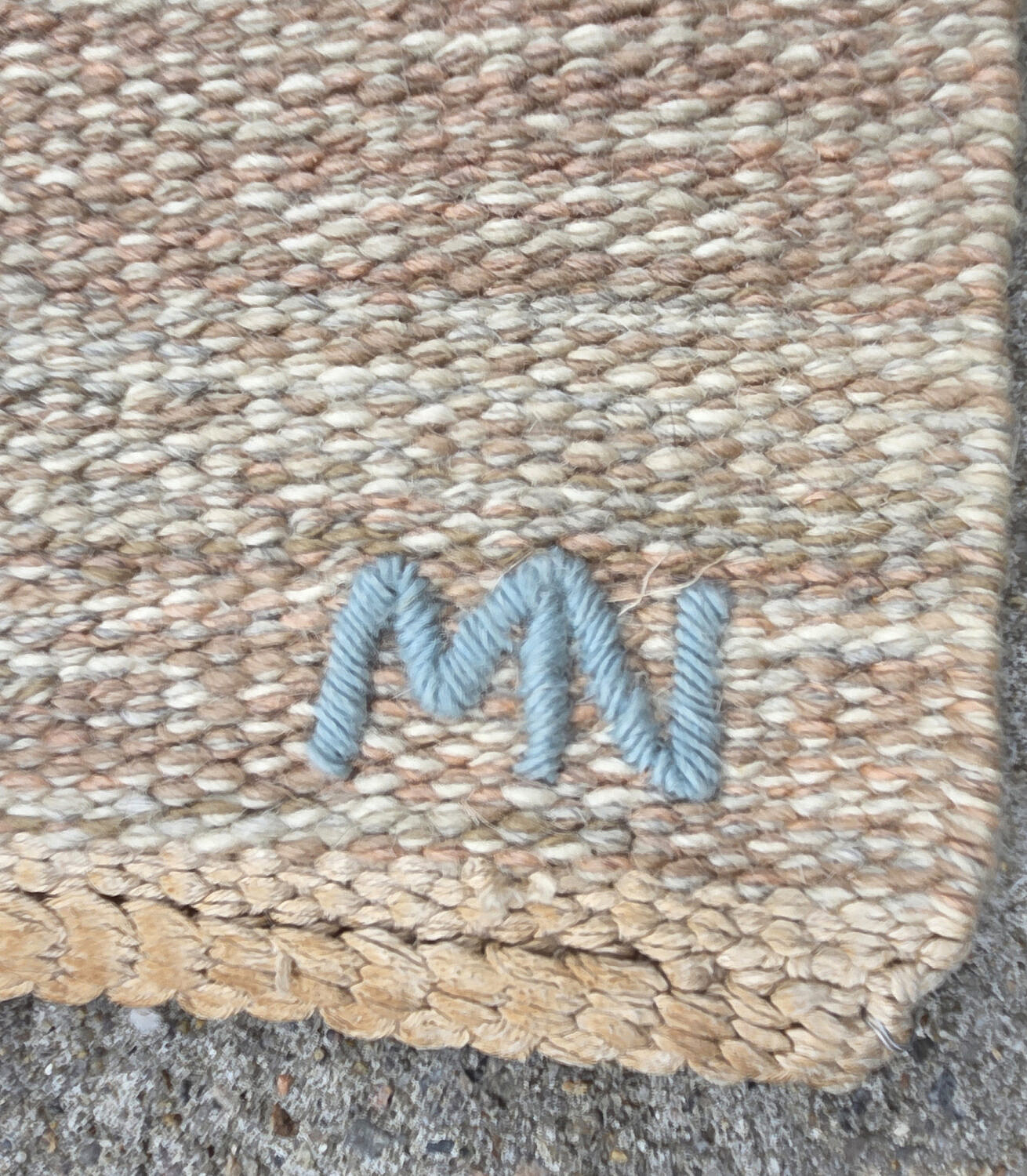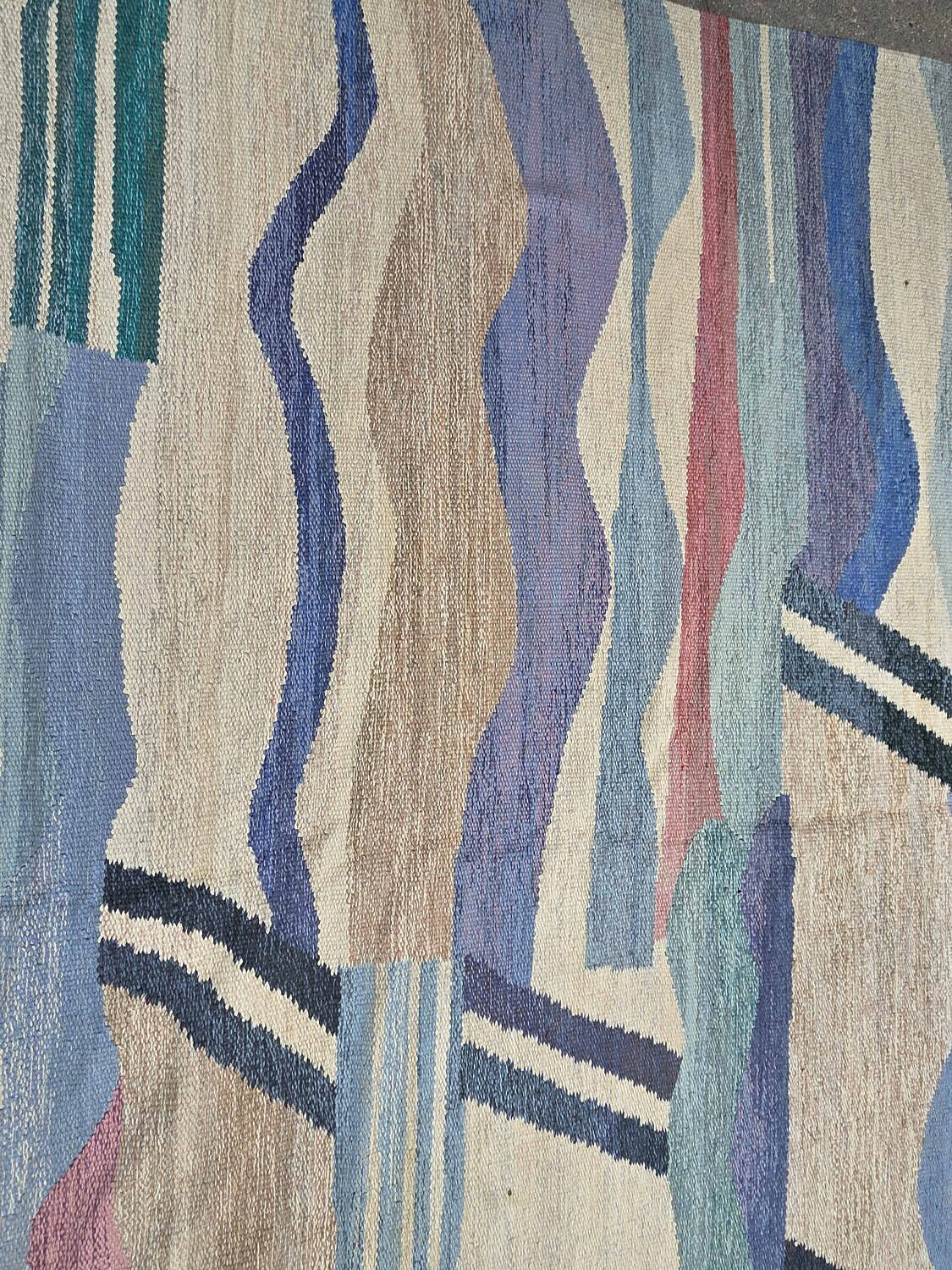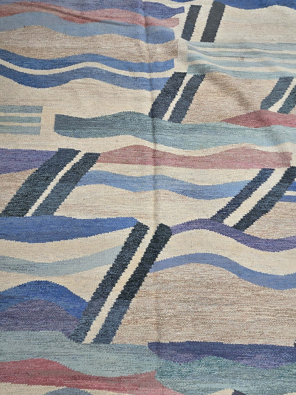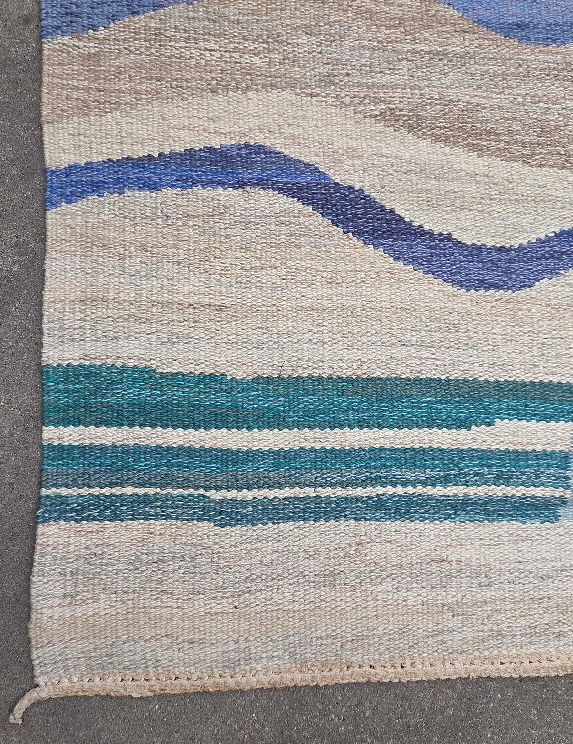 Margaretta Nettles (Swedish 20th Century) Modern Blue and White Multicolor Hand Loomed Wool Carpet, initialed in a corner MN