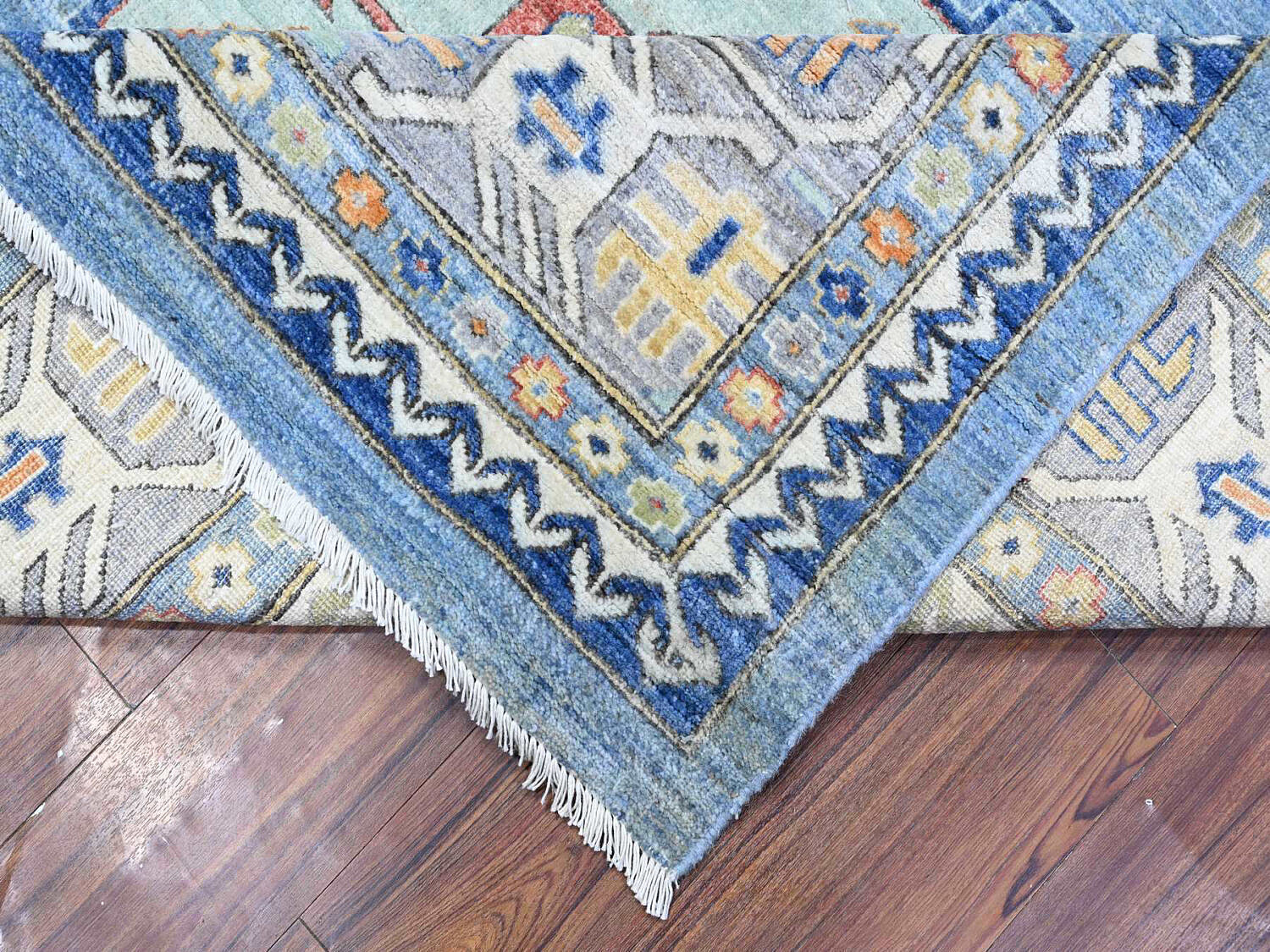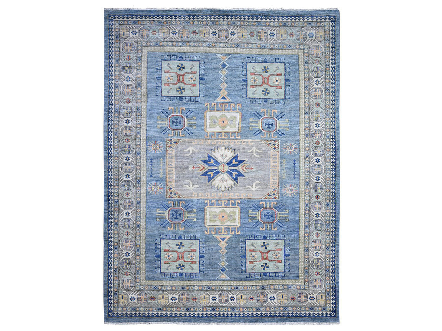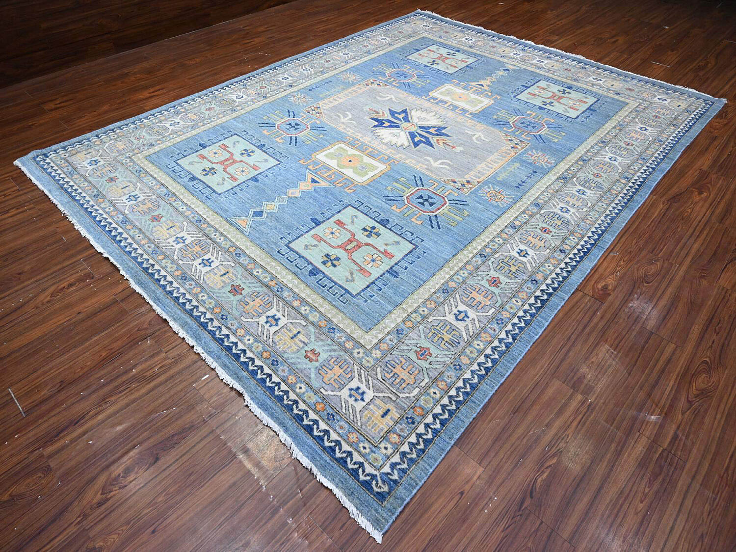 Sky Blue Fine Peshawar Hand Knotted Wool Carpet, with allover geometric designs, soft shiny wool