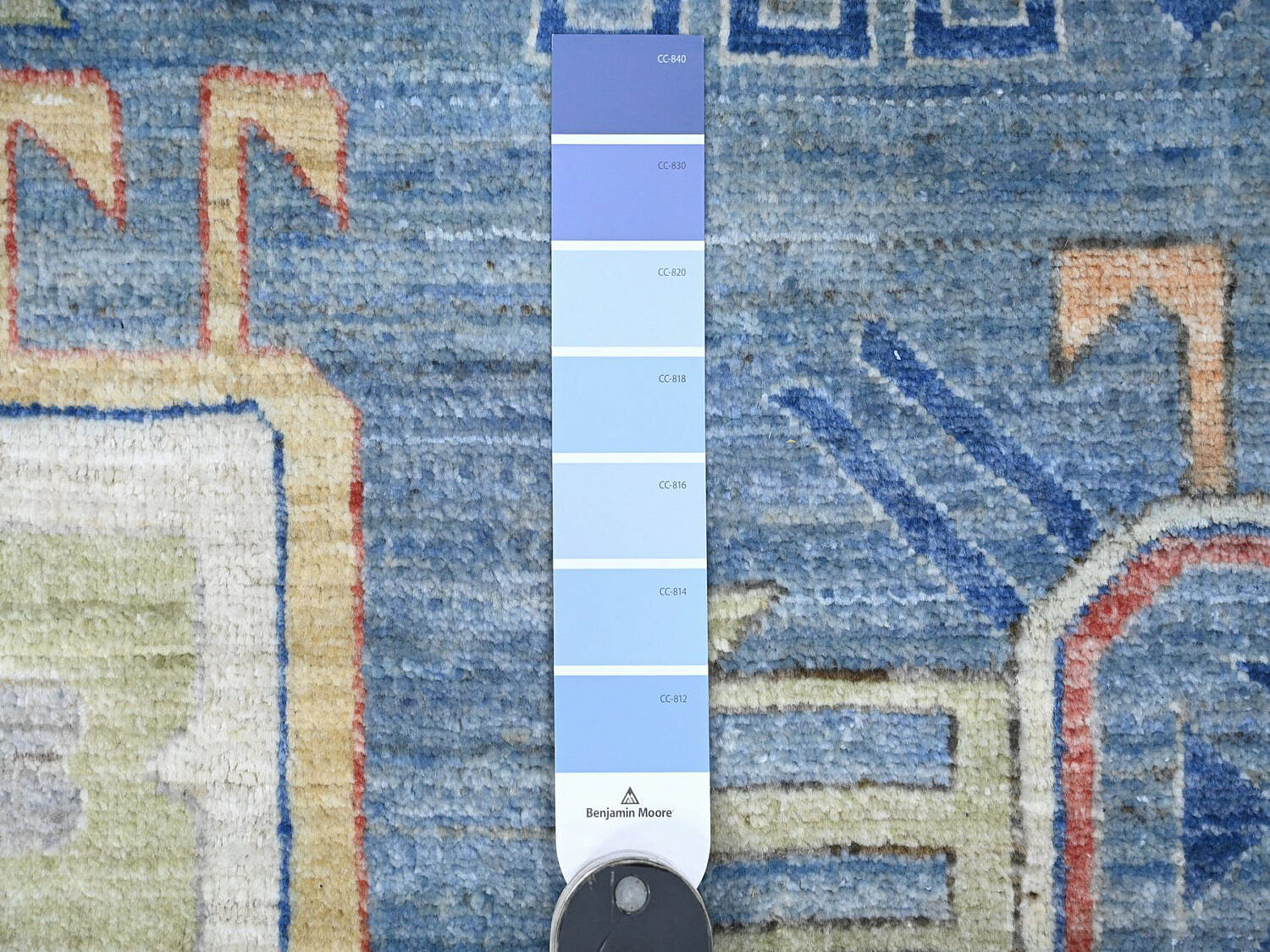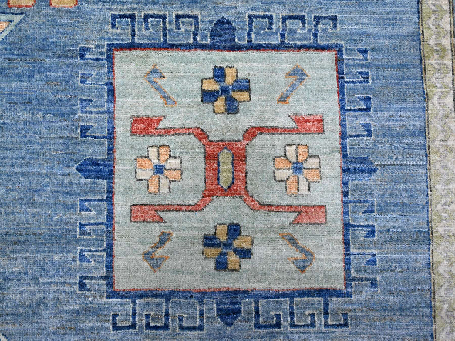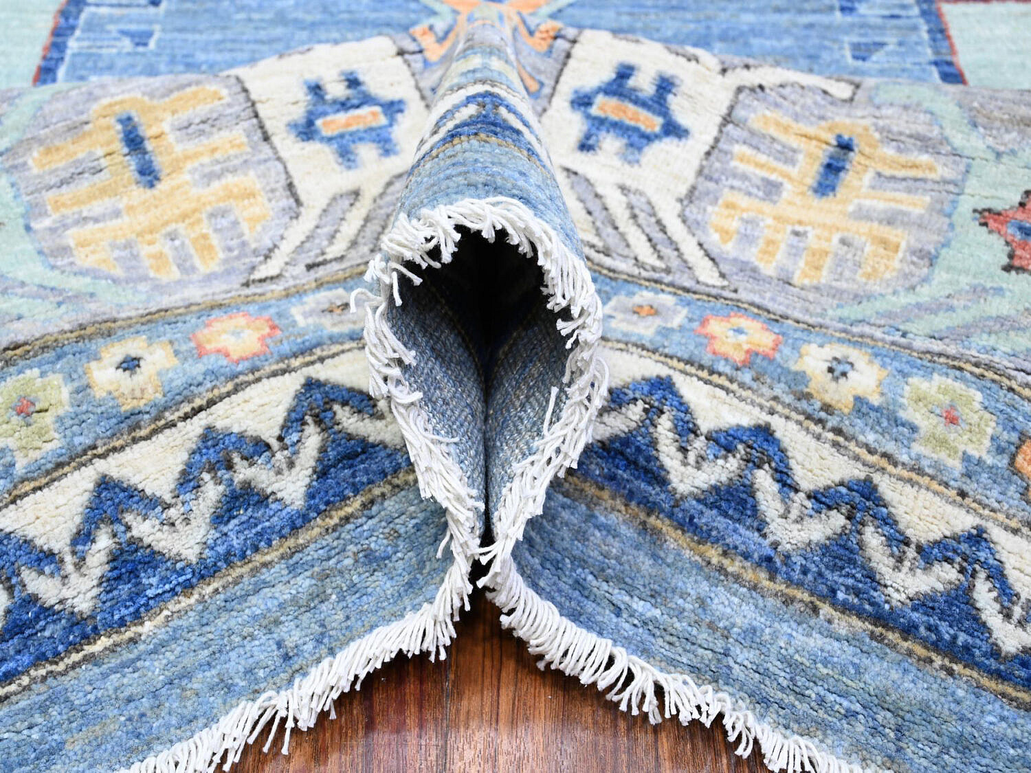 Sky Blue Fine Peshawar Hand Knotted Wool Carpet, with allover geometric designs, soft shiny wool