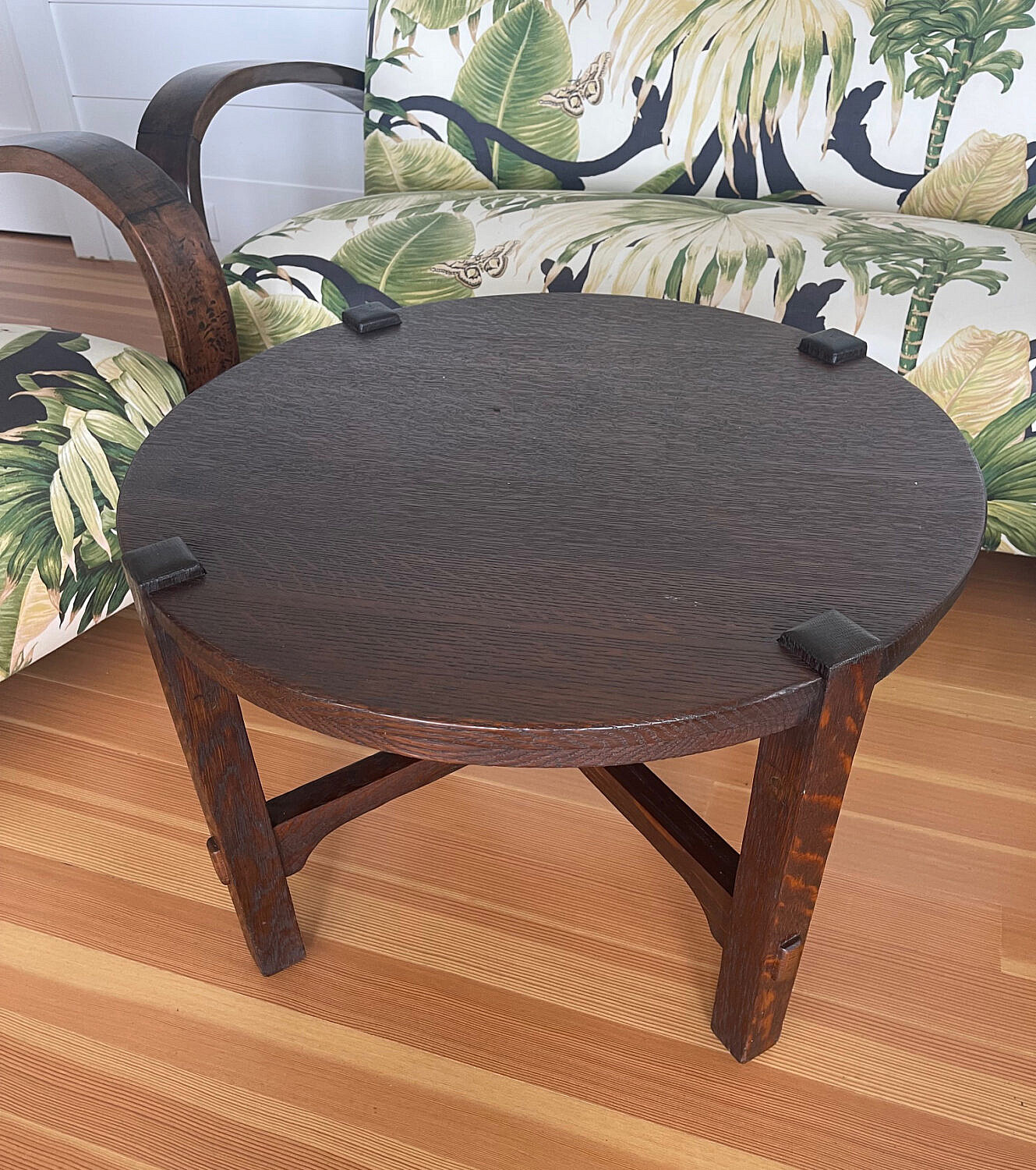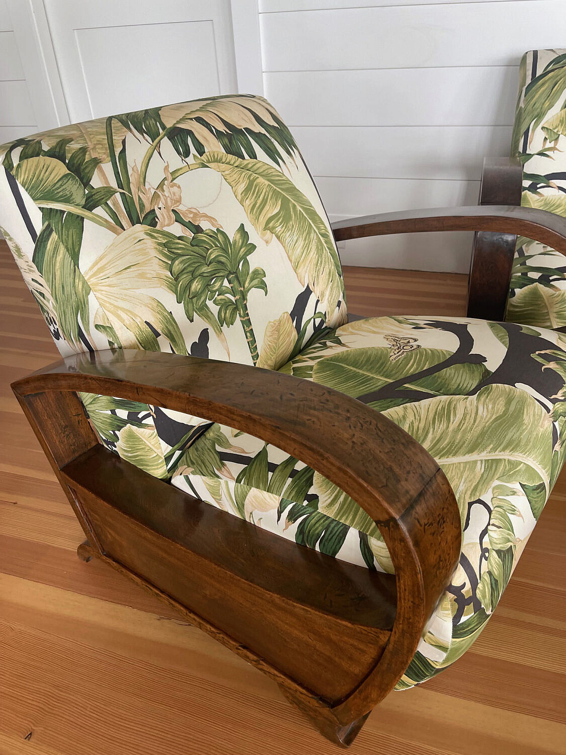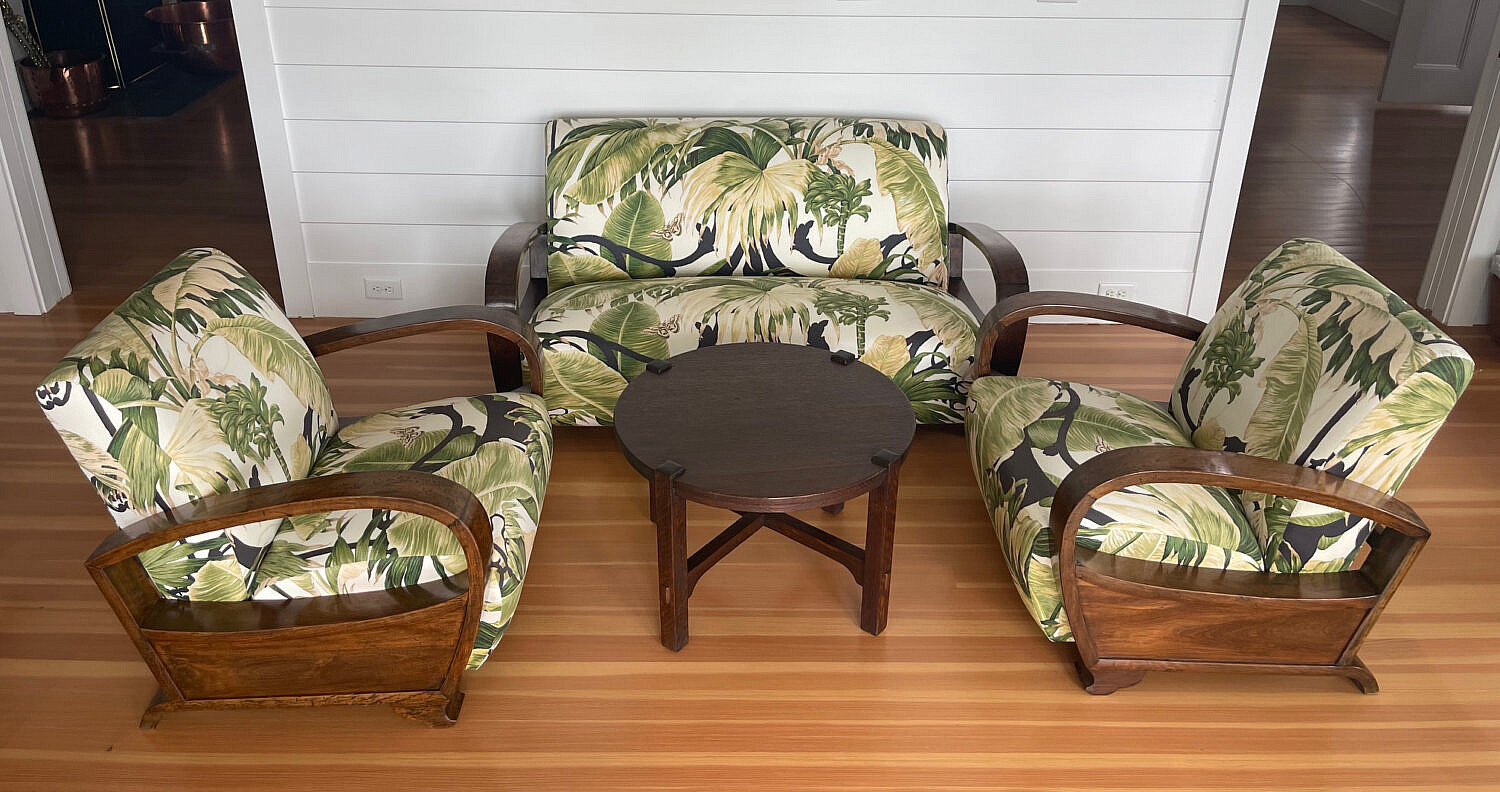 Suite of Four Art Deco Settee, Pair of Armchairs and Oak Coffee Table, upholstered in tropical fabric