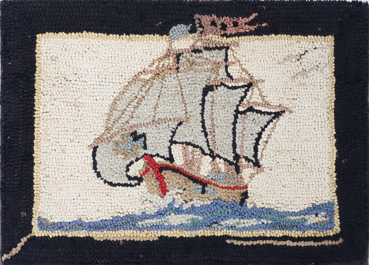 Three Antique Clipper Ship Hooked Rug Mounted on Boards
