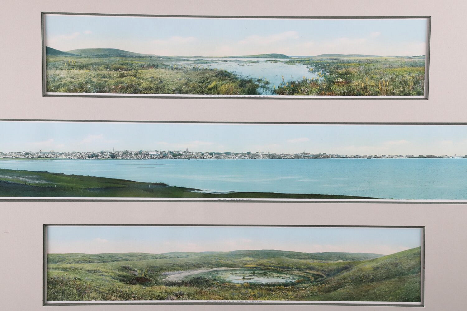 Three Marshall Gardiner (1884-1942) Long Nantucket Postcards, matted and framed in one wood frame. Views of Moorlands and Polpis Harbor, Nantucket from Monomoy Shore, and Long Pond in Saul’s Hills.