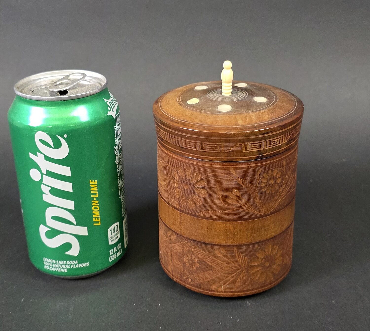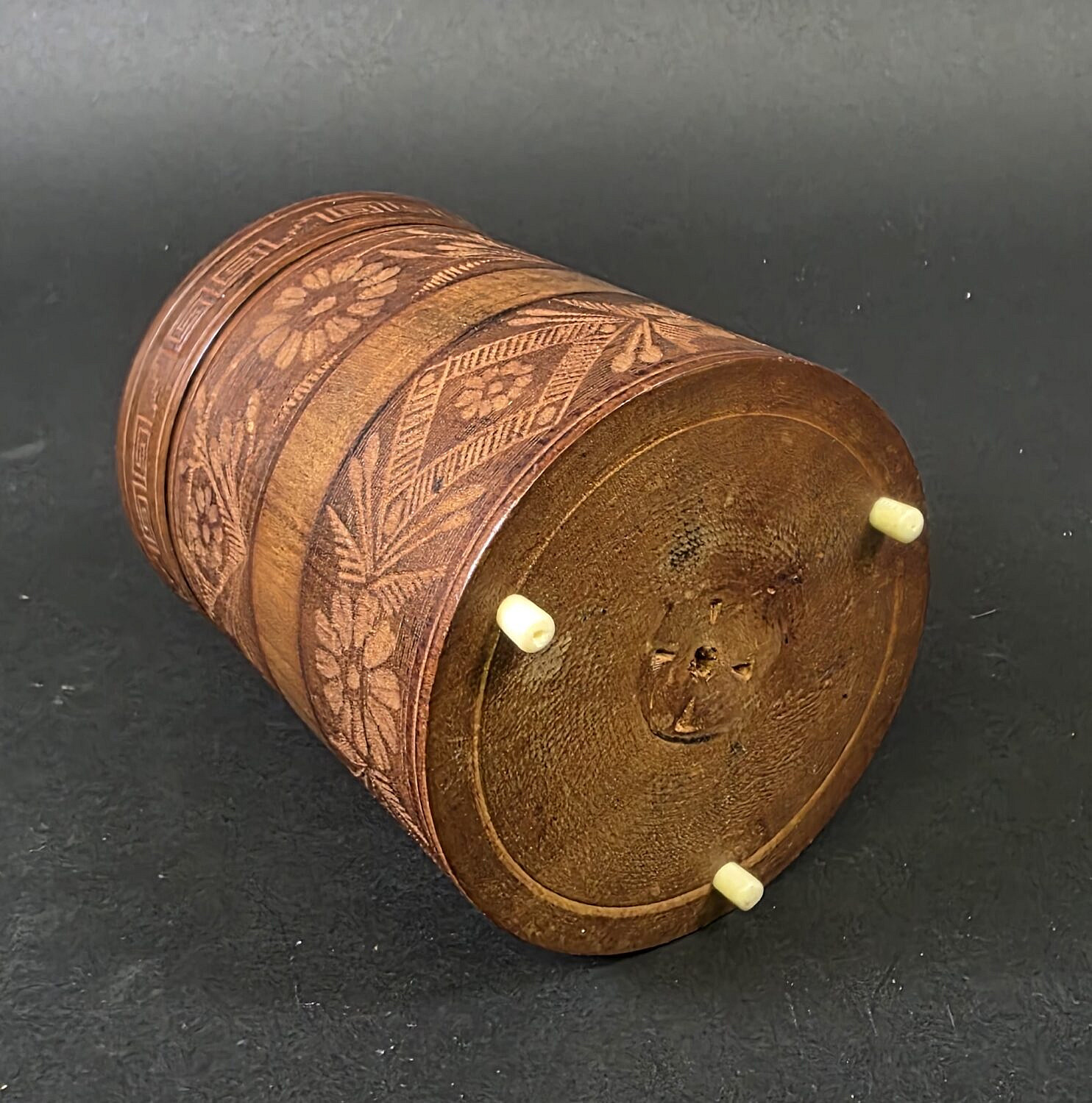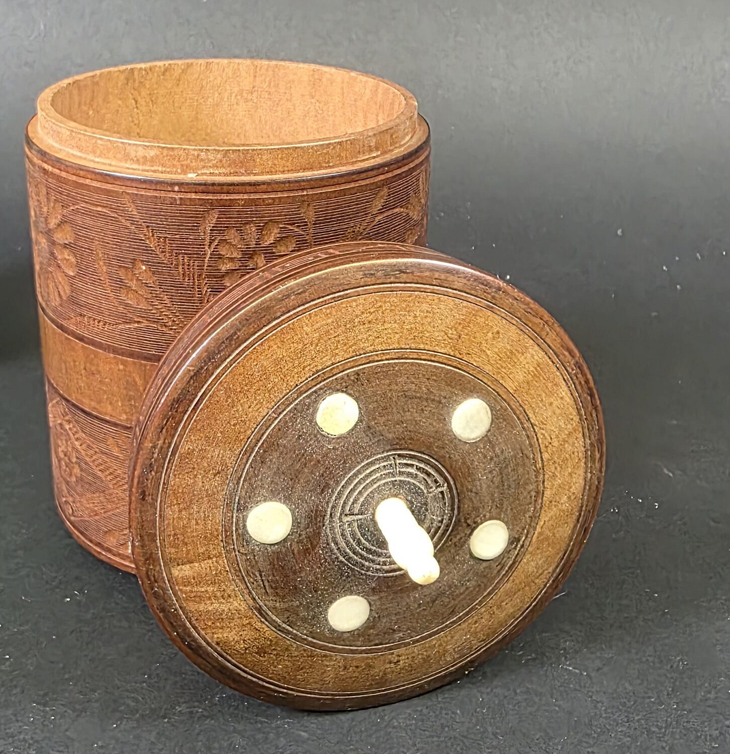 Vintage Carved and Inlaid Circular Cedar Box, 20th century, with floral relief carved decoration, bone inlay, feet, and finial.