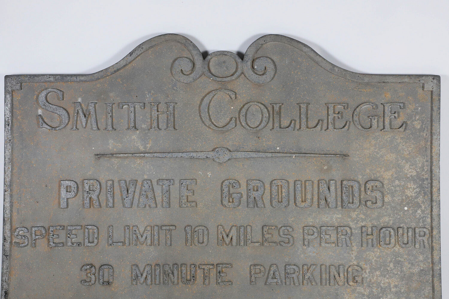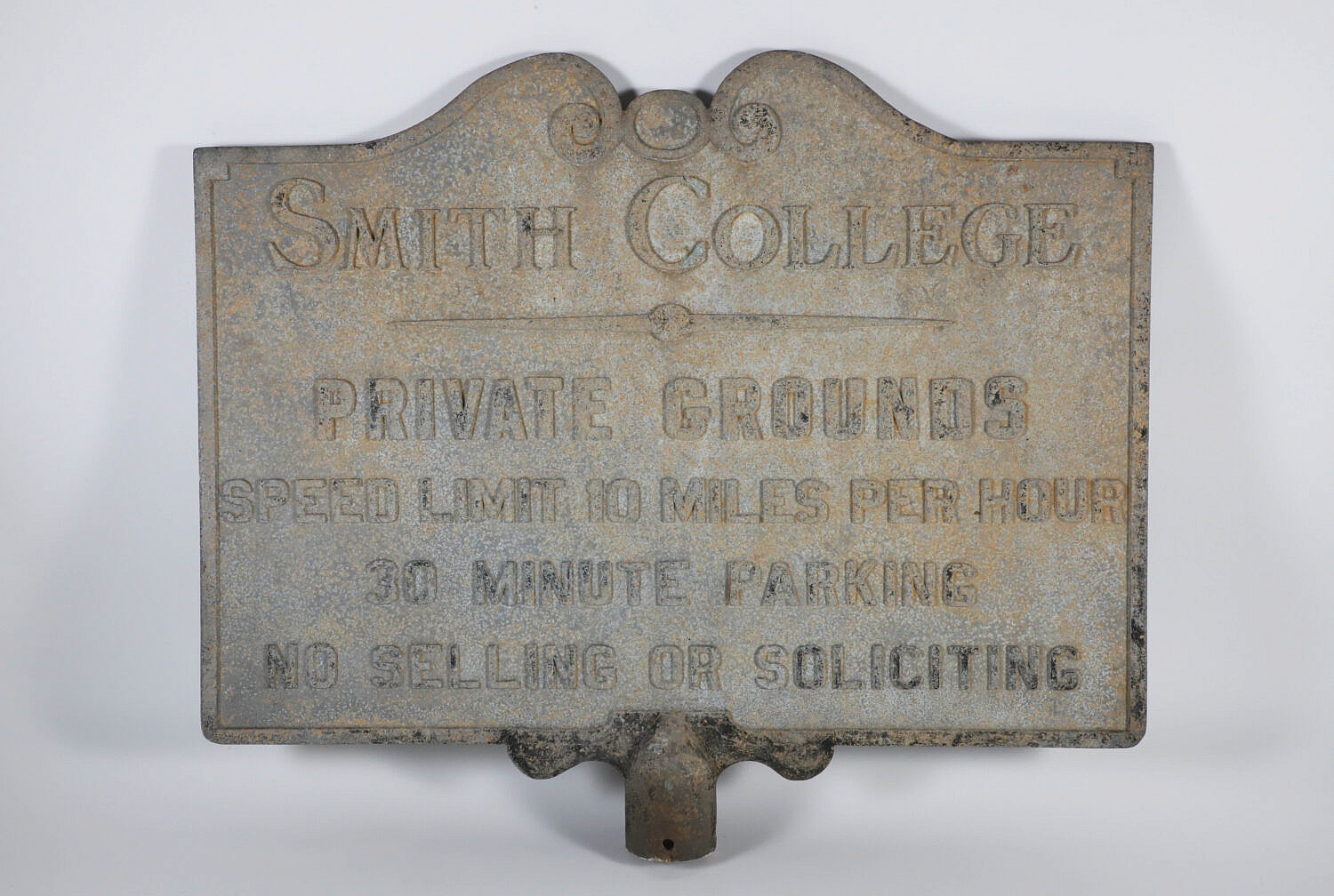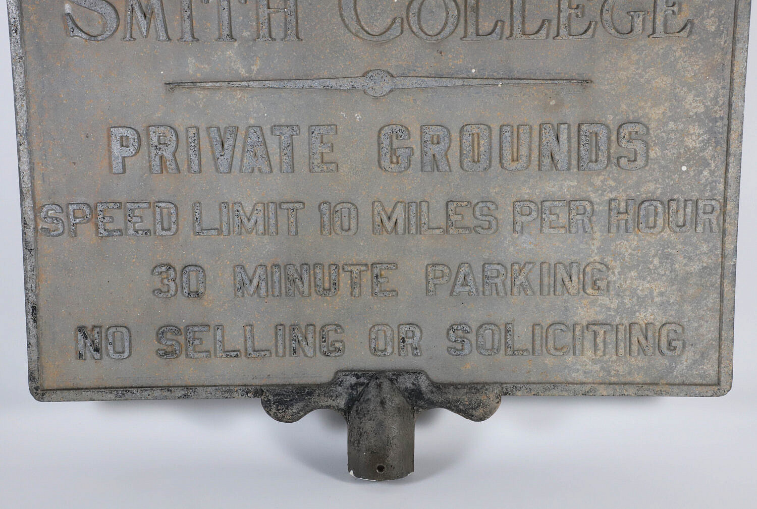 Vintage Metal Smith College Sign, “Private Grounds, Speed Limit 10 Miles Per Hour, 30 Minute Parking, No Selling or Soliciting”
