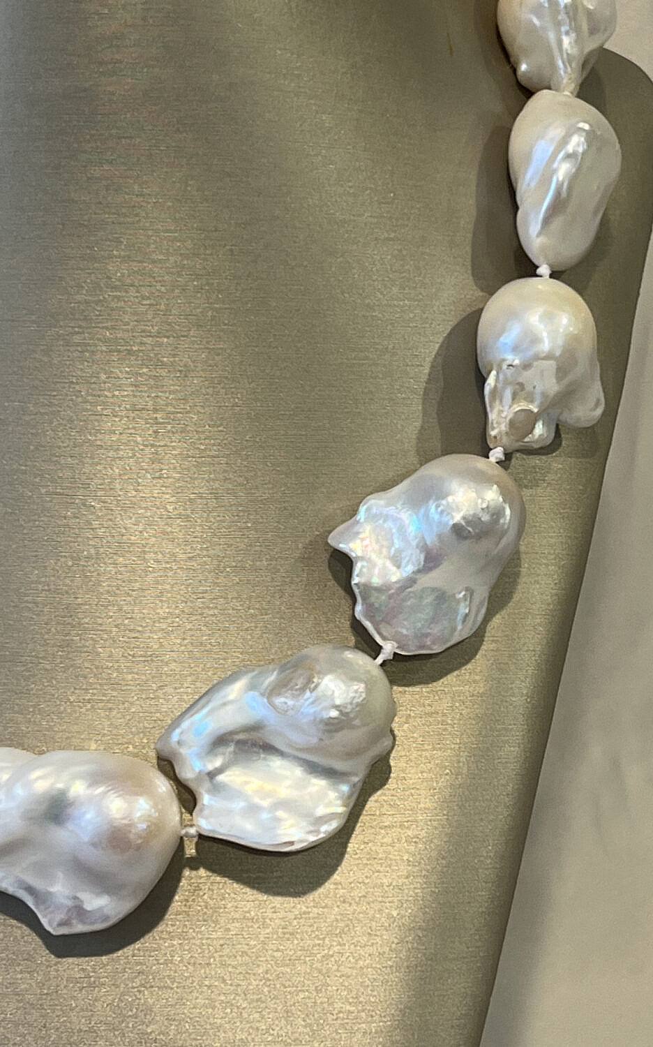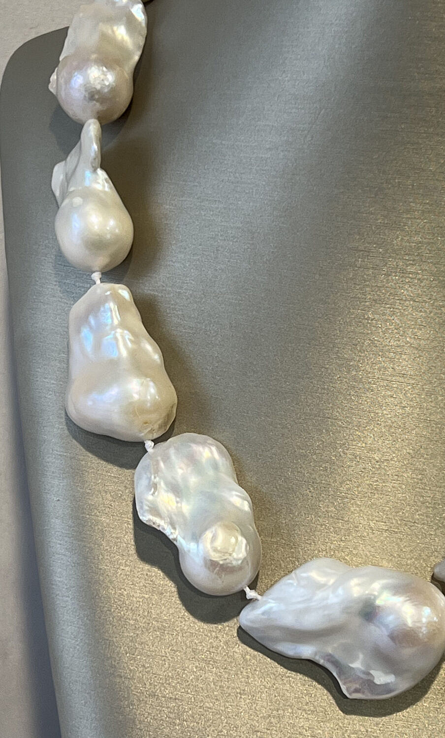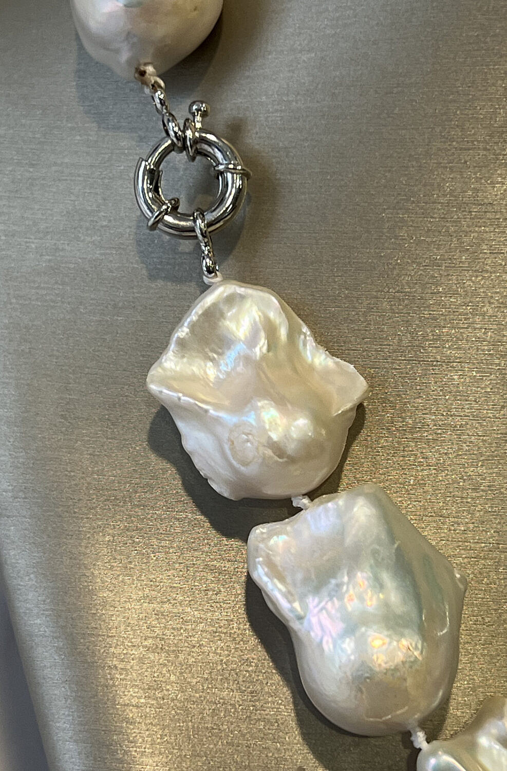 18mm x 30mm White Fresh Water Baroque Pearl Necklace, White Metal Clasp