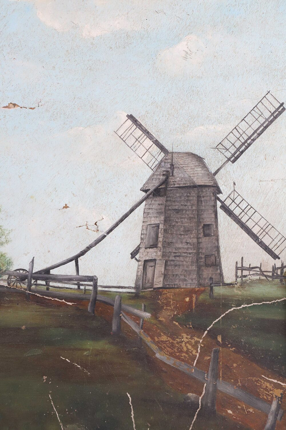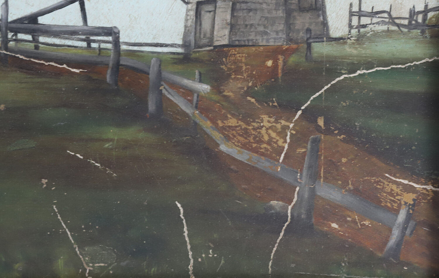 1910s Oil on Artist Board “View of the Old Mill Nantucket”, in as found condition, wood frame