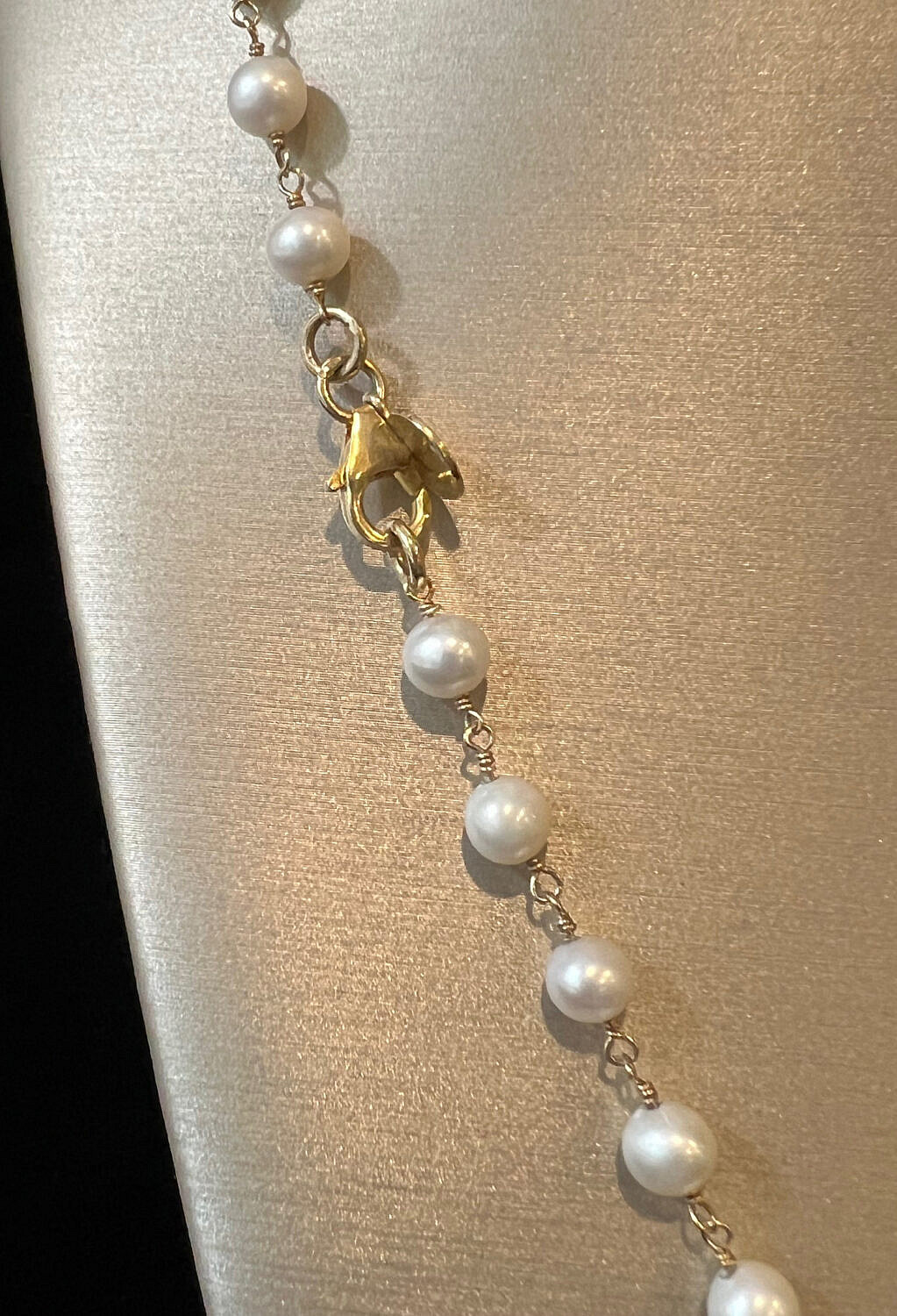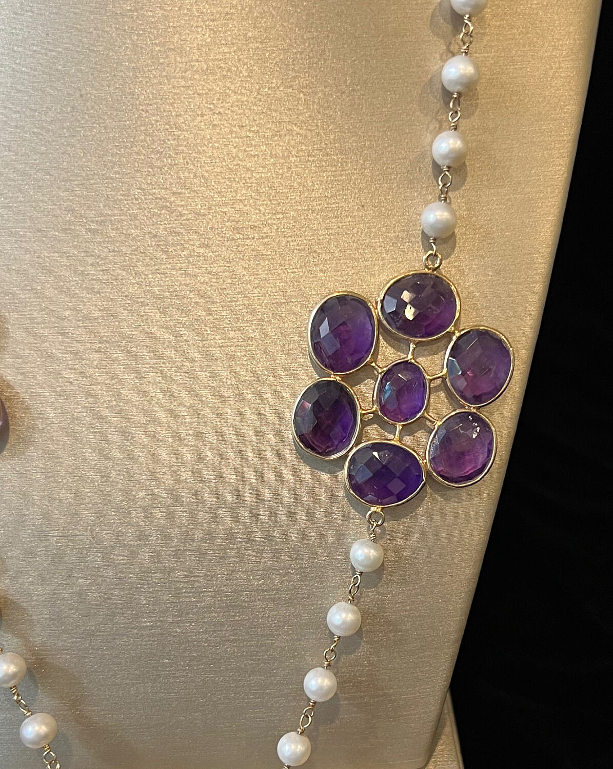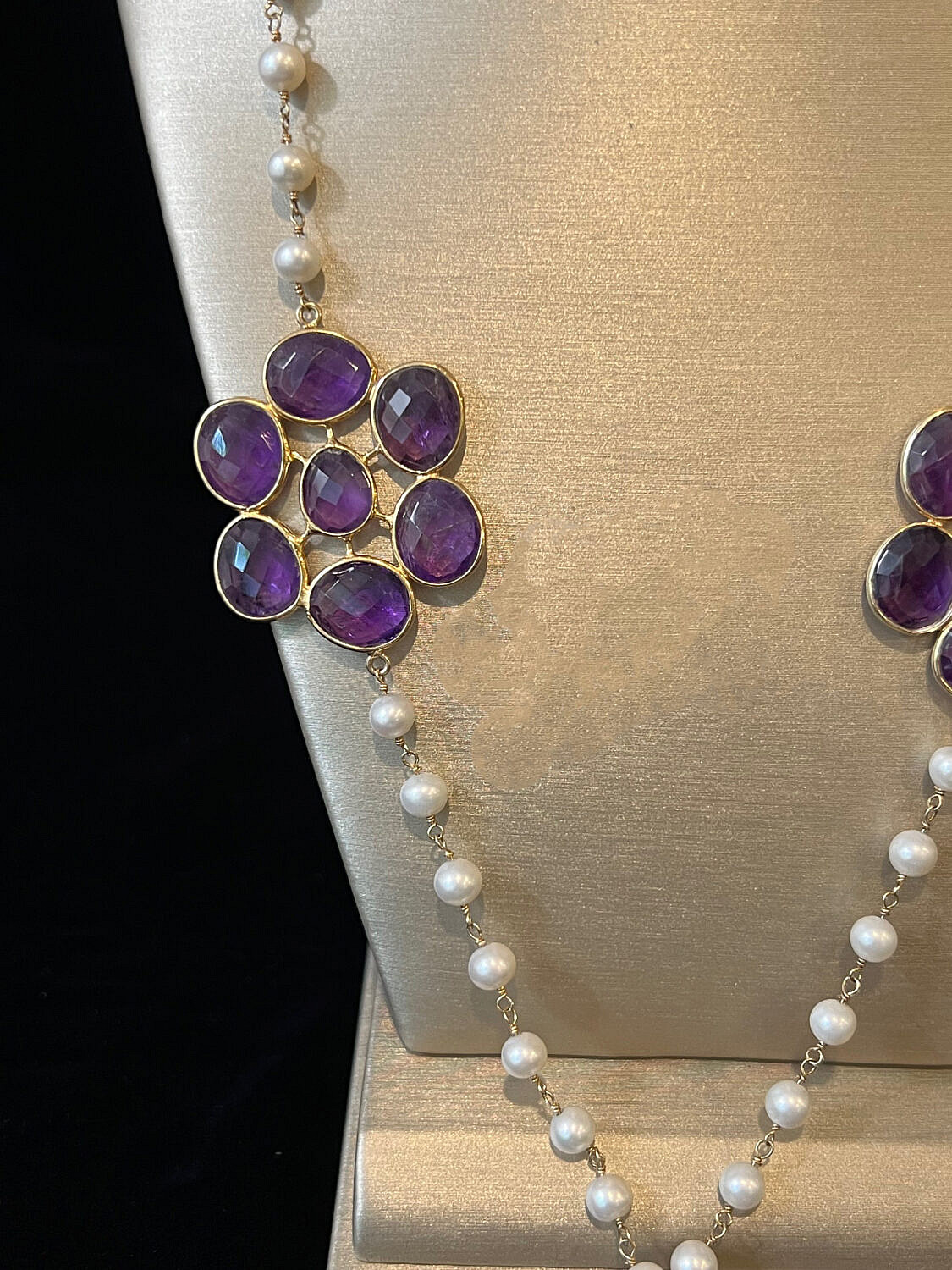 5.5mm White Fresh Water Pearl and Faceted Amethyst Cluster Sterling Silver Vermeil Necklace