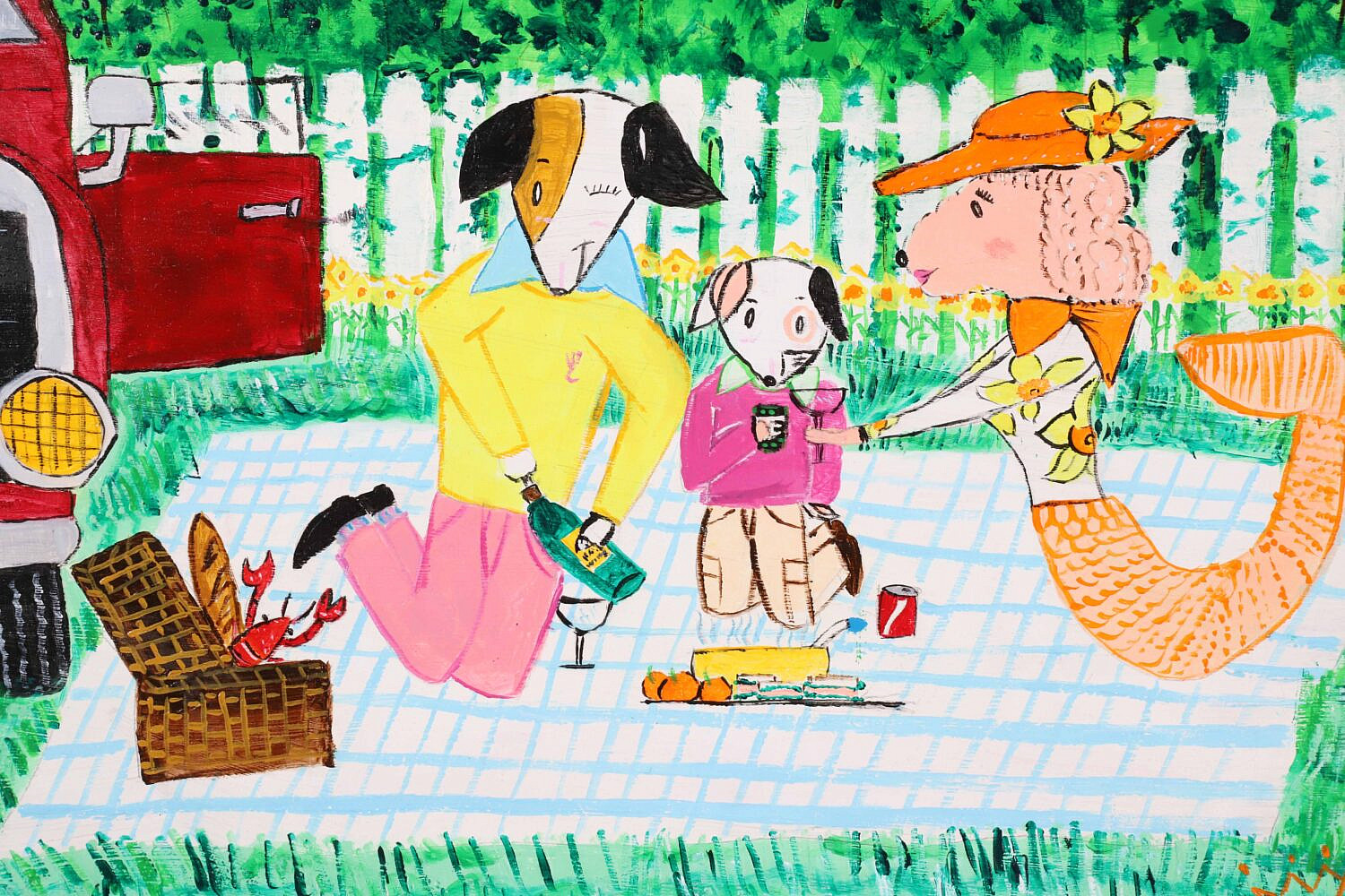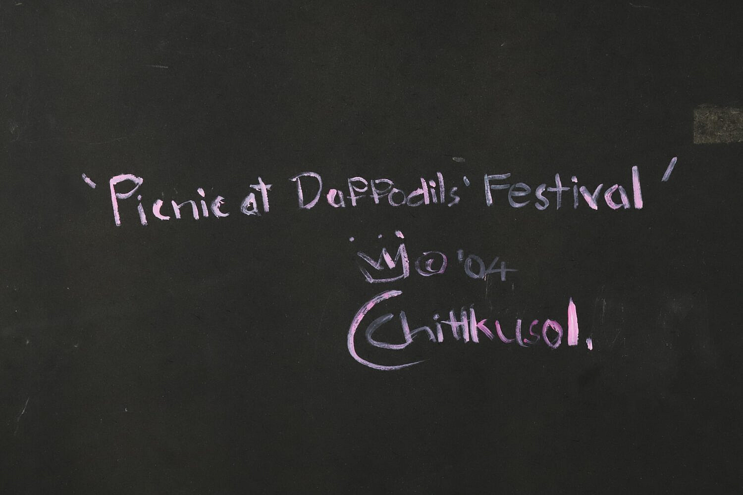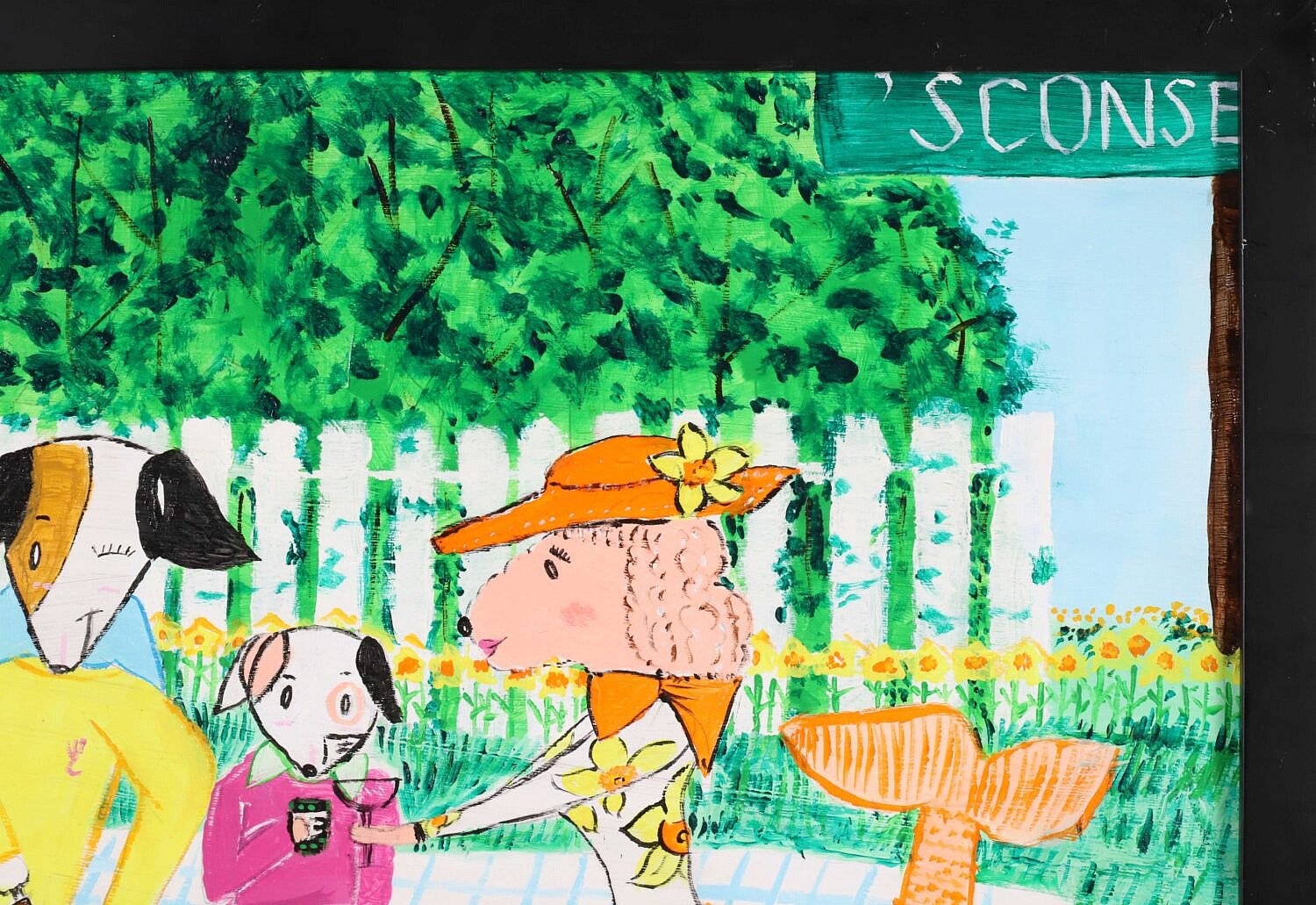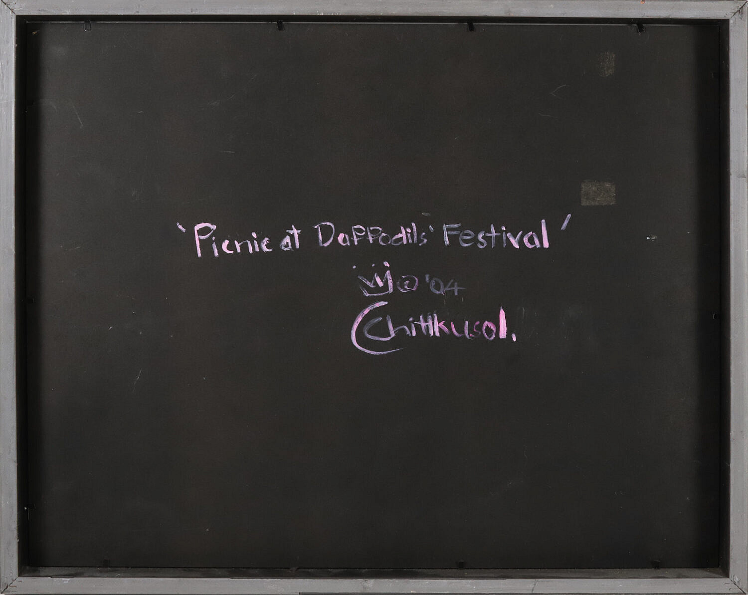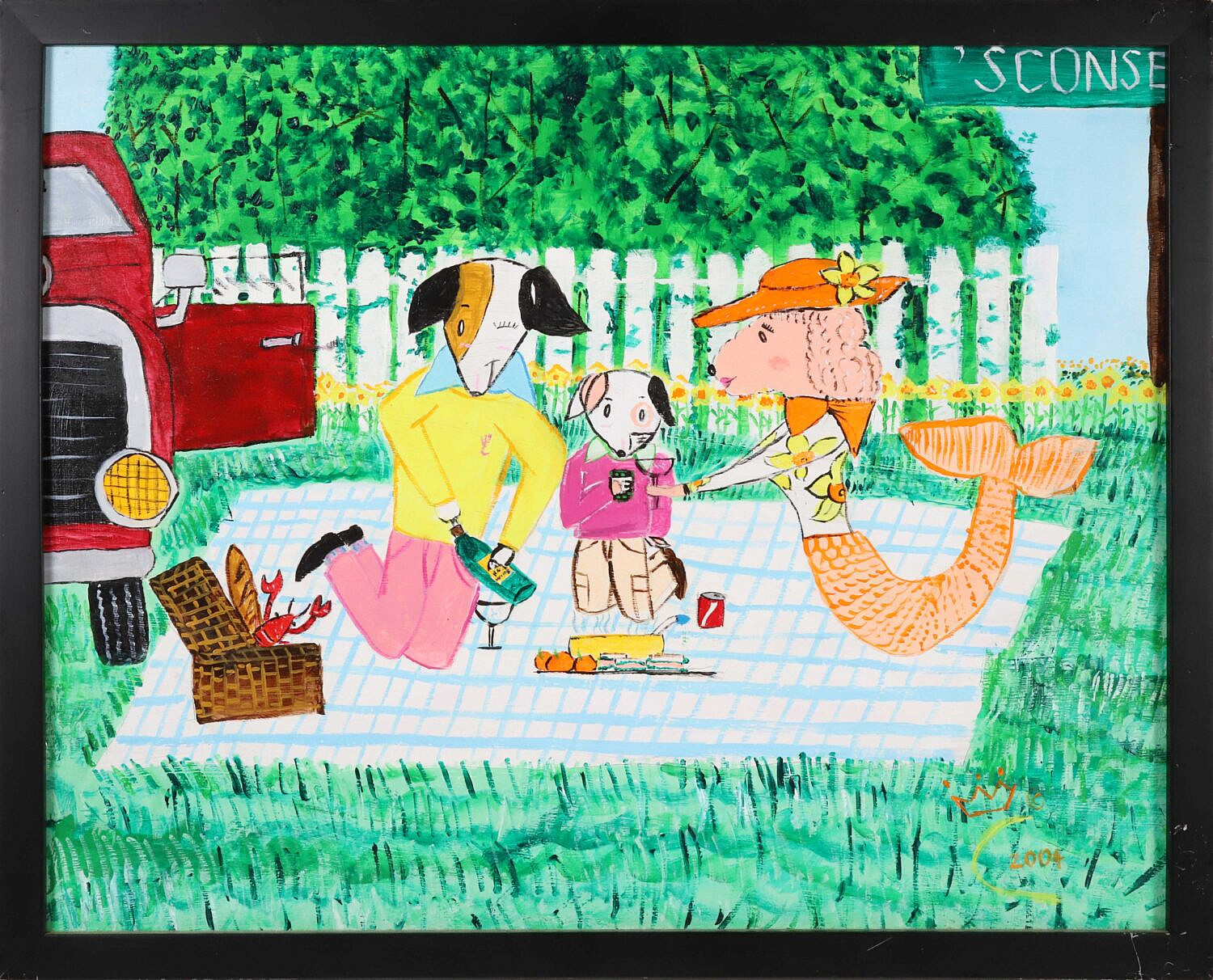 American Folk Art Oil on Canvas, “Picnic at Daffodil”, circa 2004, depicting a mermaid and dogs enjoying a tailgate picnic at the annual Nantucket Daffodil Parade, in flat black frame, monogrammed lower right and signed Chittkusol ’04 on reverse