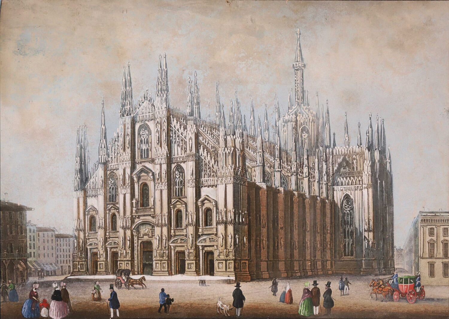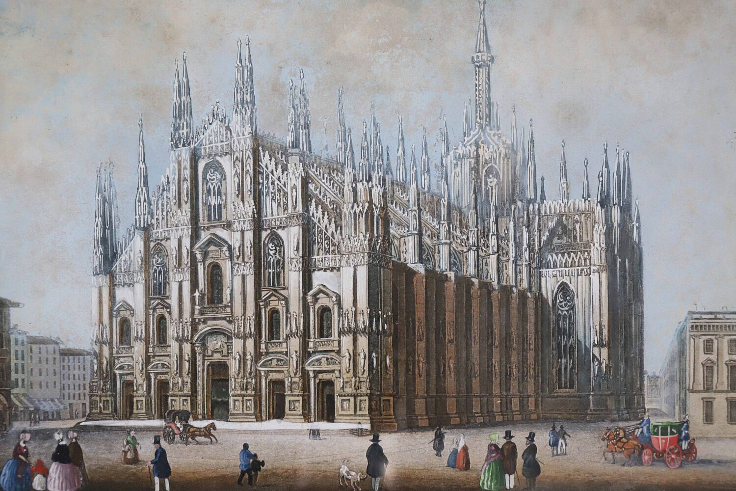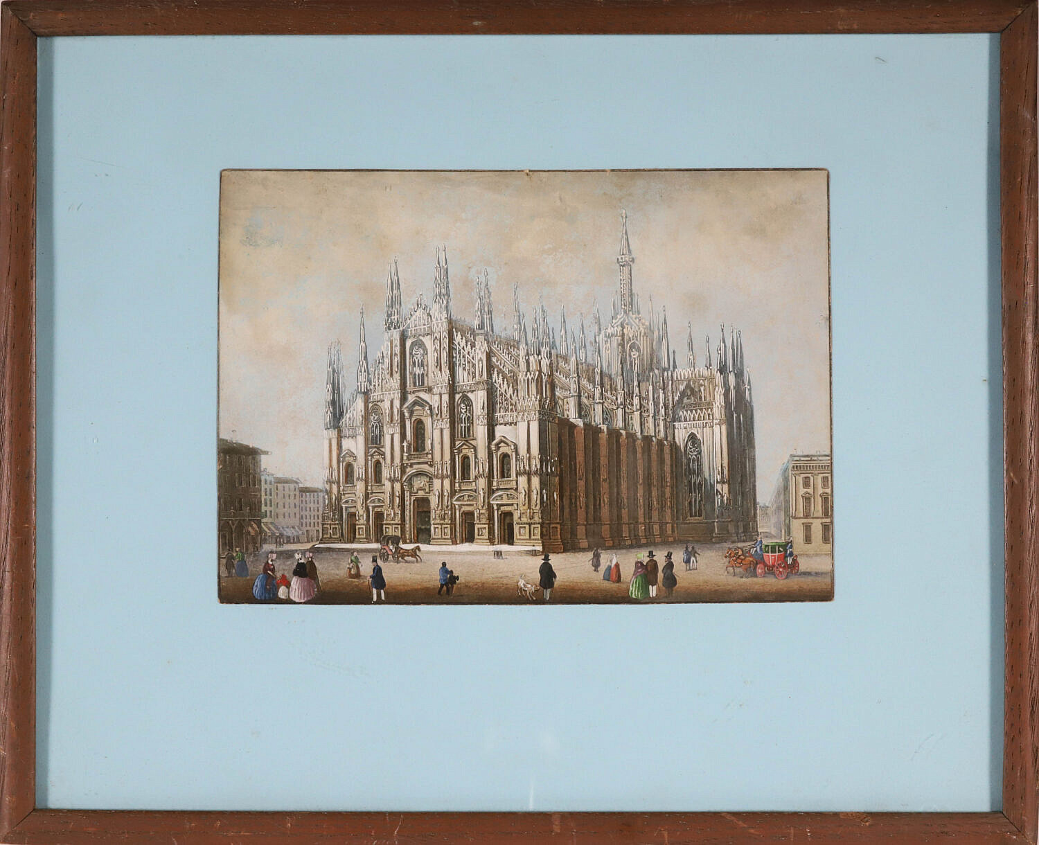 Colored Milan Cathedral Print, located on the Piazza del Duomo. Construction of the cathedral began in 1386 and took 5 centuries to complete. Matted and framed.