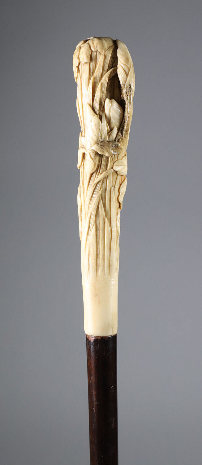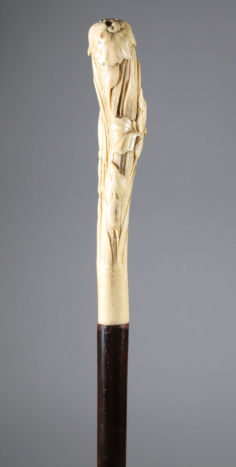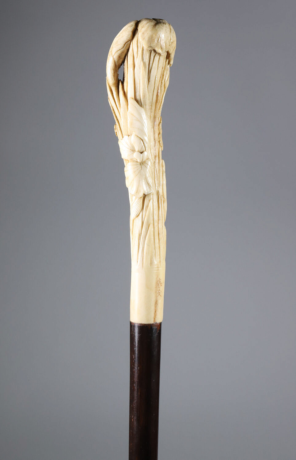 Antique Japanese Signed Walking Stick, 19th Century, with carved blooming iris grip on tropical wood shaft, ending with horn ferrule