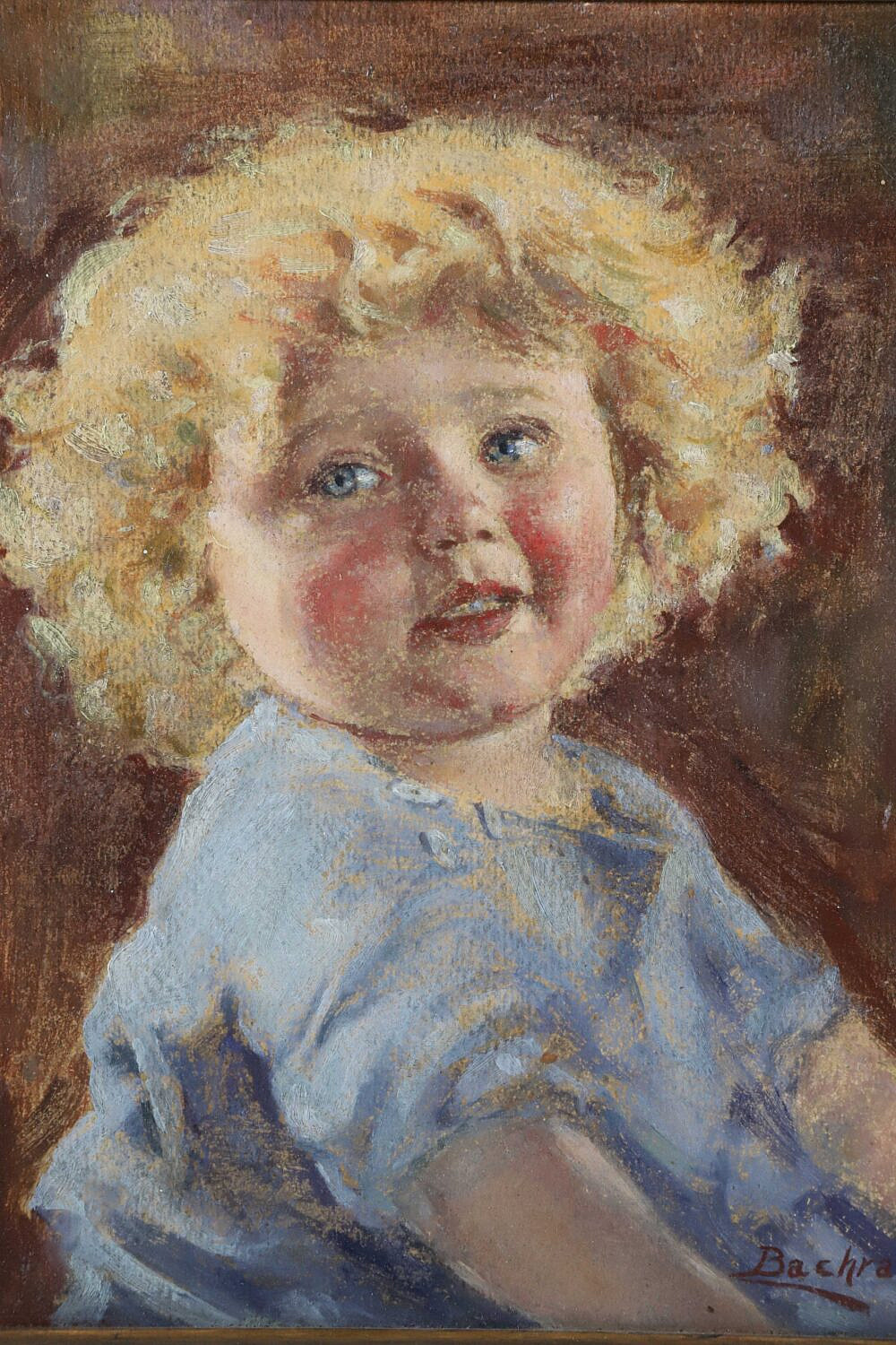 Bachrach Oil on Board Portrait “Girl With Blue Dress”, molded gilt wood frame, signed bottom right Bachrach