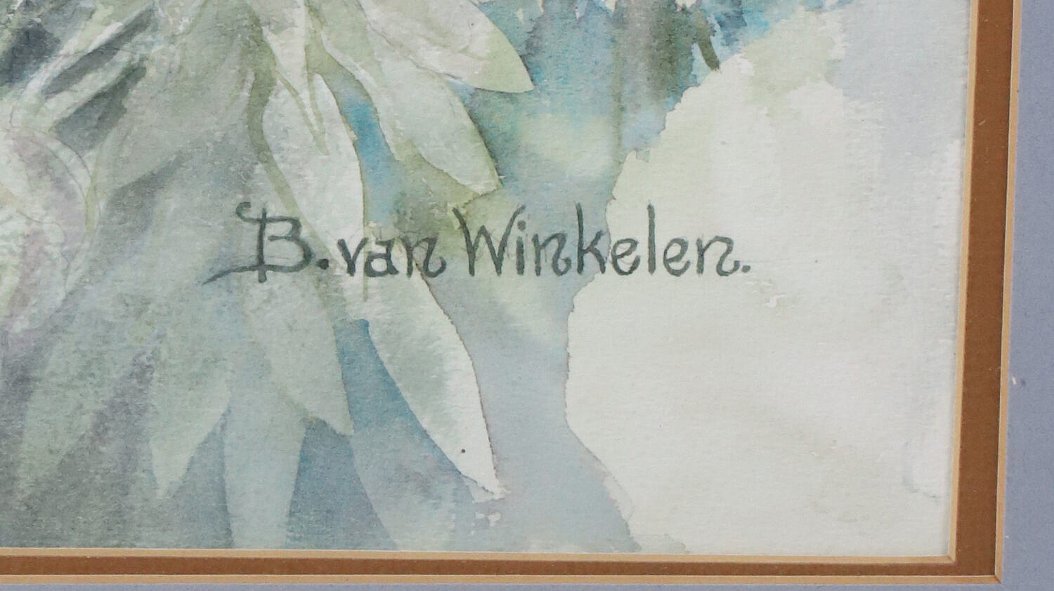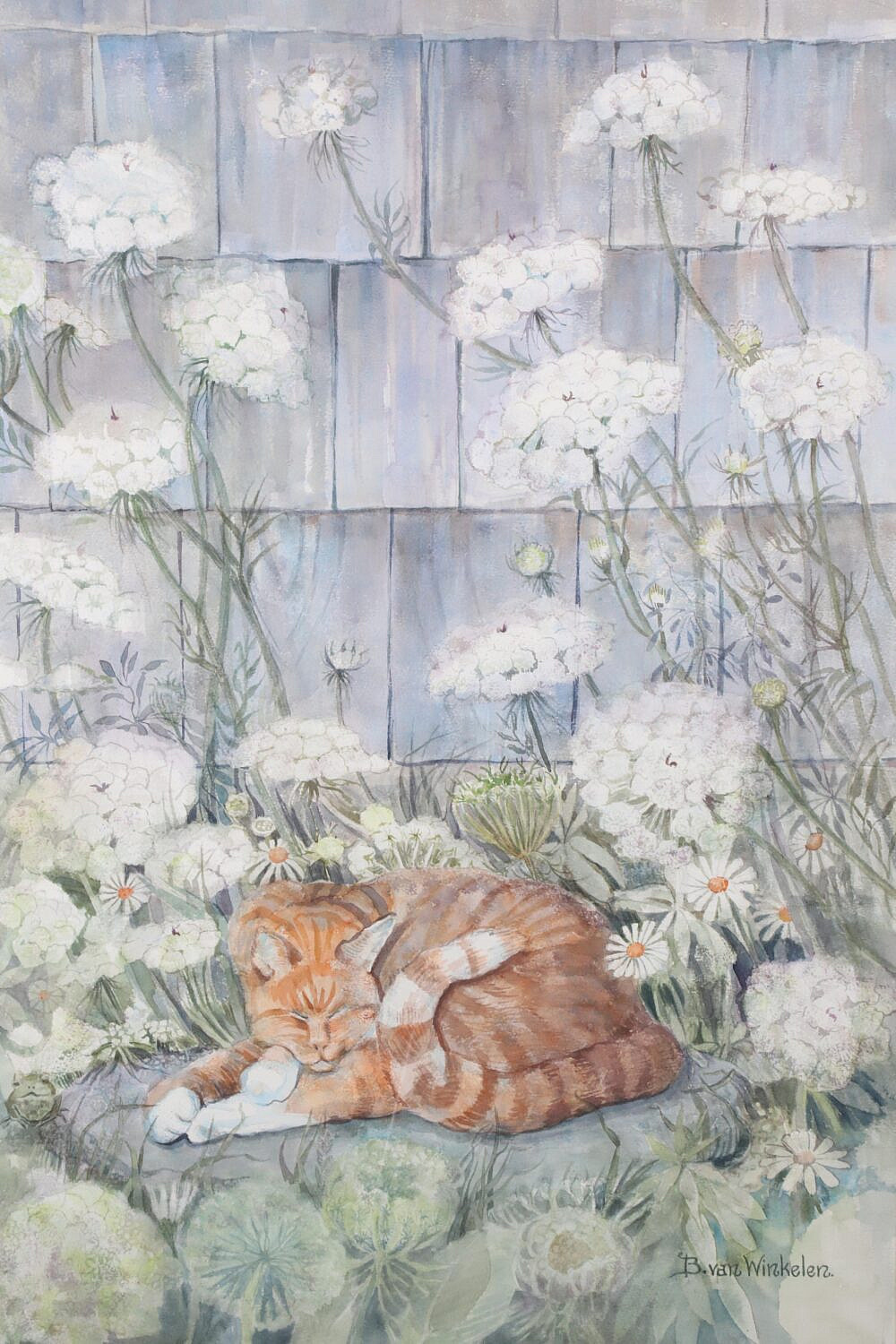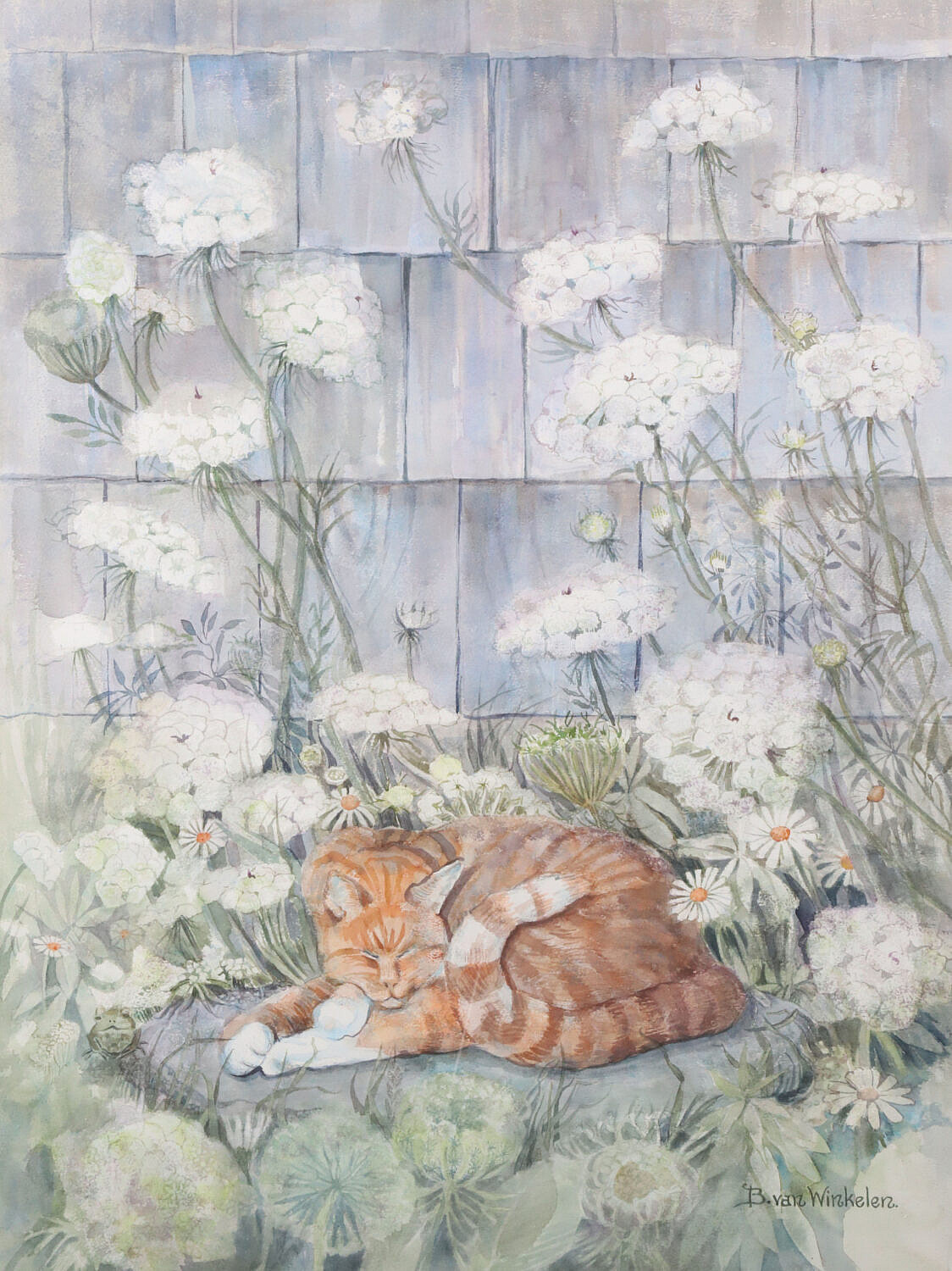 Barbara Van Winkelen Watercolor On Paper “Tabby Cat sleeping Amongst Queen Anne’s Lace”, signed lower right B. Van Winkelen, matted and framed