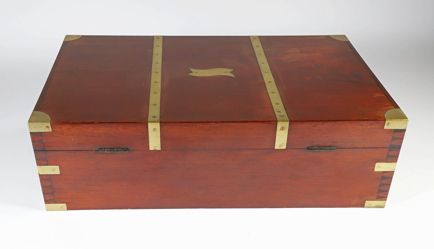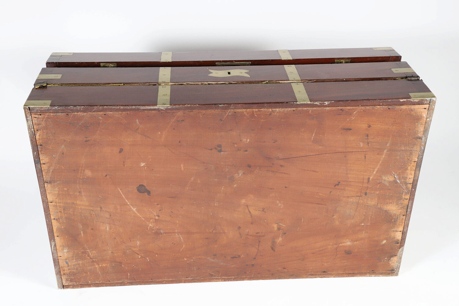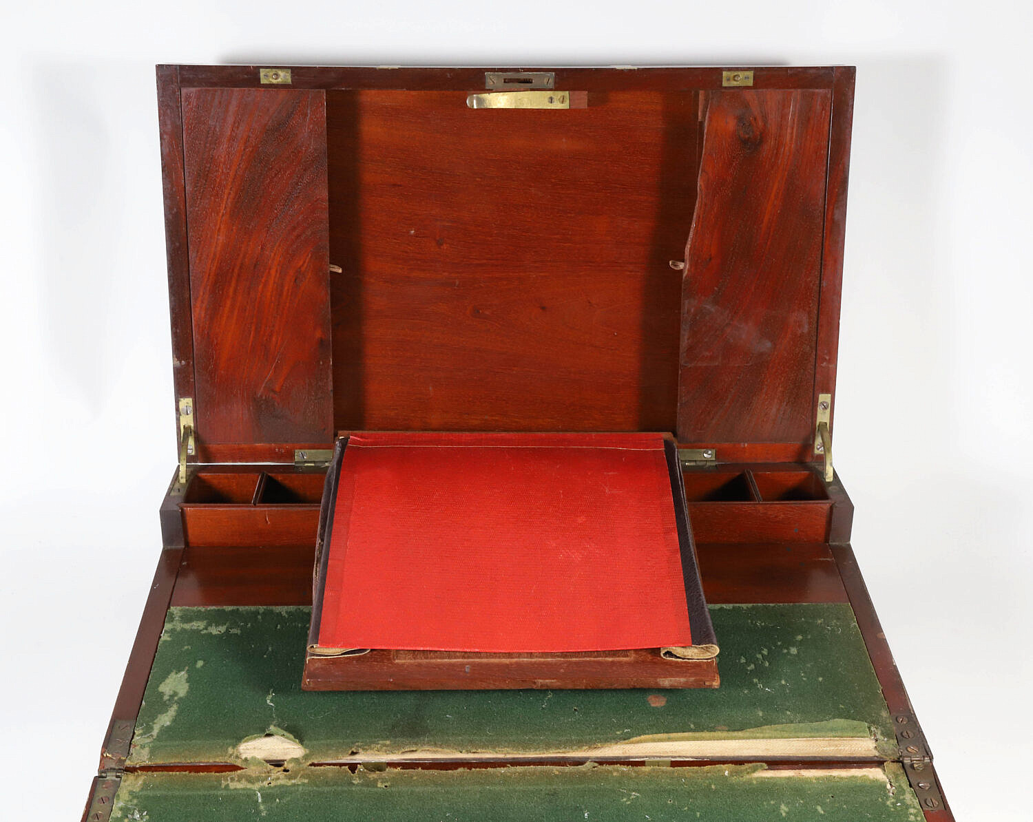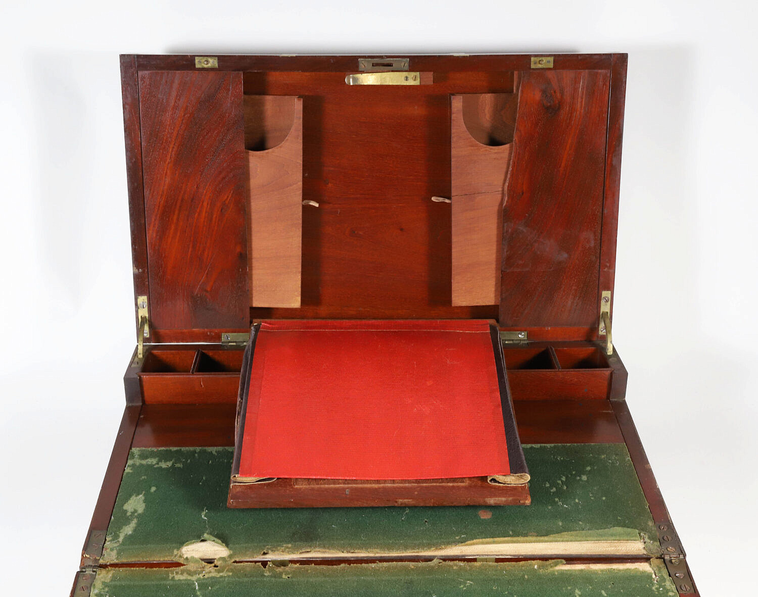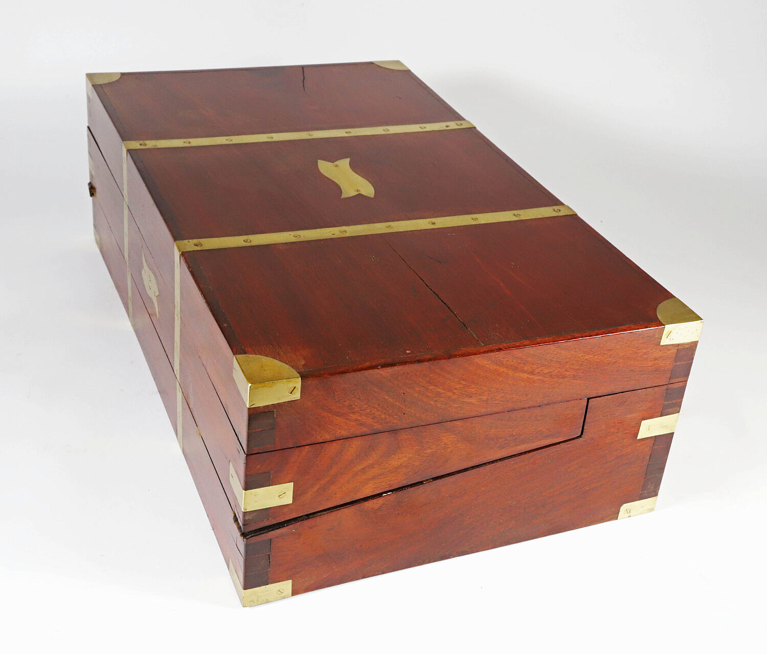 Brass Bound Dovetailed Mahogany Traveling Desk Box with Three Hidden Drawers, 19th Century