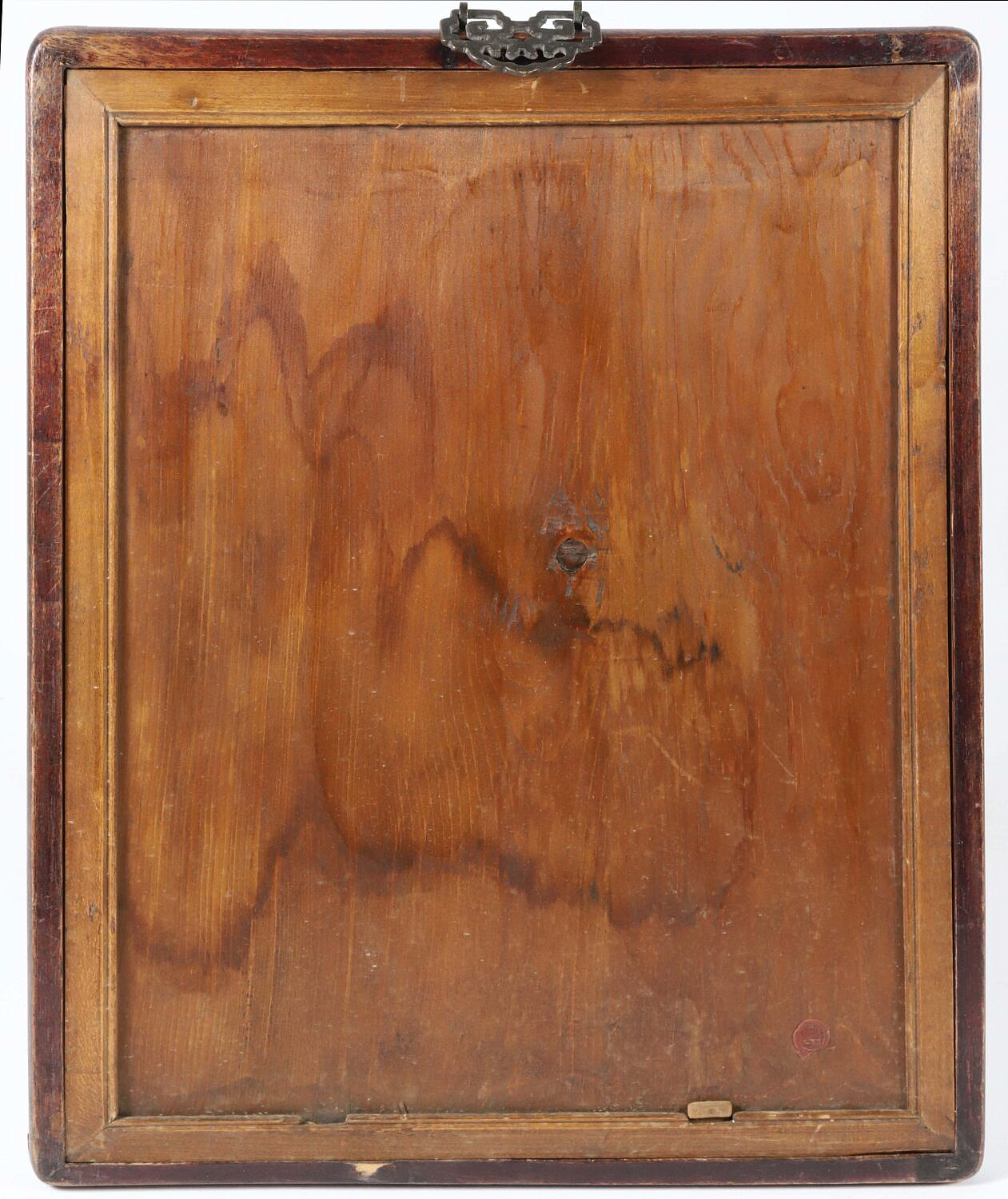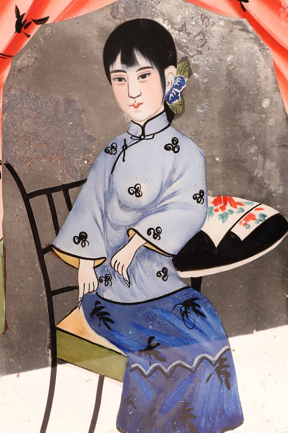 Chinese Reverse Painting on Mirror of a Geisha, in original teak frame and backing