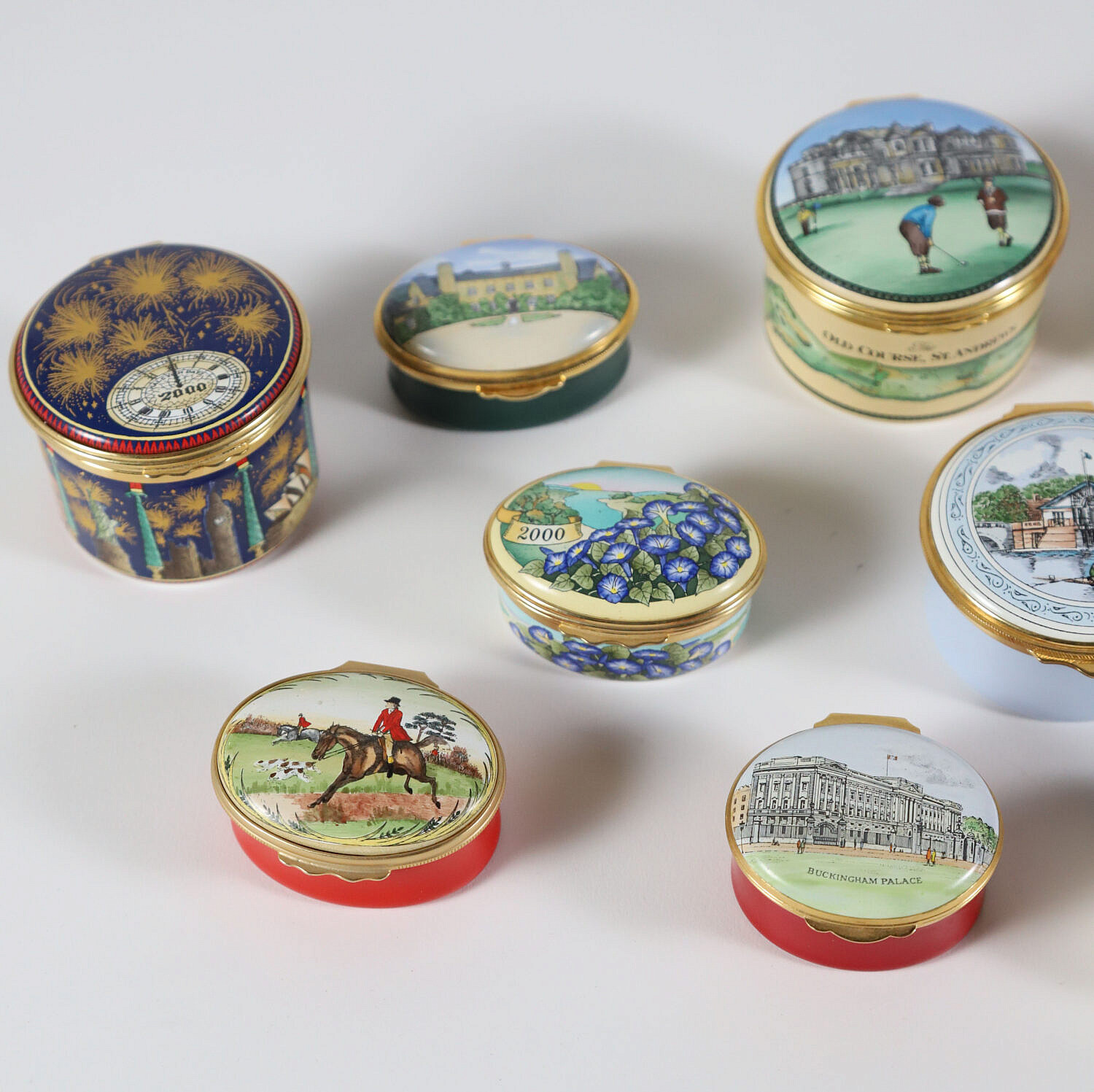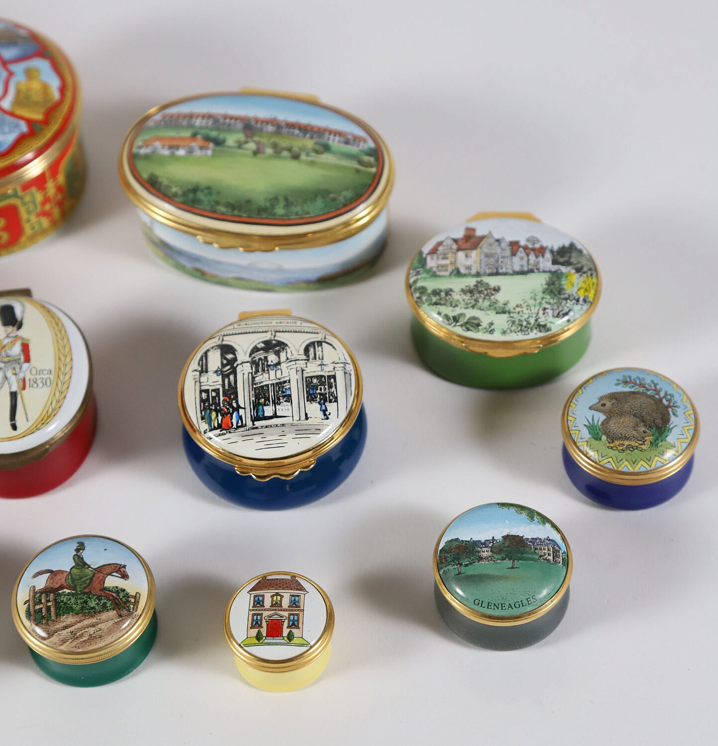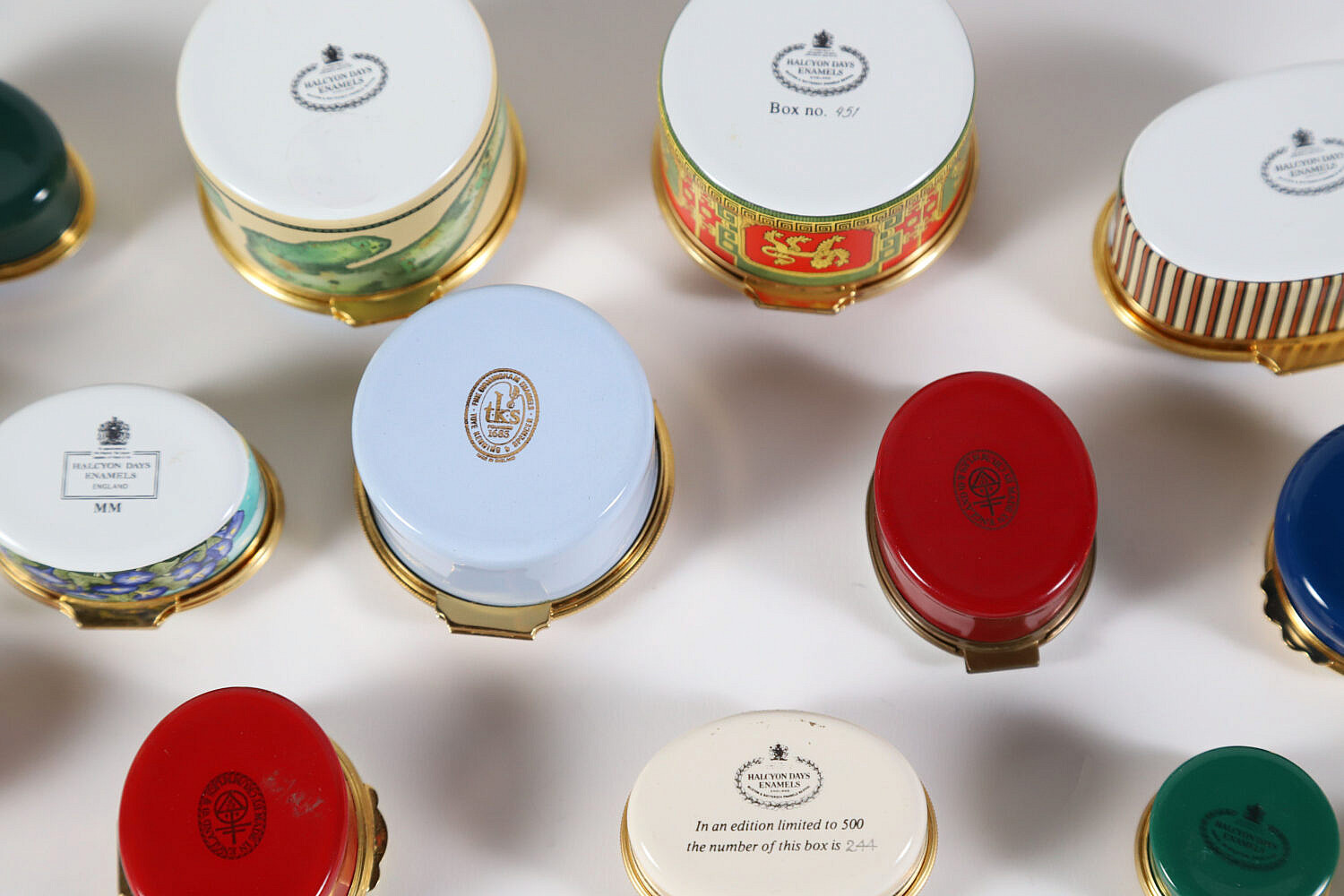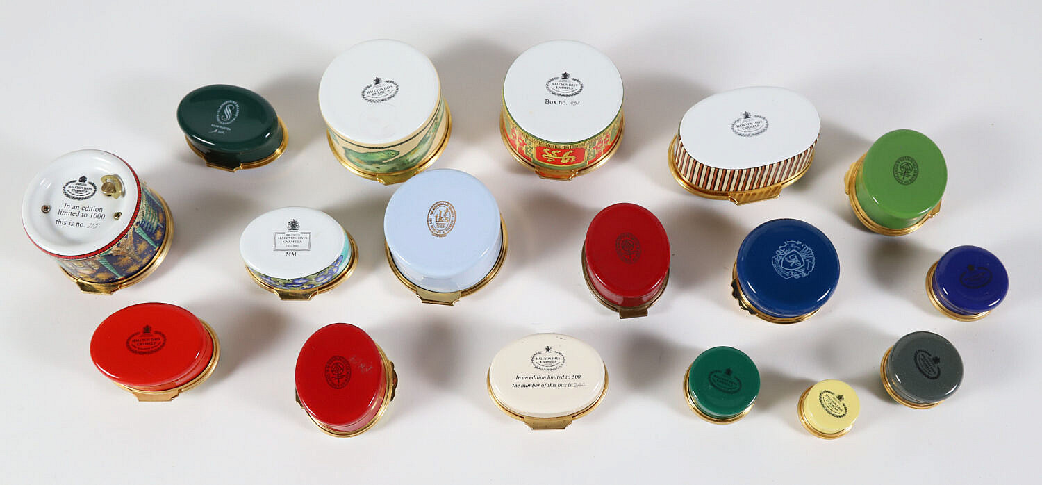 Collection of 17 English Halcyon Days Enamel Commemorative Boxes, 16 pill boxes and 1 music box