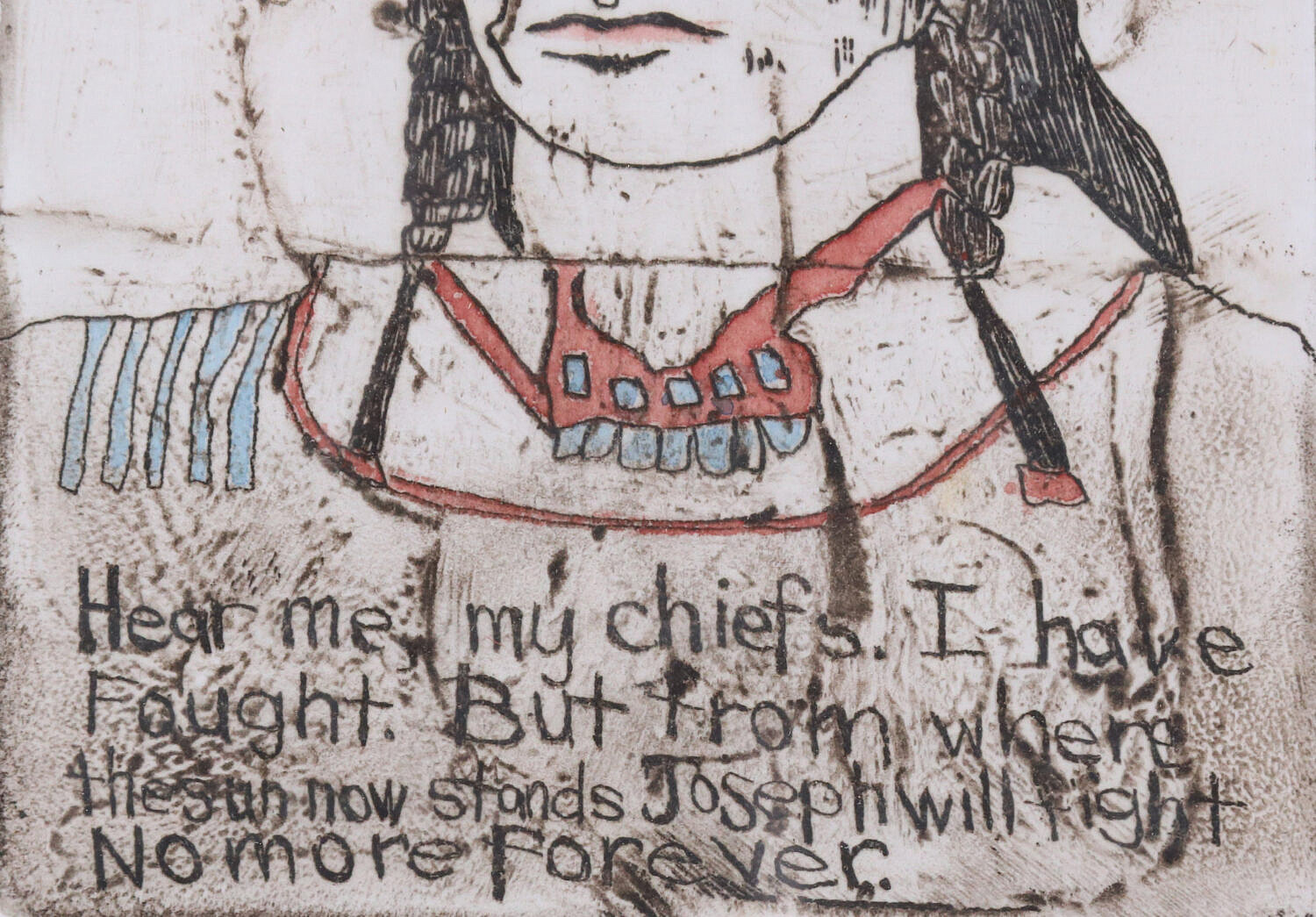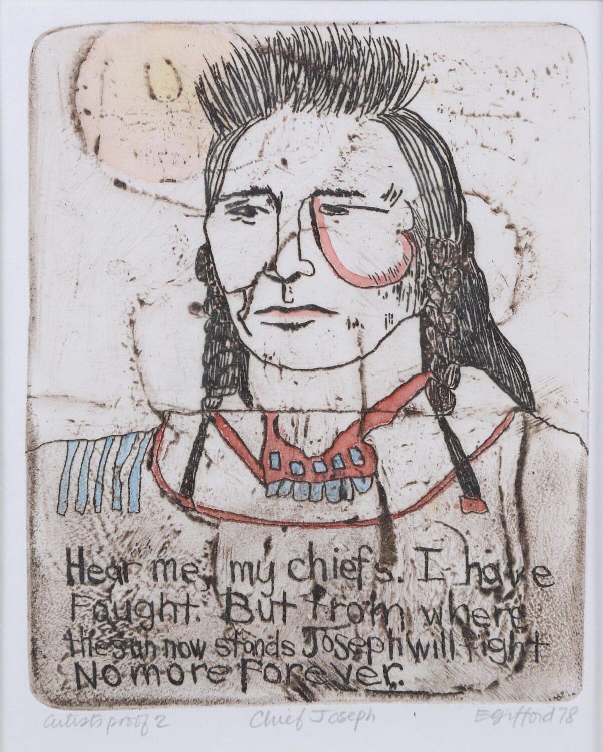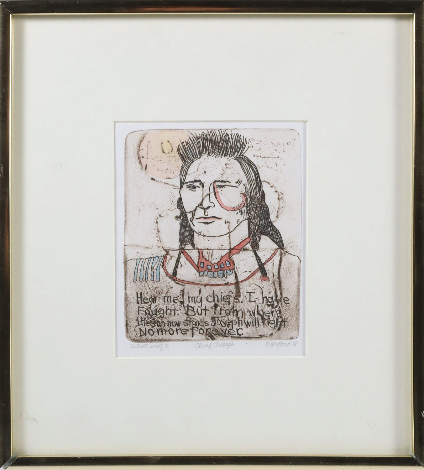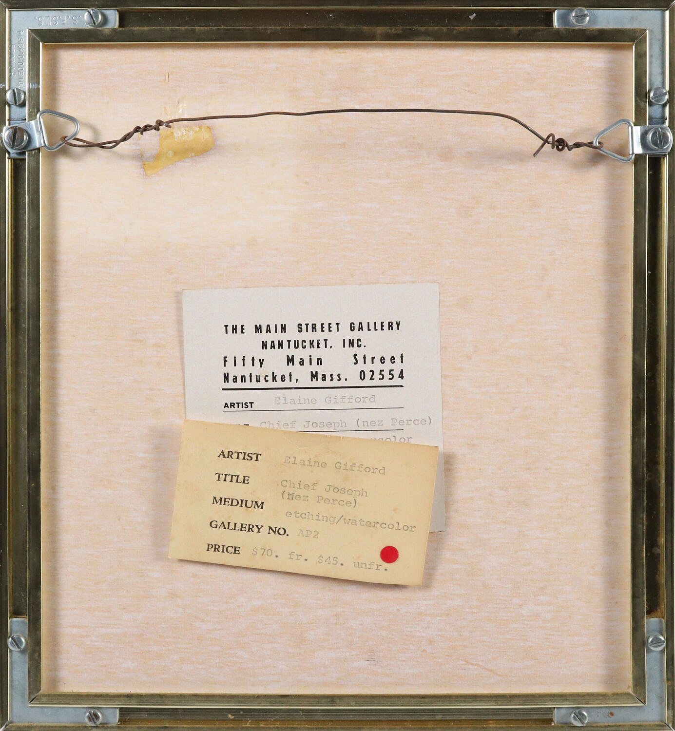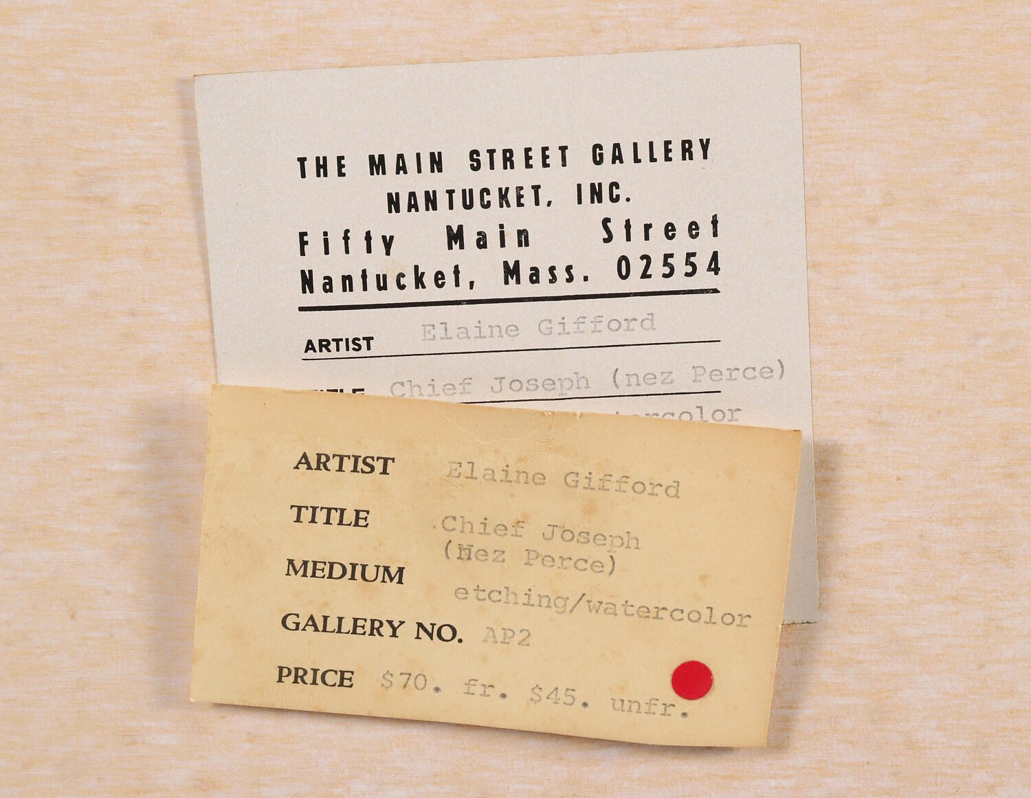 Elaine Gifford Etching and Watercolor Painting “Chief Joseph”, with original Main Street Gallery label on reverse, matted and framed. Gifford graduated from the Rhode Island School of Design in 1966 with a BFA and exhibited at The Main Street Gallery in the 1980s. She worked in intaglio printmaking for years and moved into monoprints and oils on paper as well as ceramics.