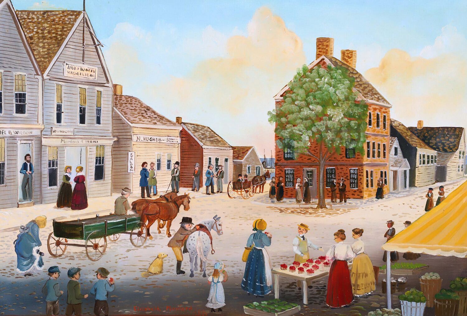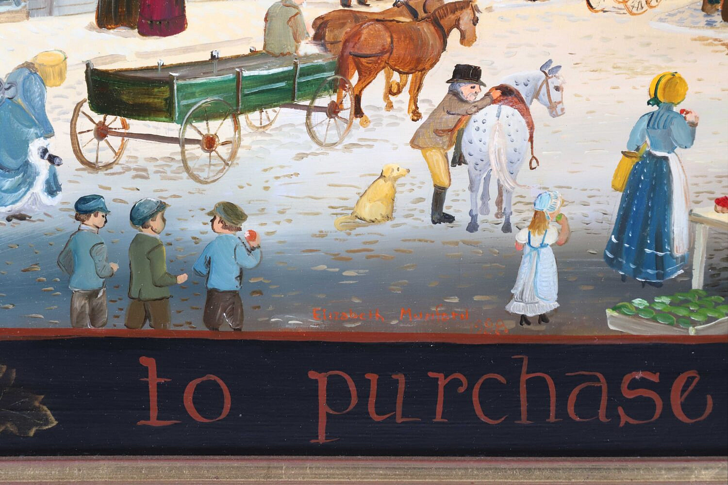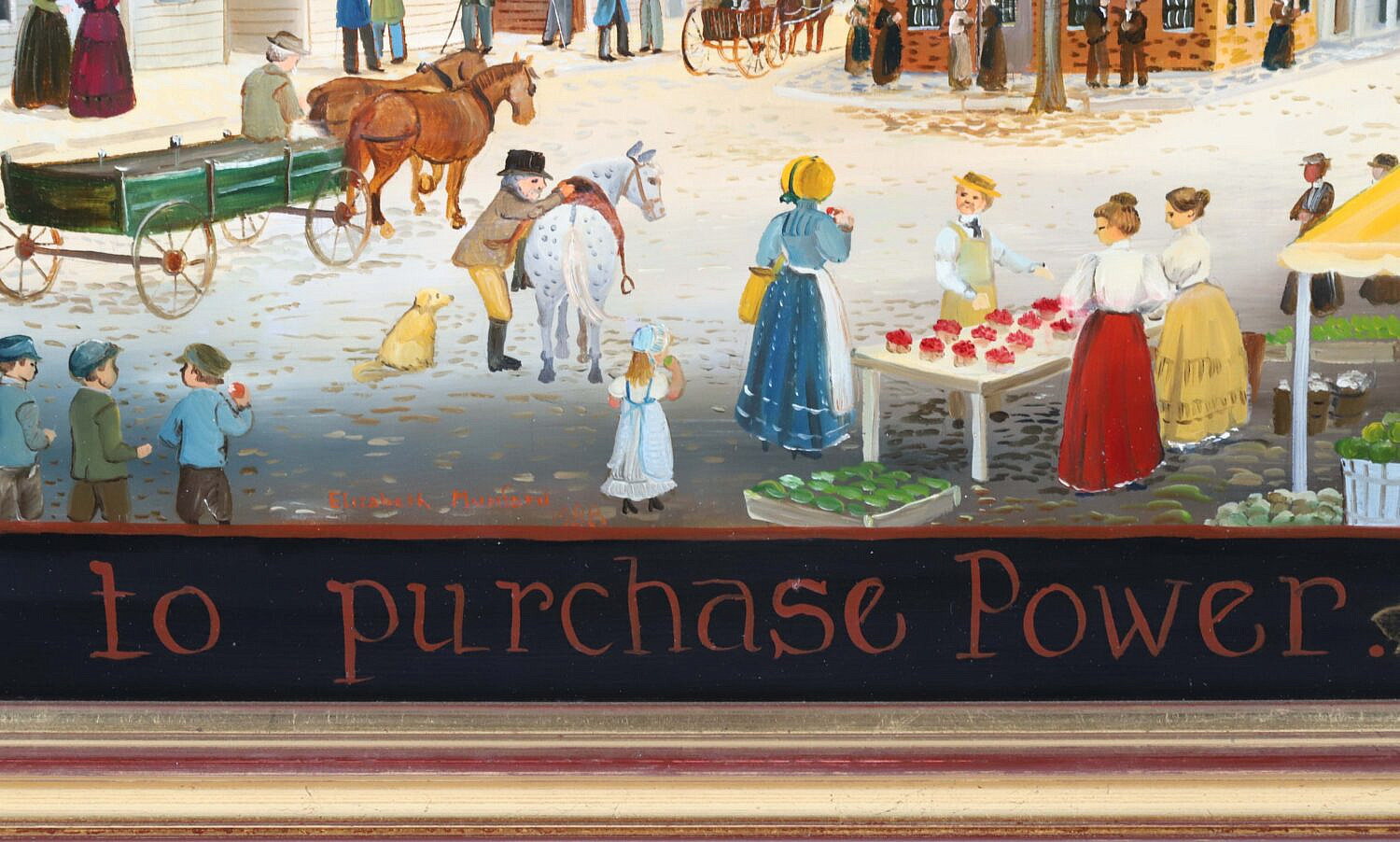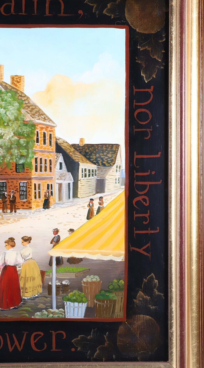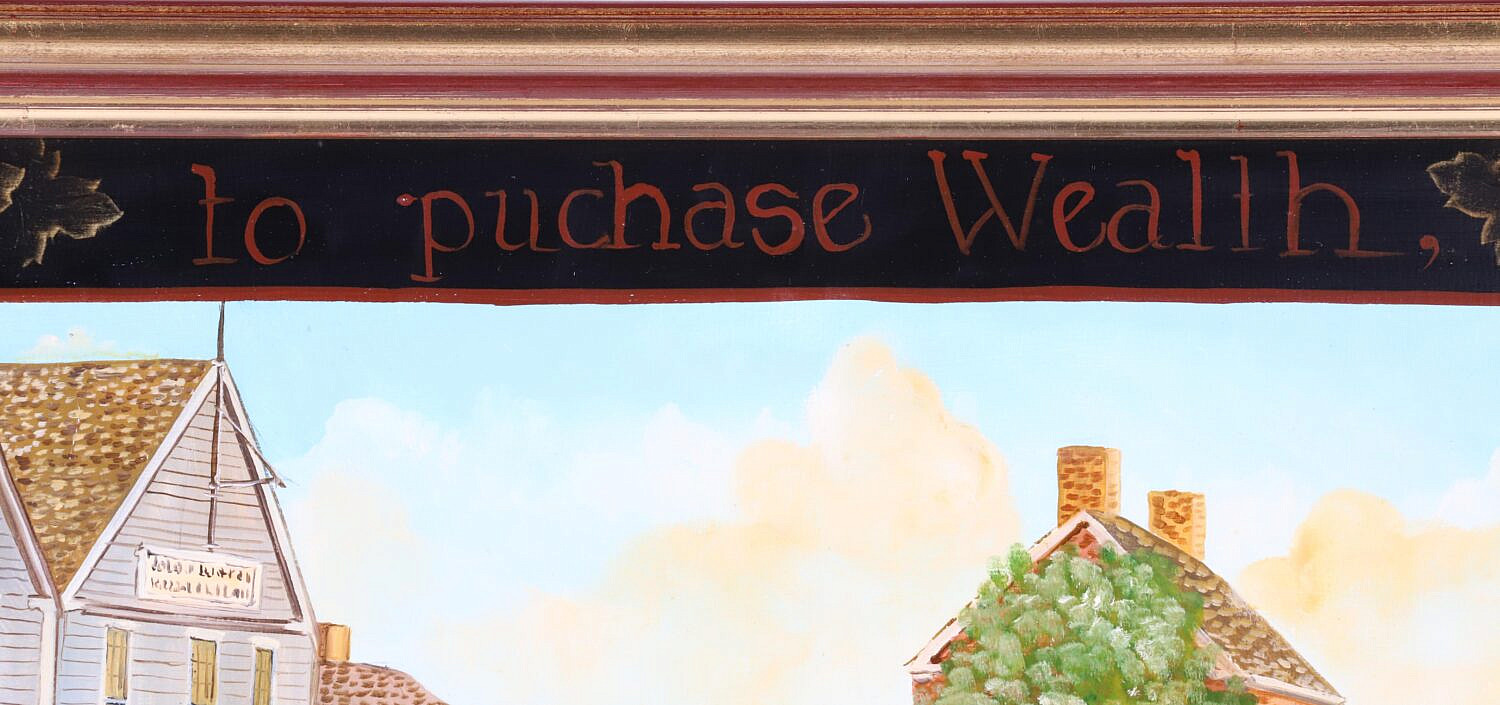 Elizabeth Mumford (1950-2020) Folk Art Oil on Board “Lower Main Street”, with surrounding legend: To Purchase Wealth, To Purchase Power, sell not virtue nor liberty, signed lower center Elizabeth Mumford 1988, in a molded gilt frame