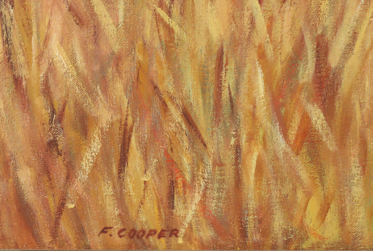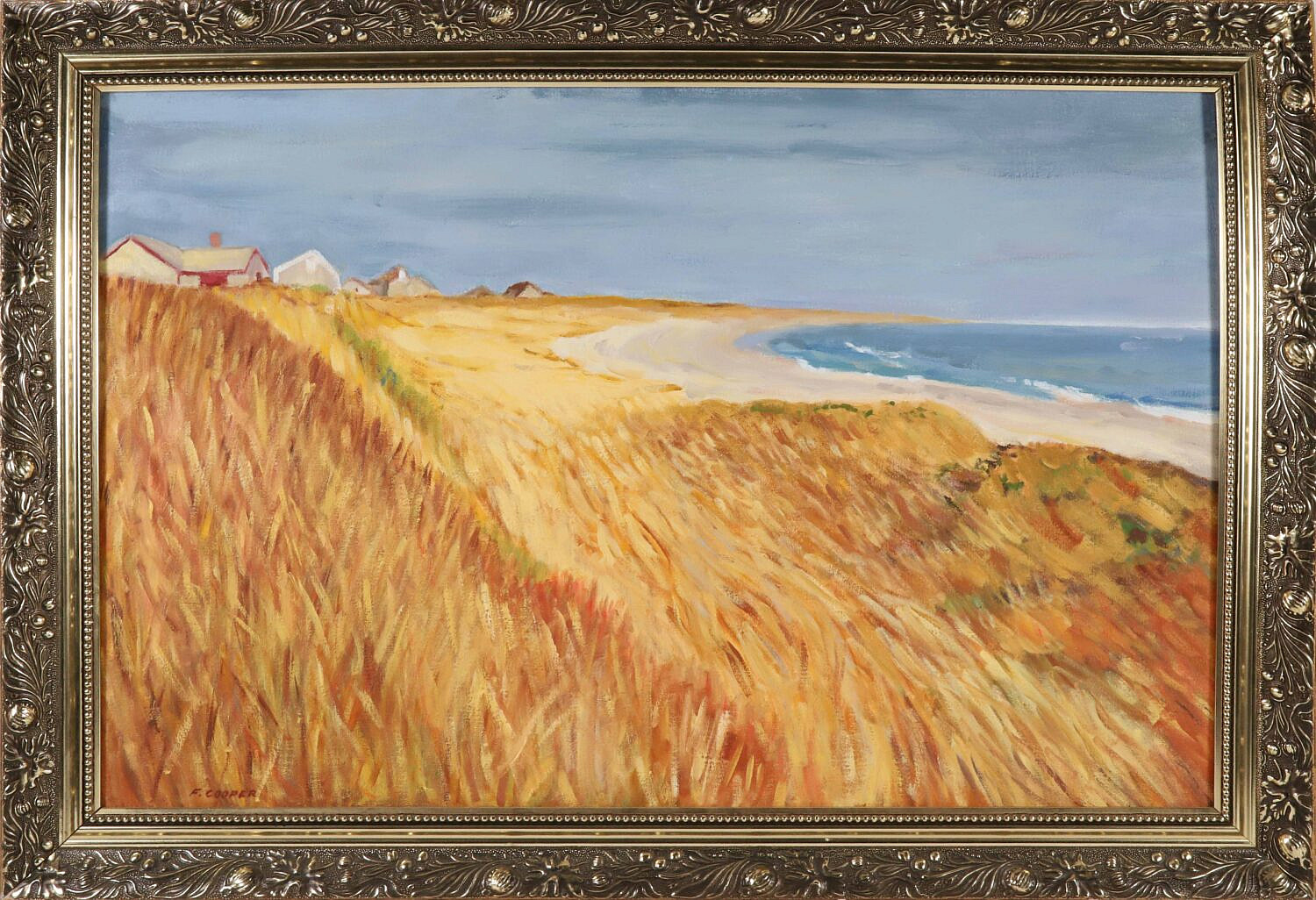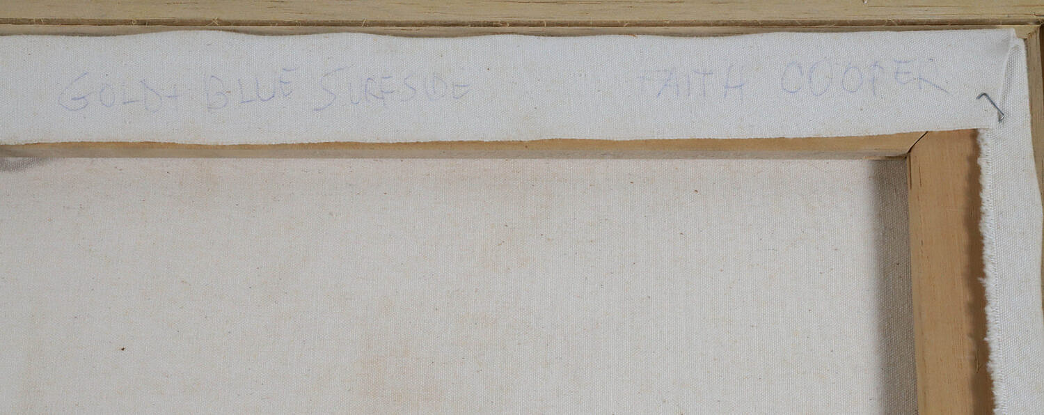 Faith Cooper Oil on Canvas “Gold and Blue Surfside”, signed lower left F. Cooper, in gilt frame