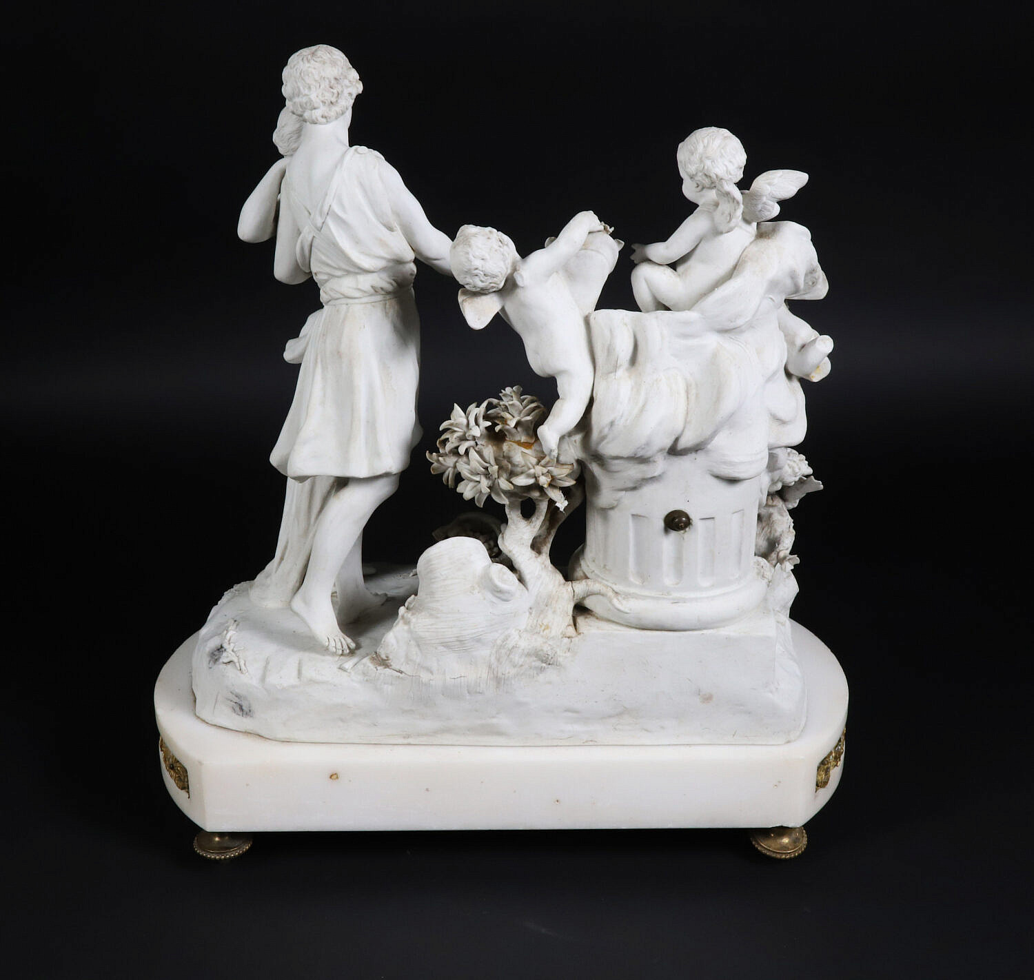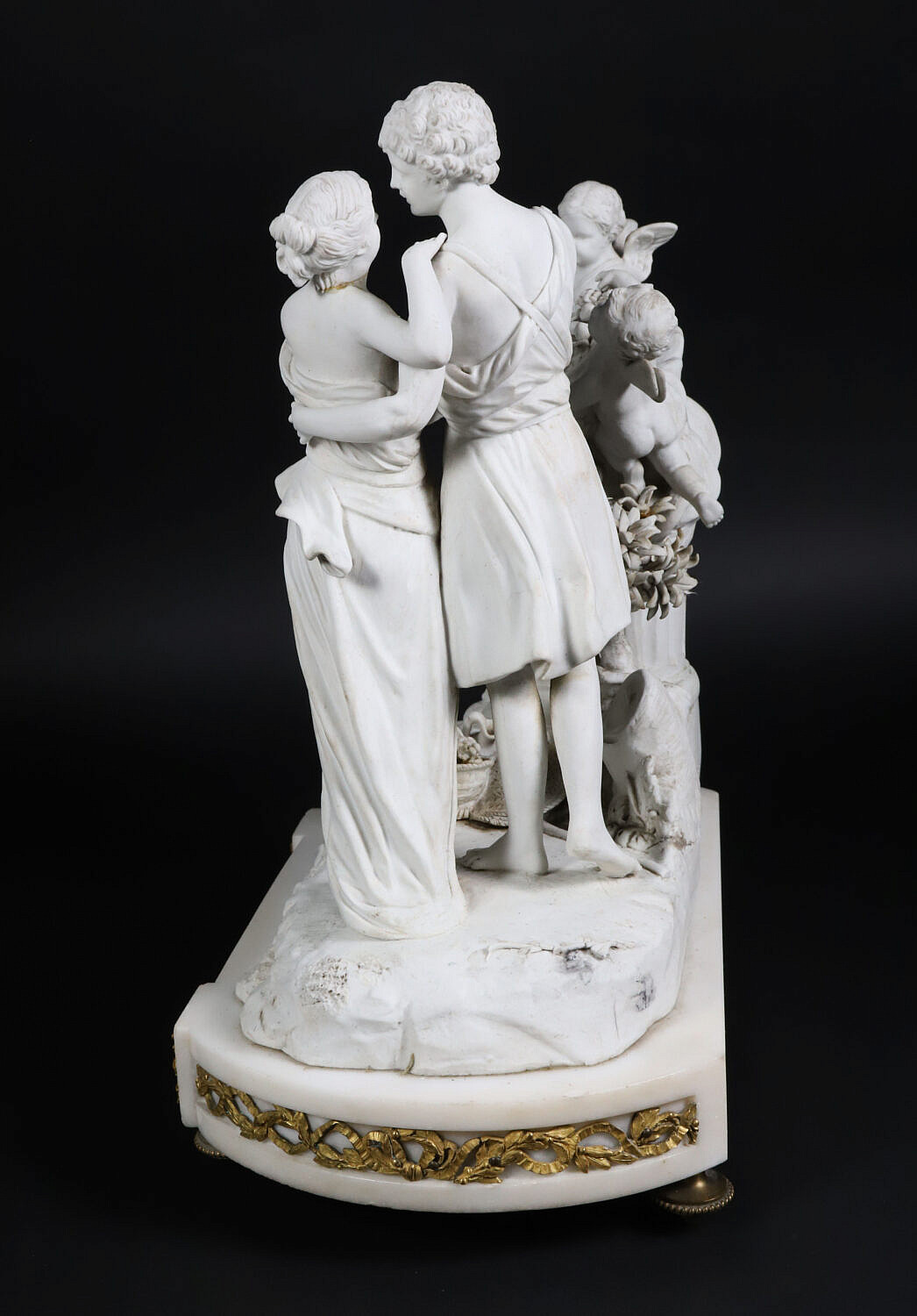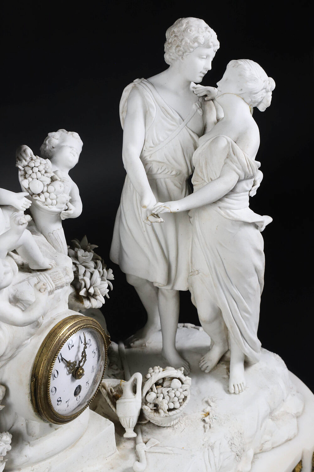 French Bisque and Marble Figural Mantel Clock, circa 1820-40, bisque romantic couple taking a pause from gathering fruits by a tree trunk, with bronze and enamel face clock, mounted with three cupids, bisque on marble with chased ormolu