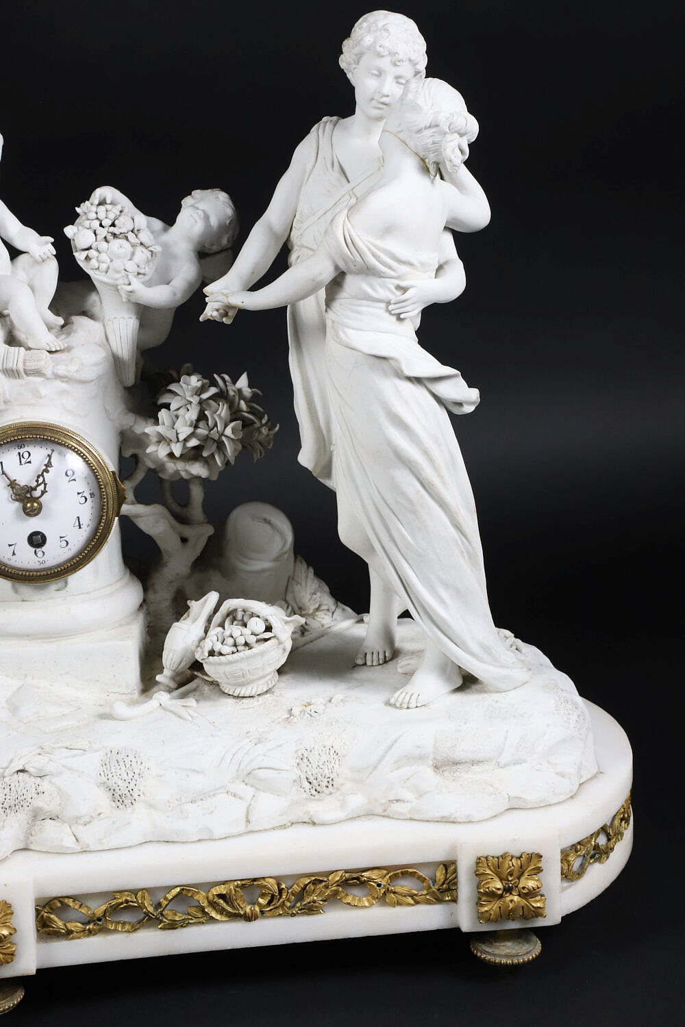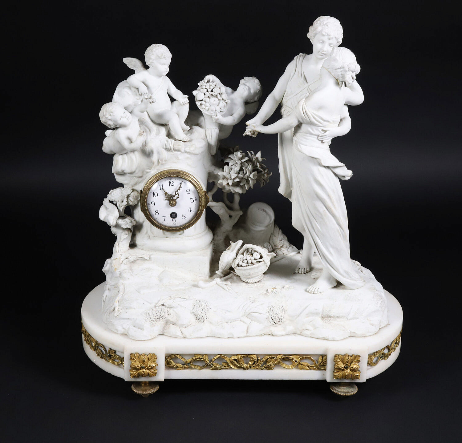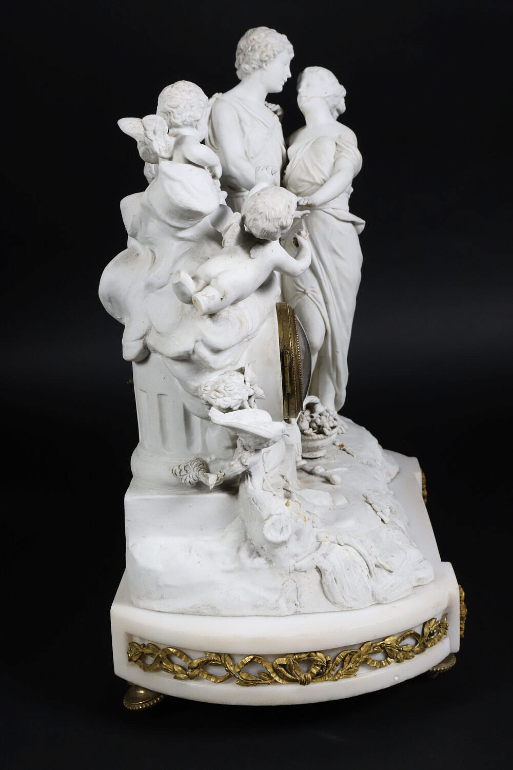 French Bisque and Marble Figural Mantel Clock, circa 1820-40, bisque romantic couple taking a pause from gathering fruits by a tree trunk, with bronze and enamel face clock, mounted with three cupids, bisque on marble with chased ormolu