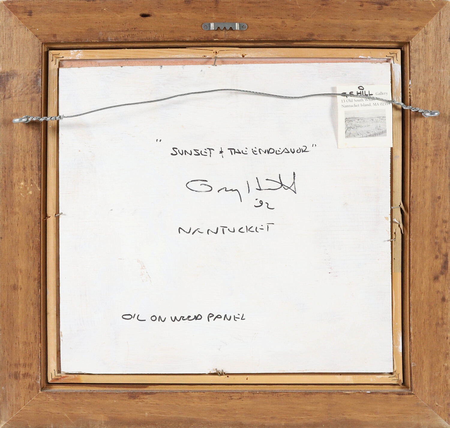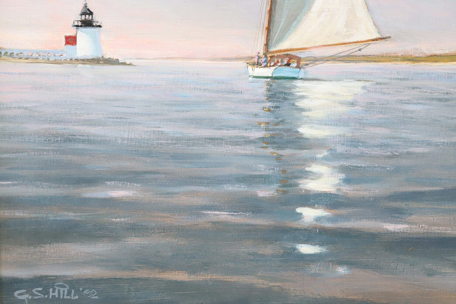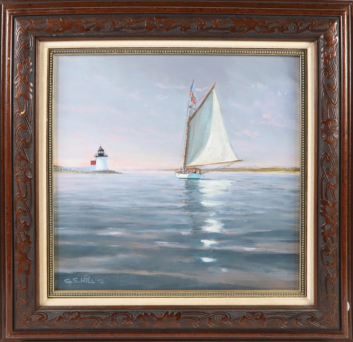 G.S. Hill (b. 1944) Oil On Panel “Sunset And The Endeavour Rounding Brant Point”, signed and dated lower left and on reverse, in carved wood frame