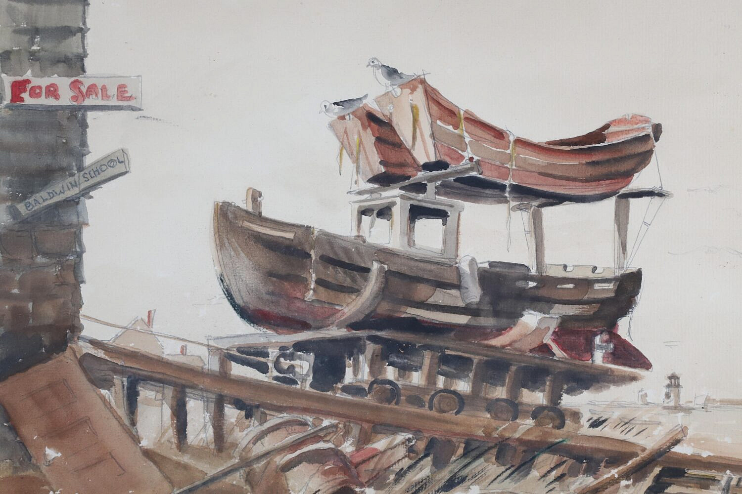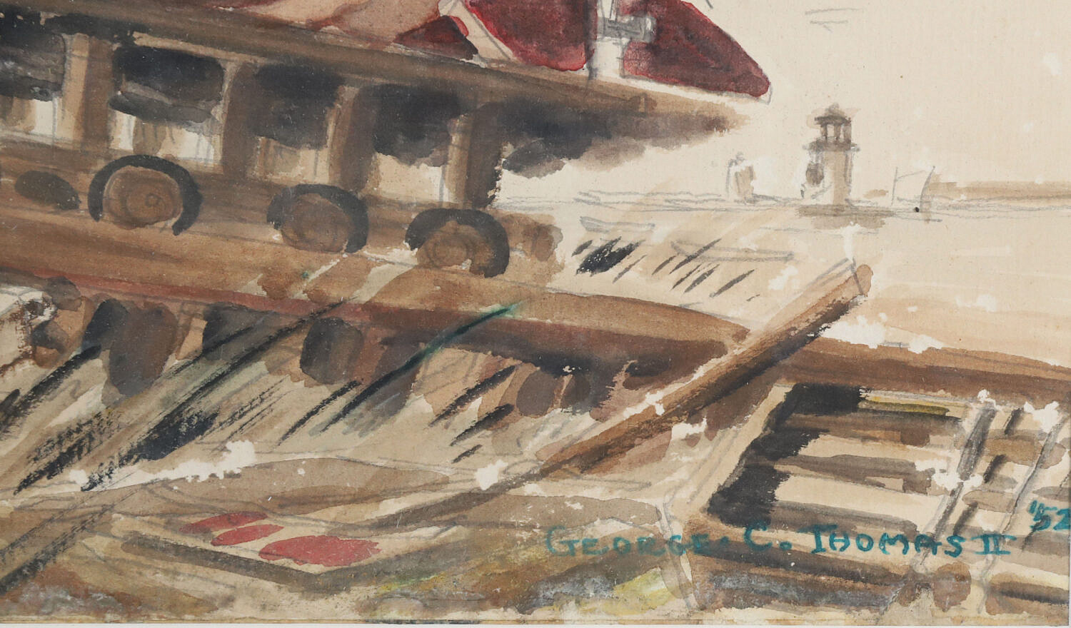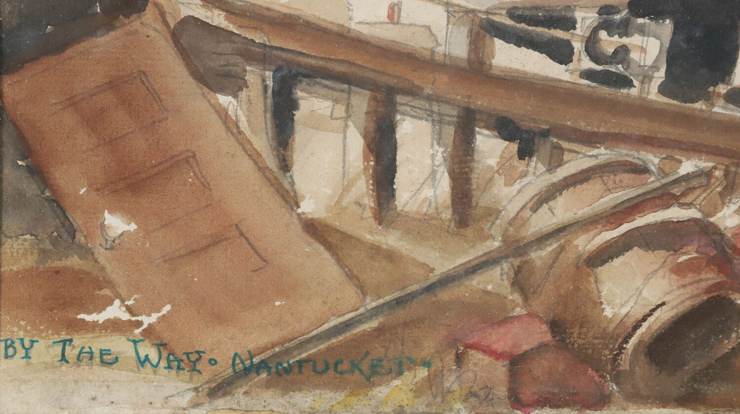 George C. Thomas II (1934-2020) Watercolor on Paper View of Boatyard “By the Way Nantucket”, signed lower right George C. Thomas II ’52, matted and framed