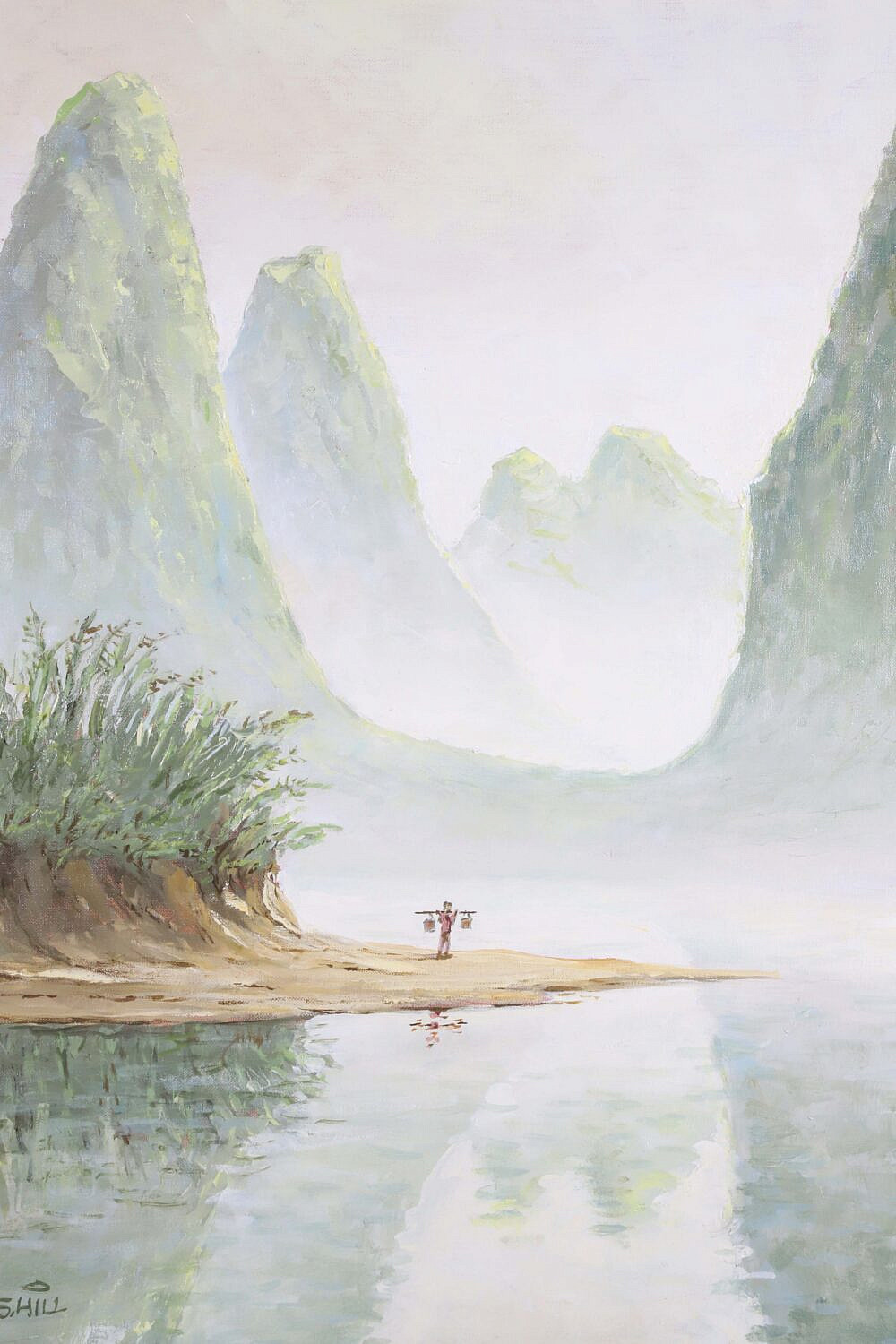G. S. Hill (Americana b. 1944) Oil on Linen “Li River I China”, signed lower left G.S. Hill, 2011 in flat gilt frame