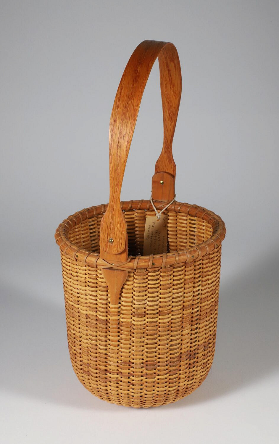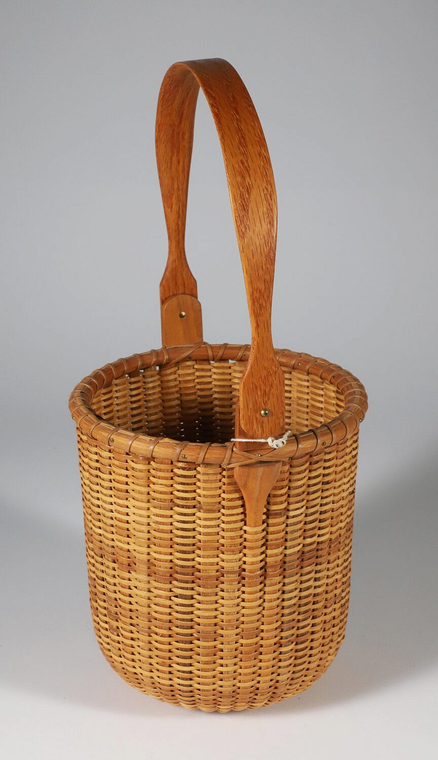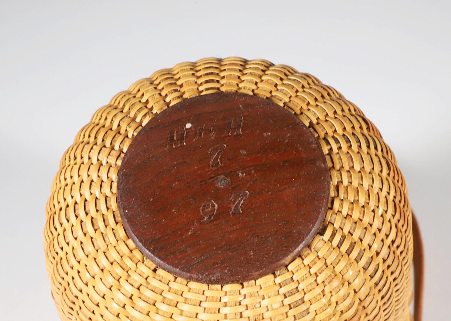 Harold Hoffman Swing Handle Nantucket Basket, circa 1997, deep form with oak handle, walnut base, engraved base H. E. H., Harold Hoffman #7- 97