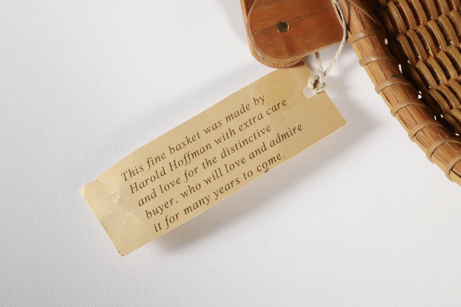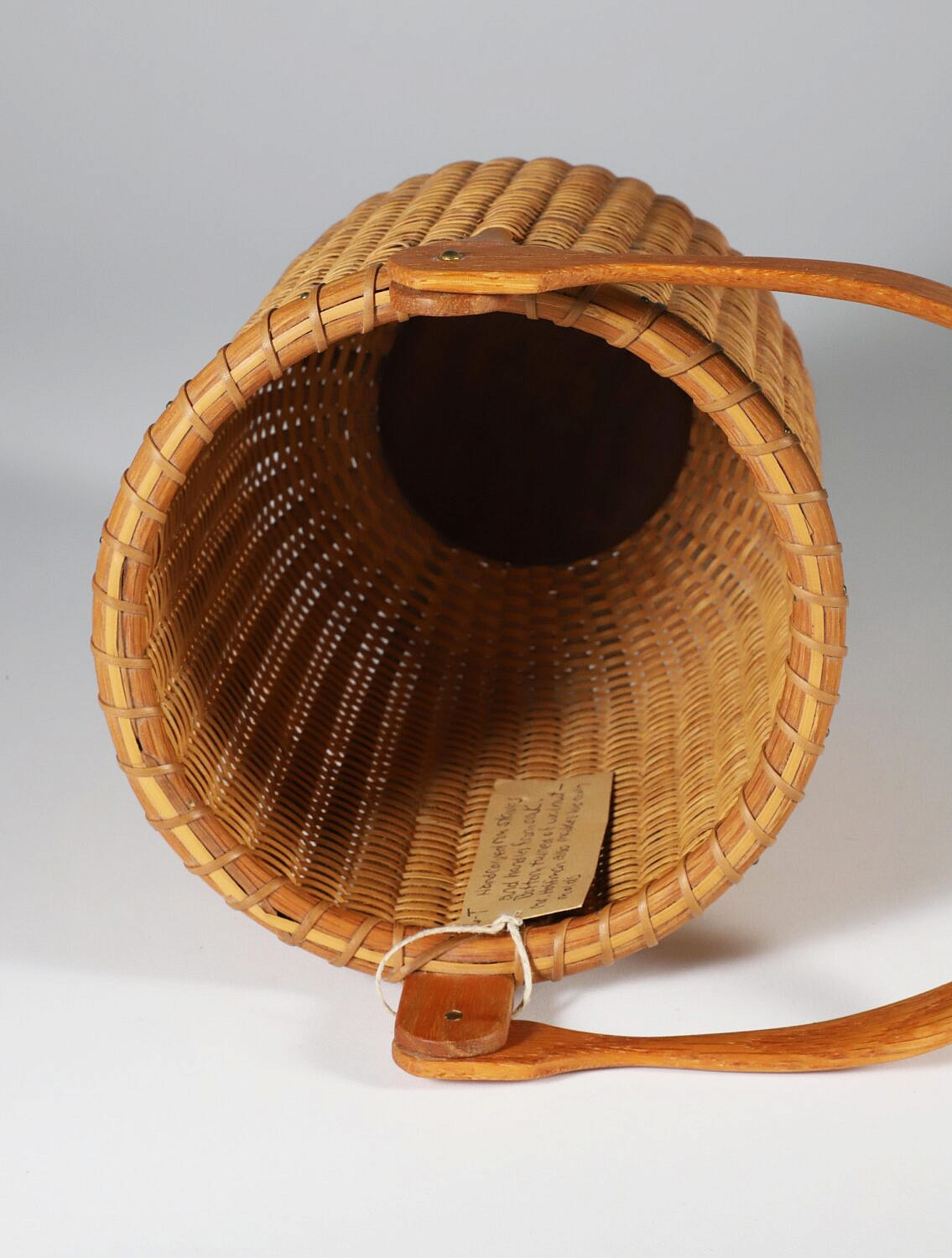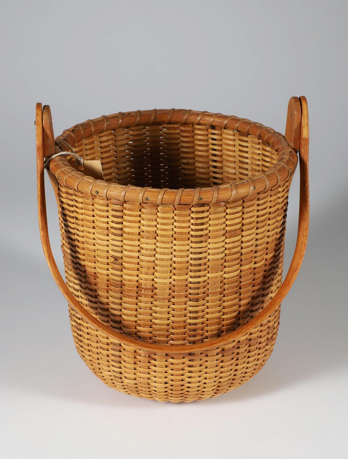 Harold Hoffman Swing Handle Nantucket Basket, circa 1997, deep form with oak handle, walnut base, engraved base H. E. H., Harold Hoffman #7- 97