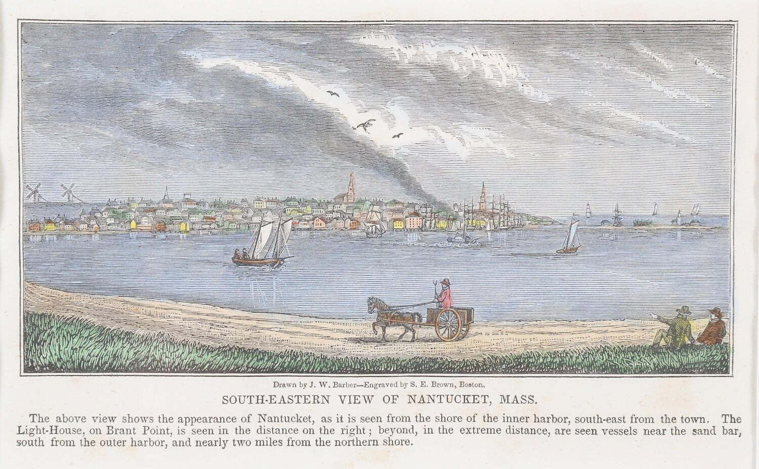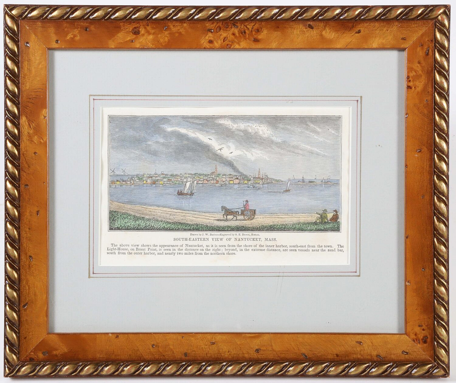 J.W. Barber Hand Colored Engraving “Southeastern View of Nantucket, Massachusetts”, in burl walnut frame with rope border