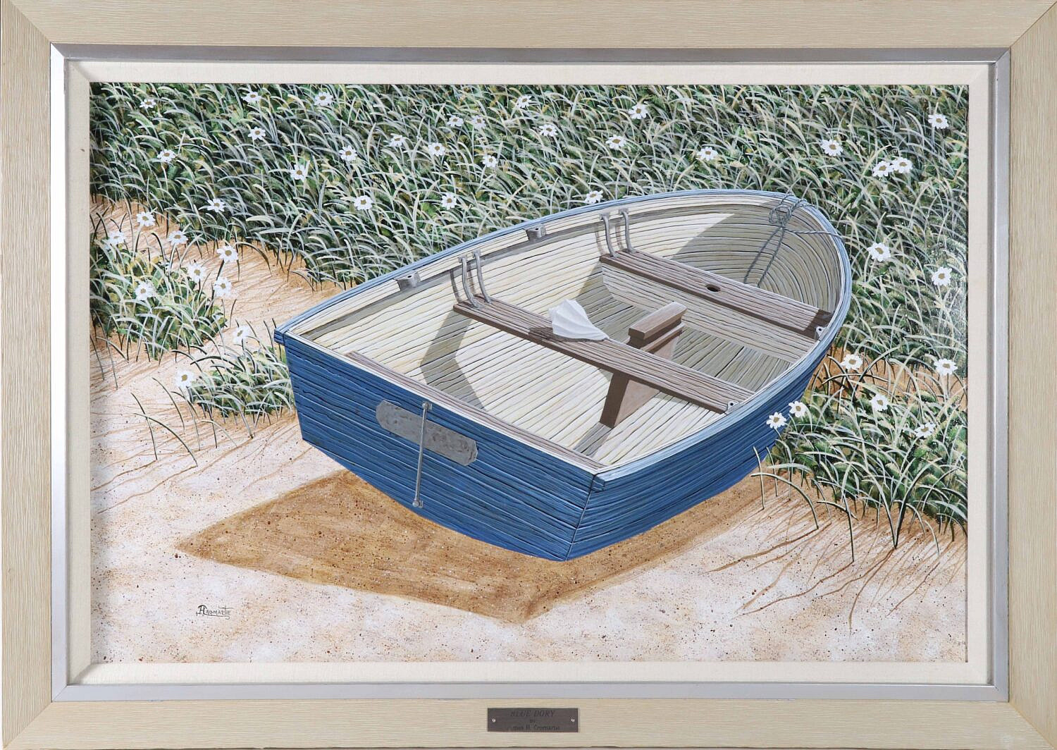 James H. Cromartie (b. 1944) Acrylic On Board “Blue Dory”, signed lower left JH Cromartie, in blonde wood frame with linen liner