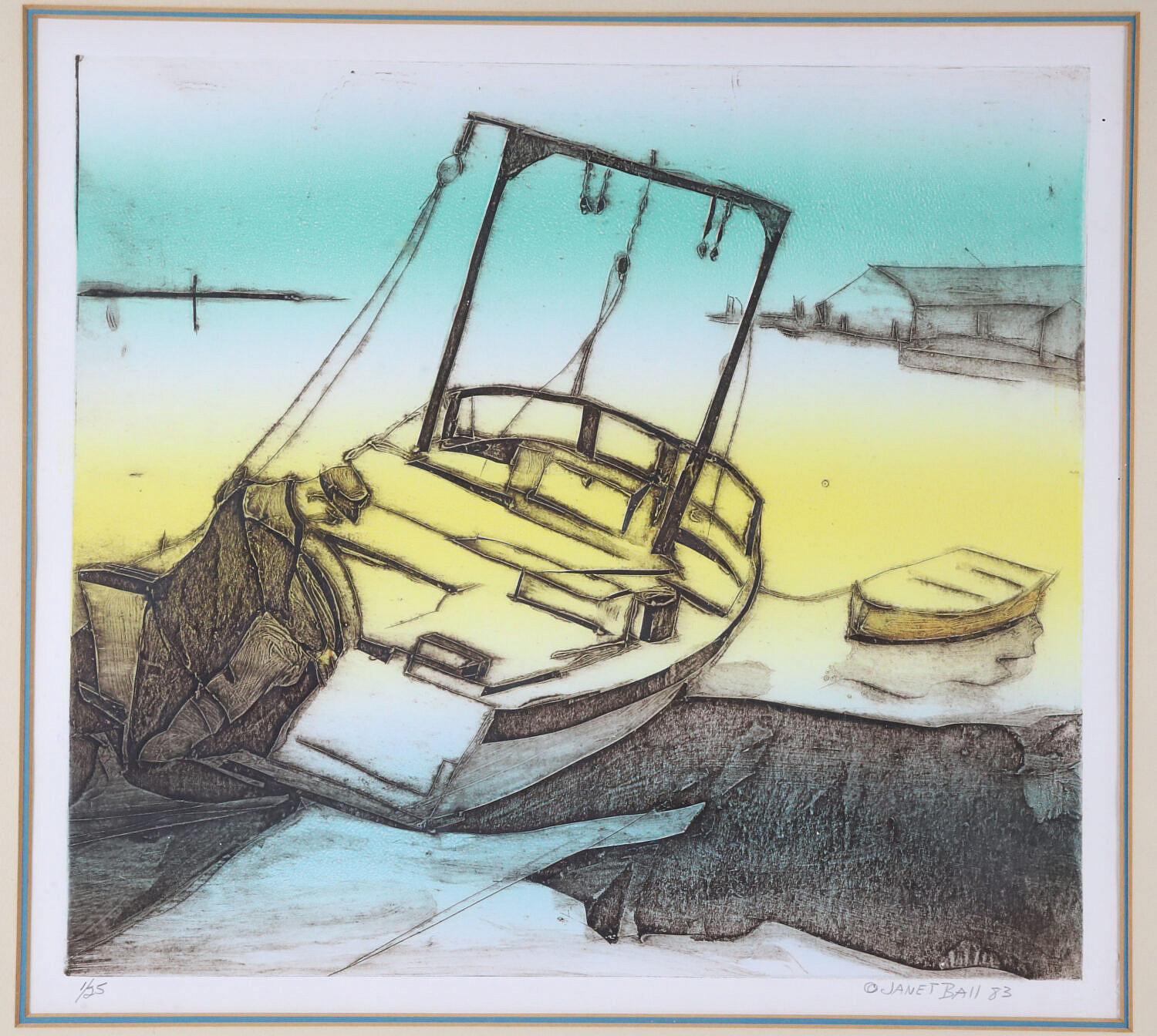 Janet Ball Limited Edition Lithograph “Fishing Boat, 83”, 20th Century, signed in pencil lower right, edition #1/25, matted and framed