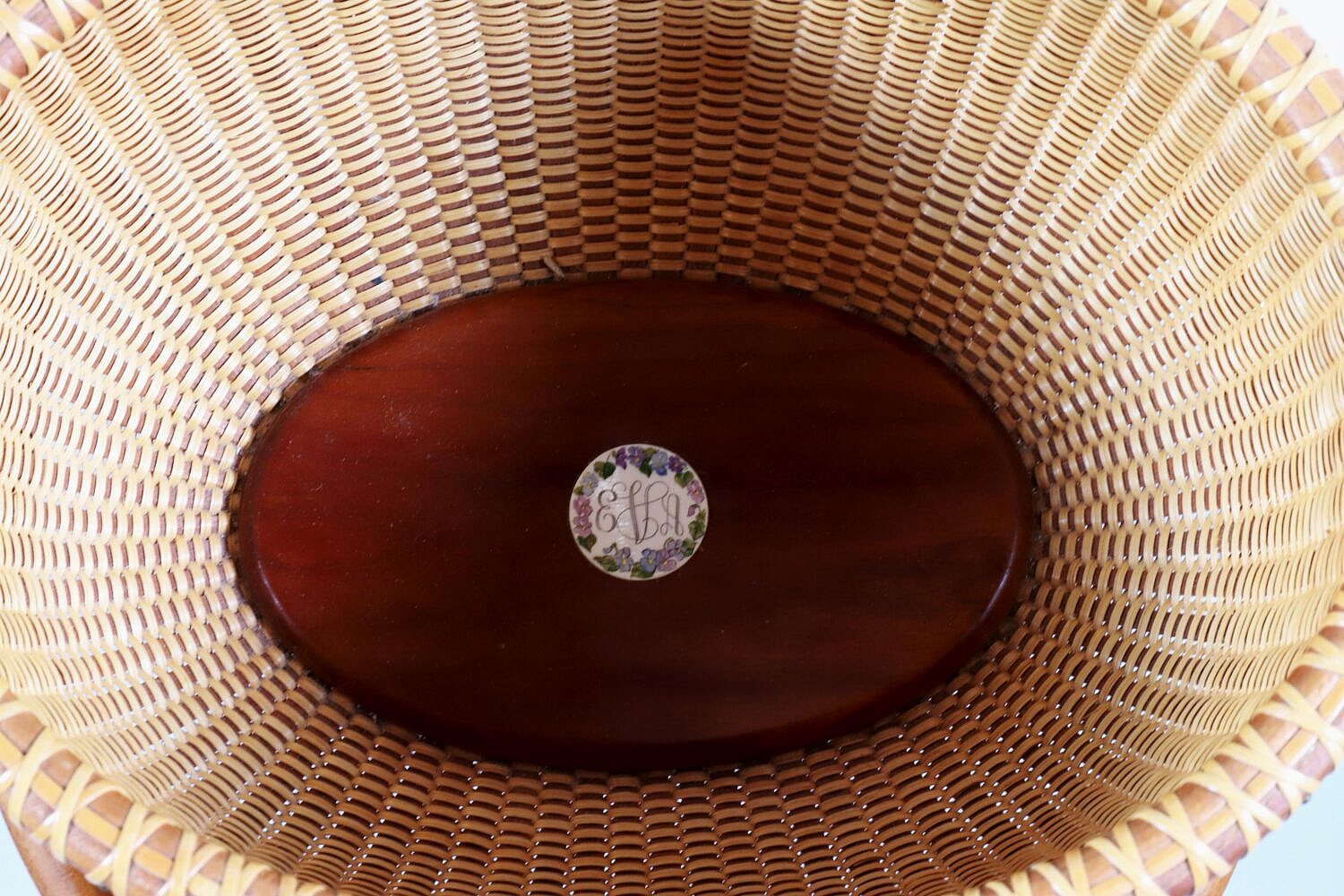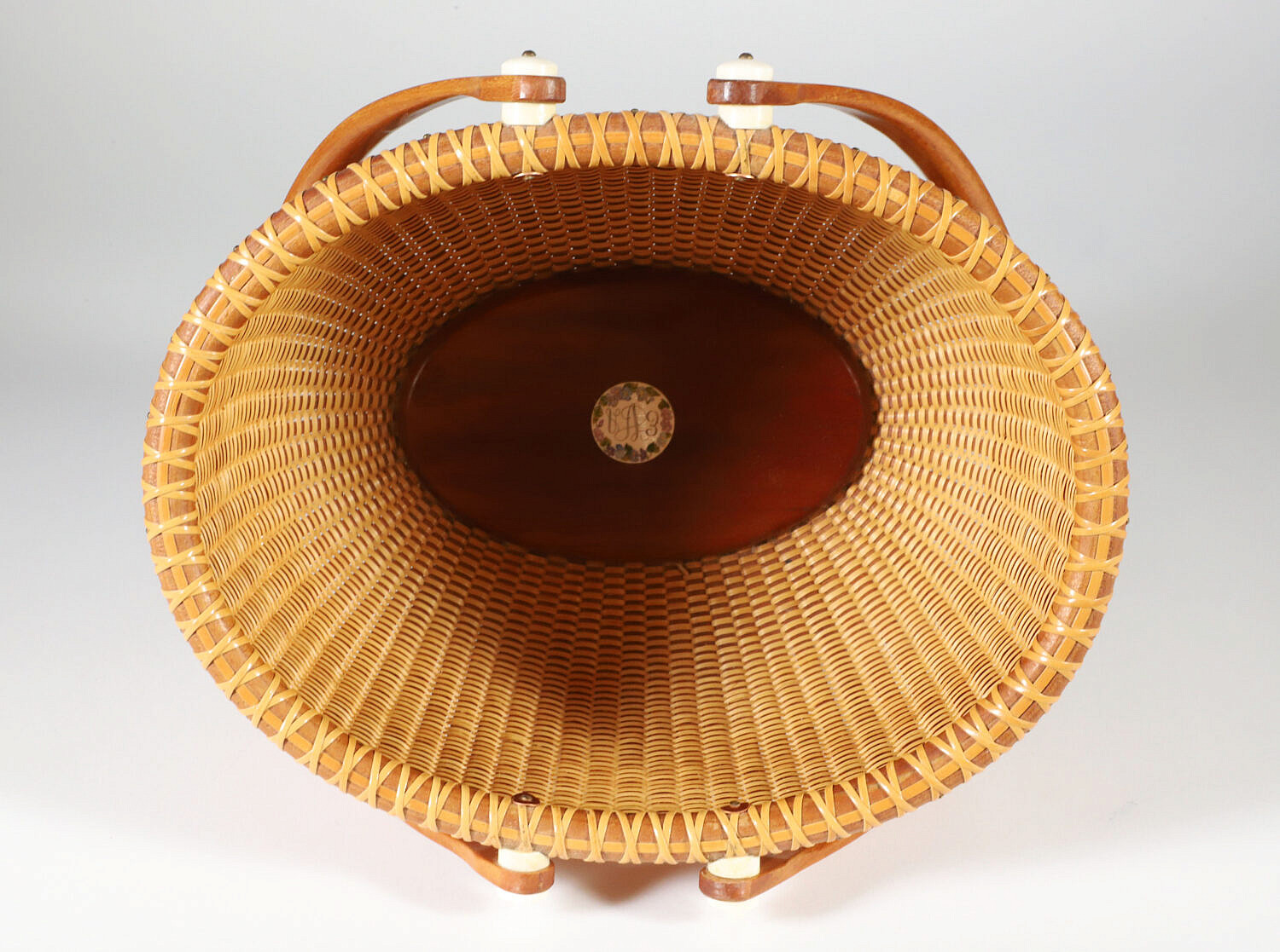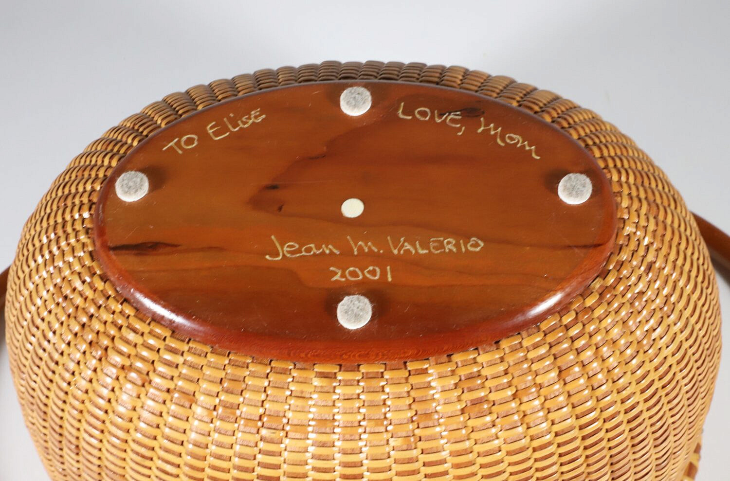 Jean M. Valerio Woven Double Swing Handle Oval Open Nantucket Basket circa 2001, inscribed on base: To Elise, Love, Mom, Jean M Valerio, 2001