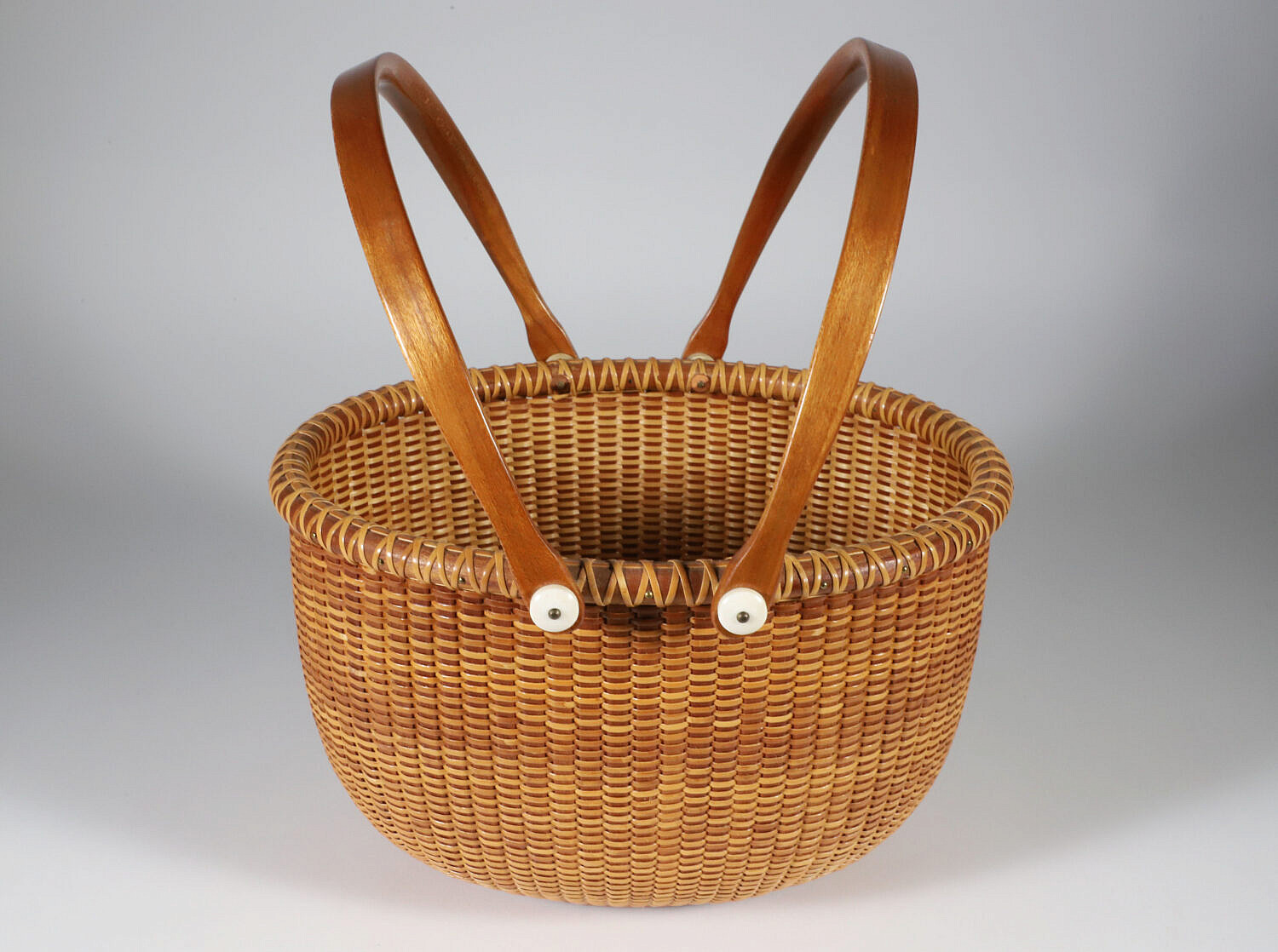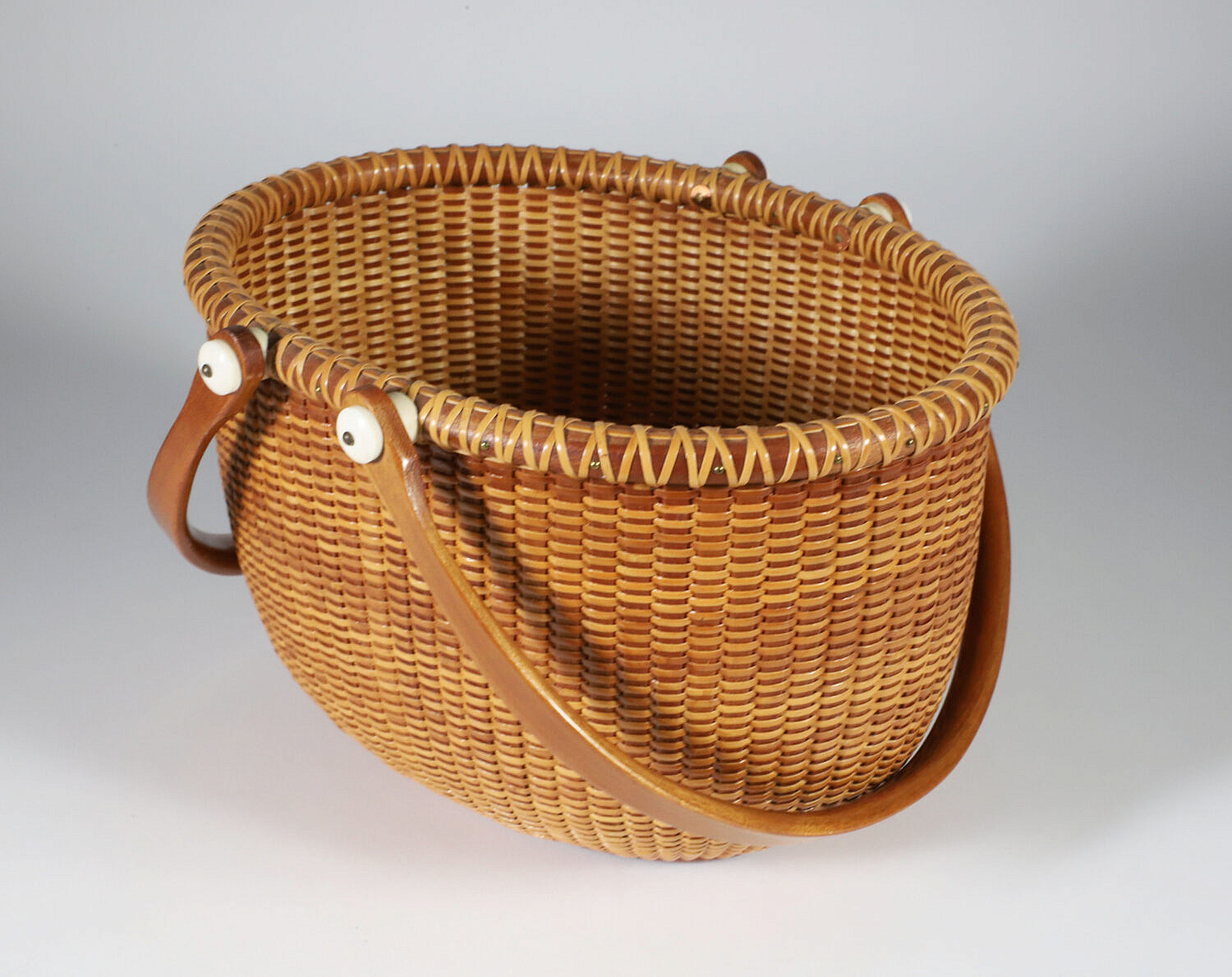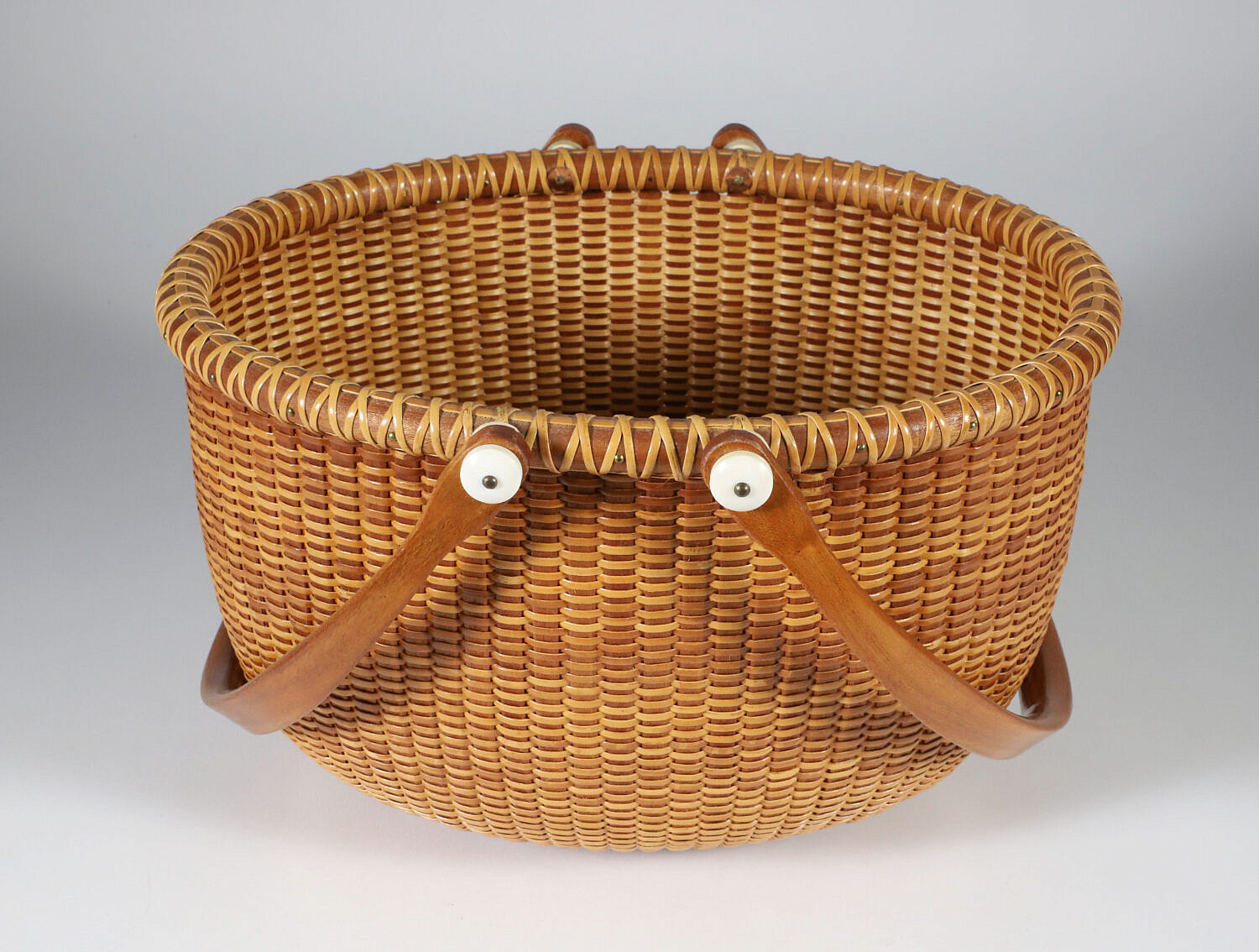 Jean M. Valerio Woven Double Swing Handle Oval Open Nantucket Basket circa 2001, inscribed on base: To Elise, Love, Mom, Jean M Valerio, 2001
